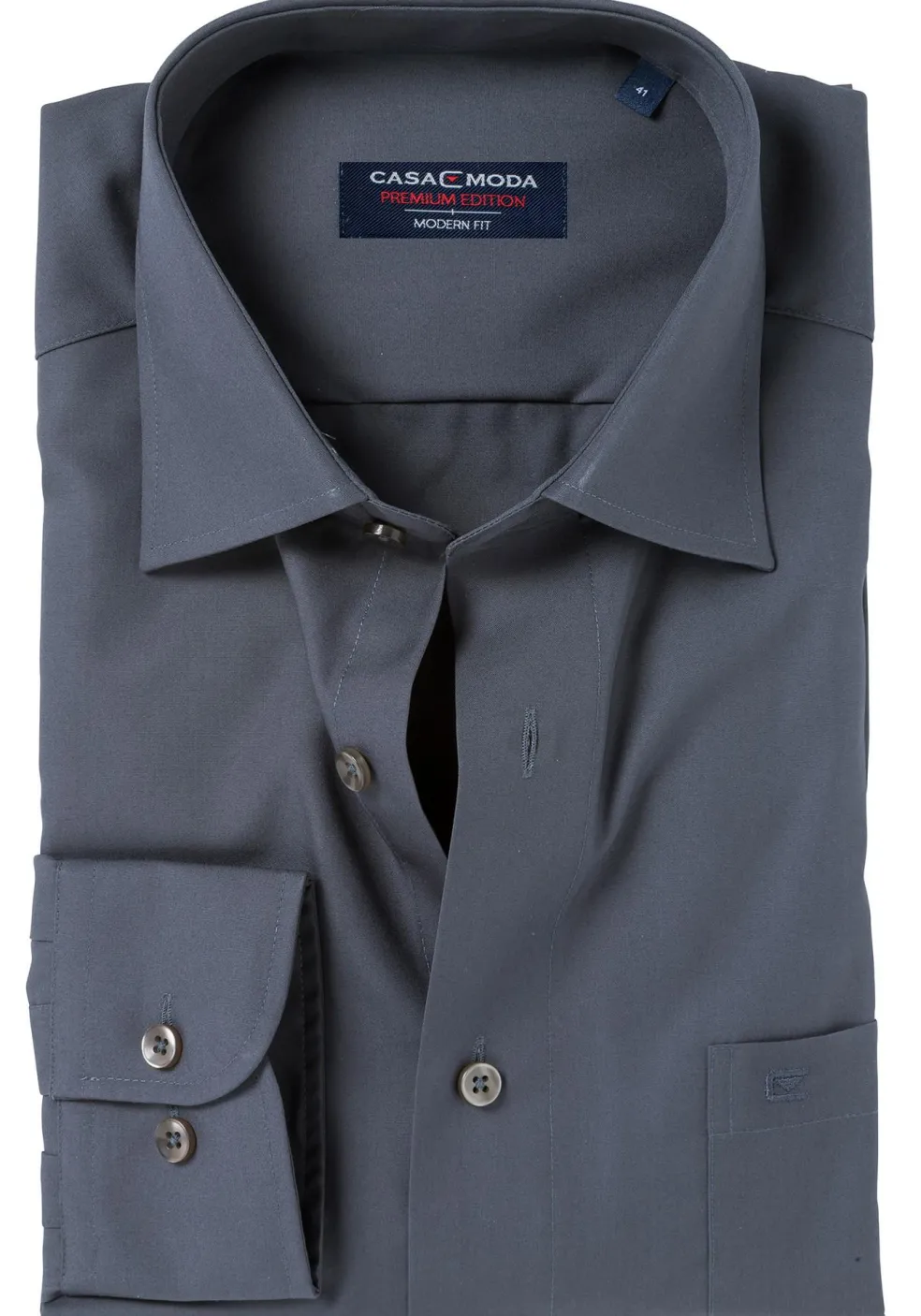 Antraciet grijs modern getailleerd CASA MODA modern fit overhemd. Dit strijkvrije Casa Moda overhemd is licht getailleerd, heeft lange mouwen en is gemaakt van 100% katoen. Een blouse die zich makkelijk laat combineren door de tijdloze grijze kleur en heerlijk draagt. De stof is huidvriendelijk en door de speciale behandeling geur- en vochtabsorberend en strijkvrij. Een shirt met een Kent kraag, borstzak met subtiel logo borduursel en verstelbare manchetten.