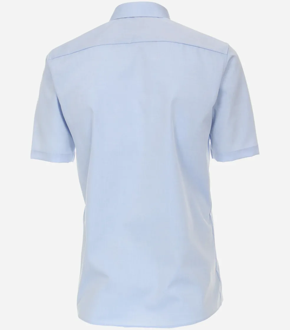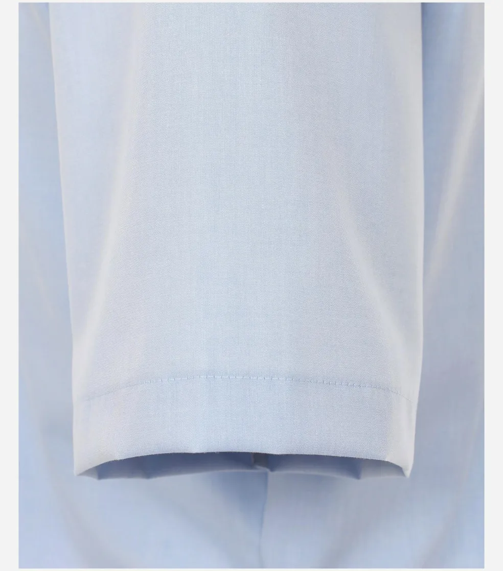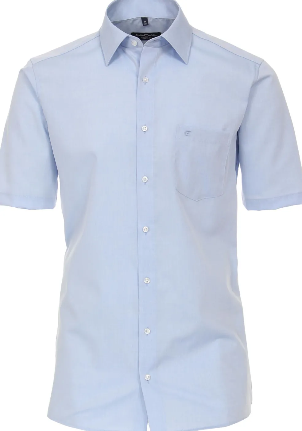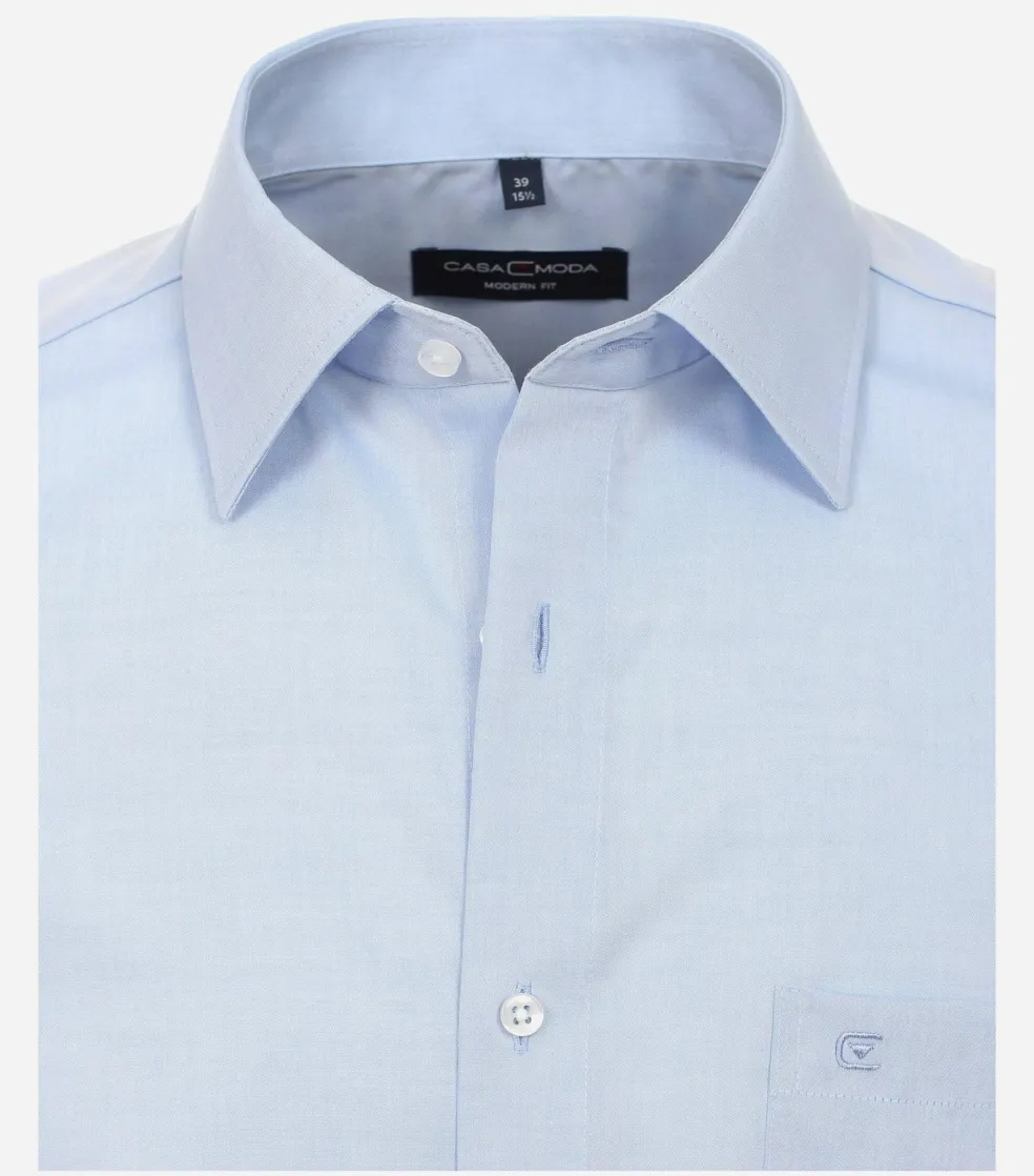 Modern getailleerd modern fit overhemd in een pasvorm die veel mannen past, het is niet heel wijd en niet heel strak. Dit heren overhemd van CASA MODA heeft korte mouwen. Heerlijk voor de warme dagen, maar ook fijn voor de mannen die gewoon graag een shirt met korte mouwen dragen. Door de uitvoering in een poplin weving is de stof glad, zacht, soepel en egaal. Dit is een van de meest gebruikte wevingen voor overhemden. Het shirt heeft een normale Kent kraag waarbij de boordpunten recht naar beneden wijzen en niet ver uit elkaar staan. Deze kraagvorm is ideaal om zo te dragen maar ook perfect te combineren met een stropdas. De easy iron kwaliteit van de stof zorgt ervoor dat het slechts licht gestreken hoeft te worden voor een prachtig glad resultaat. De handige borstzak op de linkerborst heeft een subtiel geborduurd logo.