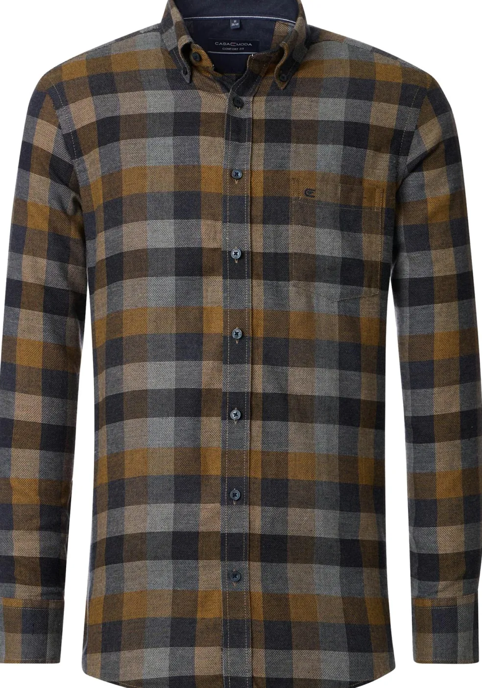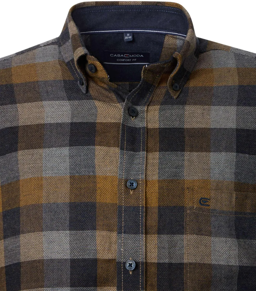 Ruim gesneden casual comfort fit overhemd met optimale bewegingsvrijheid. Dit heren overhemd van CASA MODA heeft lange mouwen in een standaard mouwlengte. Door de uitvoering in een dobby weving zijn kleine geometrische patronen zichtbaar voor extra textuur in de stof. Het shirt heeft een sportieve button-down kraag die meestal zonder stropdas gedragen wordt. Door de knoopjes in de boordpunten waarmee de punten van de kraag vastgezet kunnen worden aan het hemd, blijft de kraag mooi zitten. De easy iron kwaliteit van de stof zorgt ervoor dat het slechts licht gestreken hoeft te worden voor een prachtig glad resultaat. De handige borstzak op de linkerborst heeft een subtiel geborduurd logo.