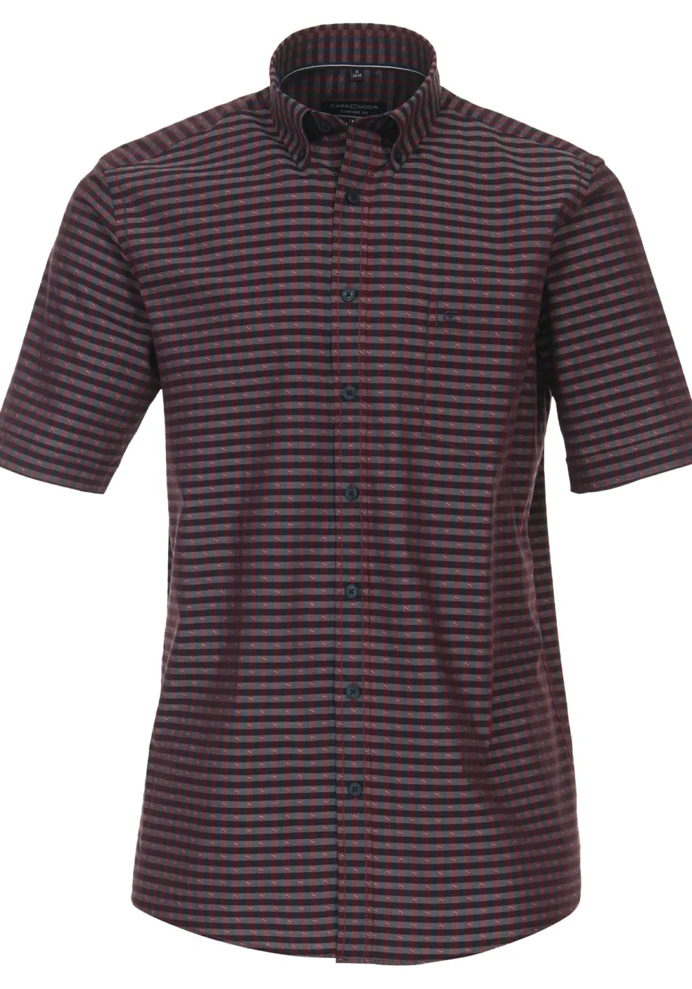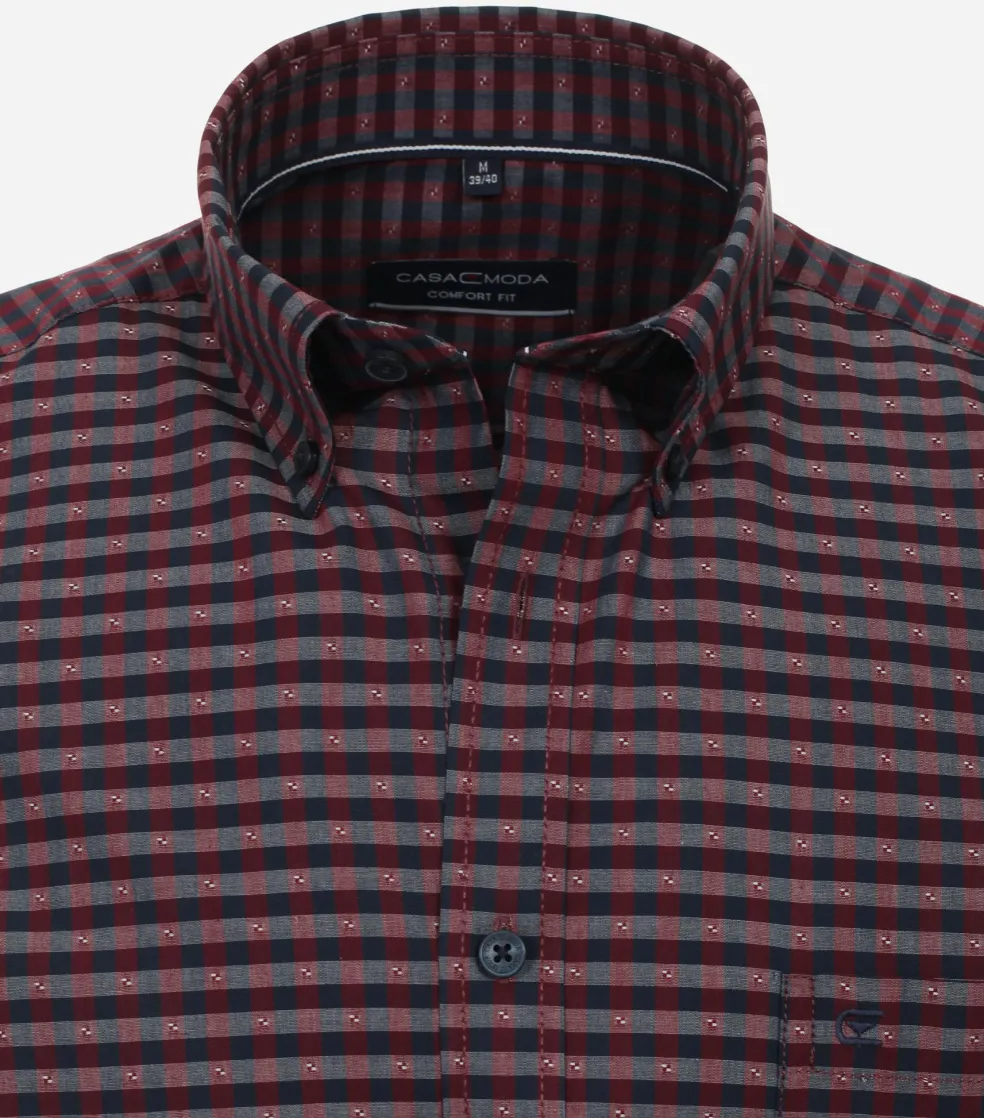 Ruim gesneden casual comfort fit overhemd met optimale bewegingsvrijheid. Dit heren overhemd van CASA MODA heeft korte mouwen. Heerlijk voor de warme dagen, maar ook fijn voor de mannen die gewoon graag een shirt met korte mouwen dragen. Door de uitvoering in een dobby weving zijn kleine geometrische patronen zichtbaar voor extra textuur in de stof. Het shirt heeft een sportieve button-down kraag die meestal zonder stropdas gedragen wordt. Door de knoopjes in de boordpunten waarmee de punten van de kraag vastgezet kunnen worden aan het hemd, blijft de kraag mooi zitten. De easy iron kwaliteit van de stof zorgt ervoor dat het slechts licht gestreken hoeft te worden voor een prachtig glad resultaat. De handige borstzak op de linkerborst heeft een subtiel geborduurd logo.