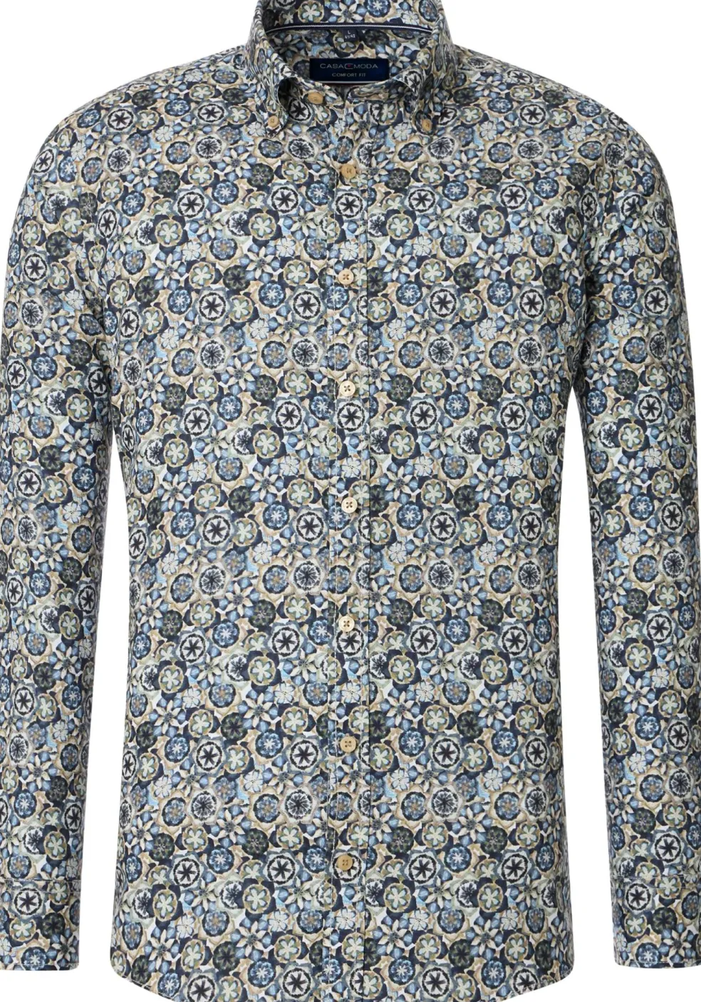 Ruim gesneden casual comfort fit overhemd met optimale bewegingsvrijheid. Dit heren overhemd van CASA MODA heeft lange mouwen in een standaard mouwlengte. Door de uitvoering in een twill of keper weving is de stof dicht en sterk. Twill is eenvoudig te herkennen aan het diagonale weefpatroon, wat ervoor zorgt dat de draden heel dicht op elkaar zitten en dus minder licht doorlaten. Daardoor is de stof minder doorschijnend dan bijvoorbeeld een poplin weving. Het shirt heeft een normale Kent kraag waarbij de boordpunten recht naar beneden wijzen en niet ver uit elkaar staan. Deze kraagvorm is ideaal om zo te dragen maar ook perfect te combineren met een stropdas. De easy iron kwaliteit van de stof zorgt ervoor dat het slechts licht gestreken hoeft te worden voor een prachtig glad resultaat. Voor een moderne uitstraling ontbreekt de borstzak bij dit shirt.