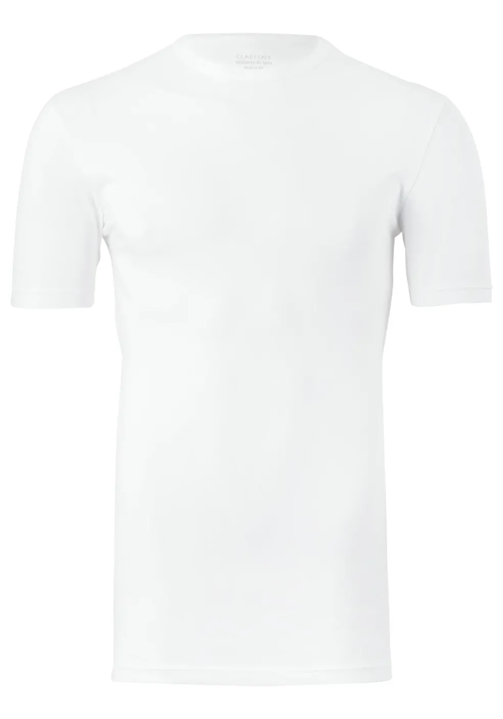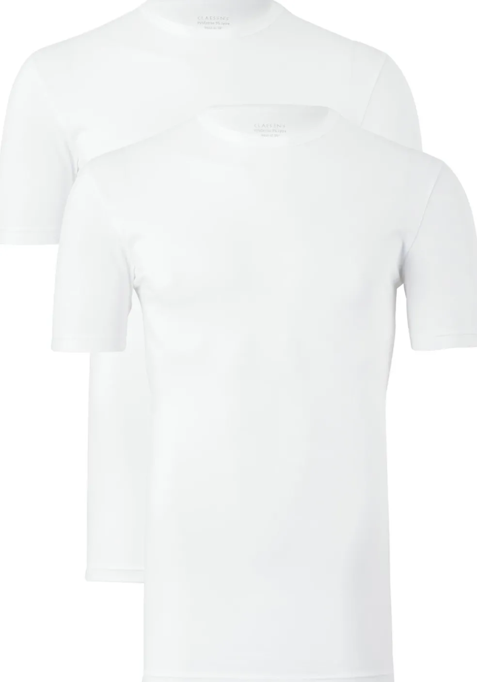 Twee witte zachte, stevig aanvoelende t-shirts van het Nederlandse kwaliteitsmerk Claesen’s. De t-shirts hebben een hoge ronde hals die is afgewerkt met een bies van 1,5 centimeter. Op de rug, 5 centimeter onder de halsboord is het Claesen’s logo in het grijs opgedrukt. Door het gebruik van katoen met lycra dragen deze onderhemdjes niet alleen heerlijk, want ze zijn zacht, ademend en vochtabsorberend, maar ze sluiten ook nog eens mooi aan om het lichaam en behouden hun model, ook na vele keren wassen. Perfect basis duo voor heren die graag een hoog gesloten t-shirt dragen met een smalle boord dat mooi aansluitend draagt.