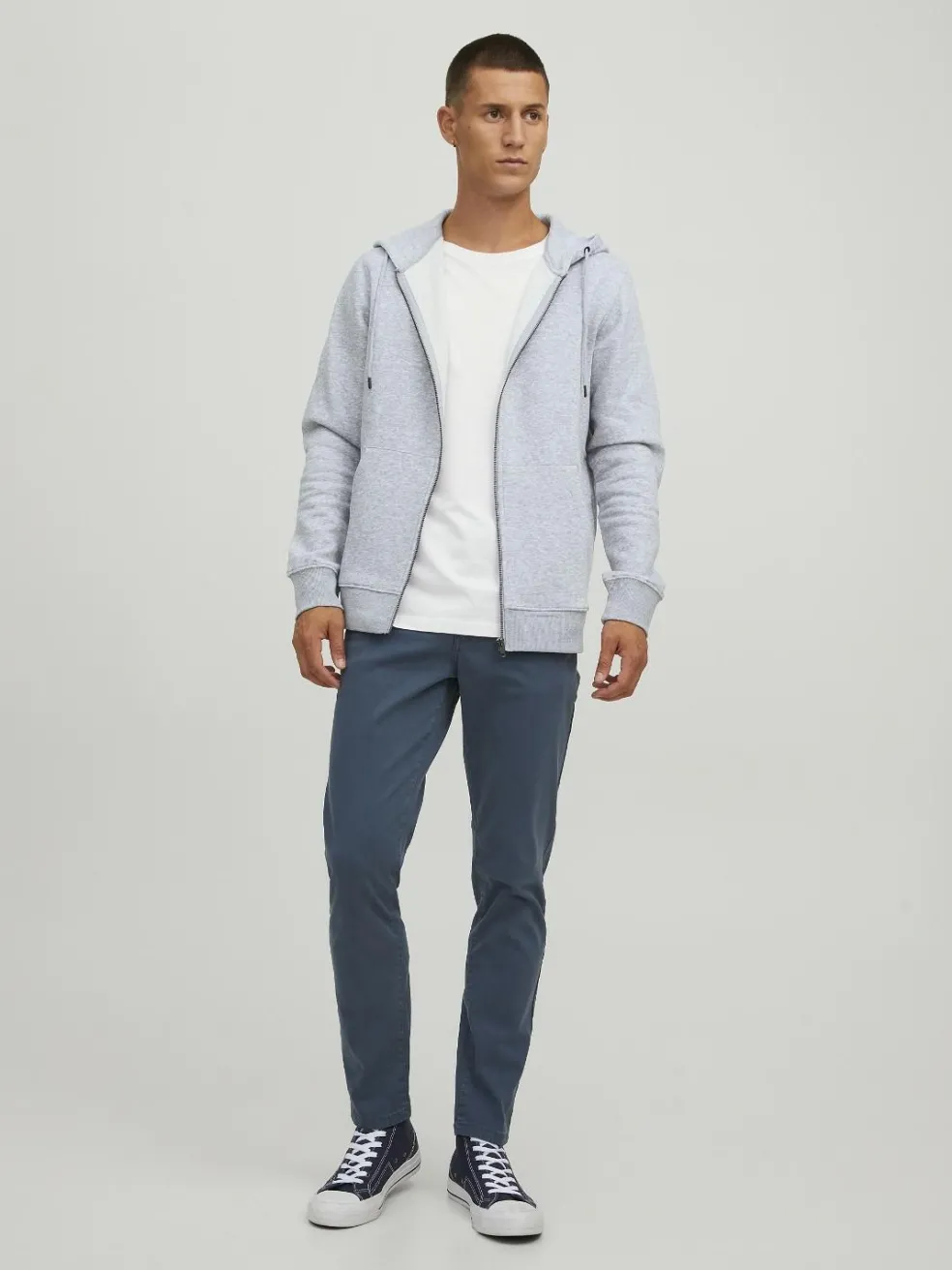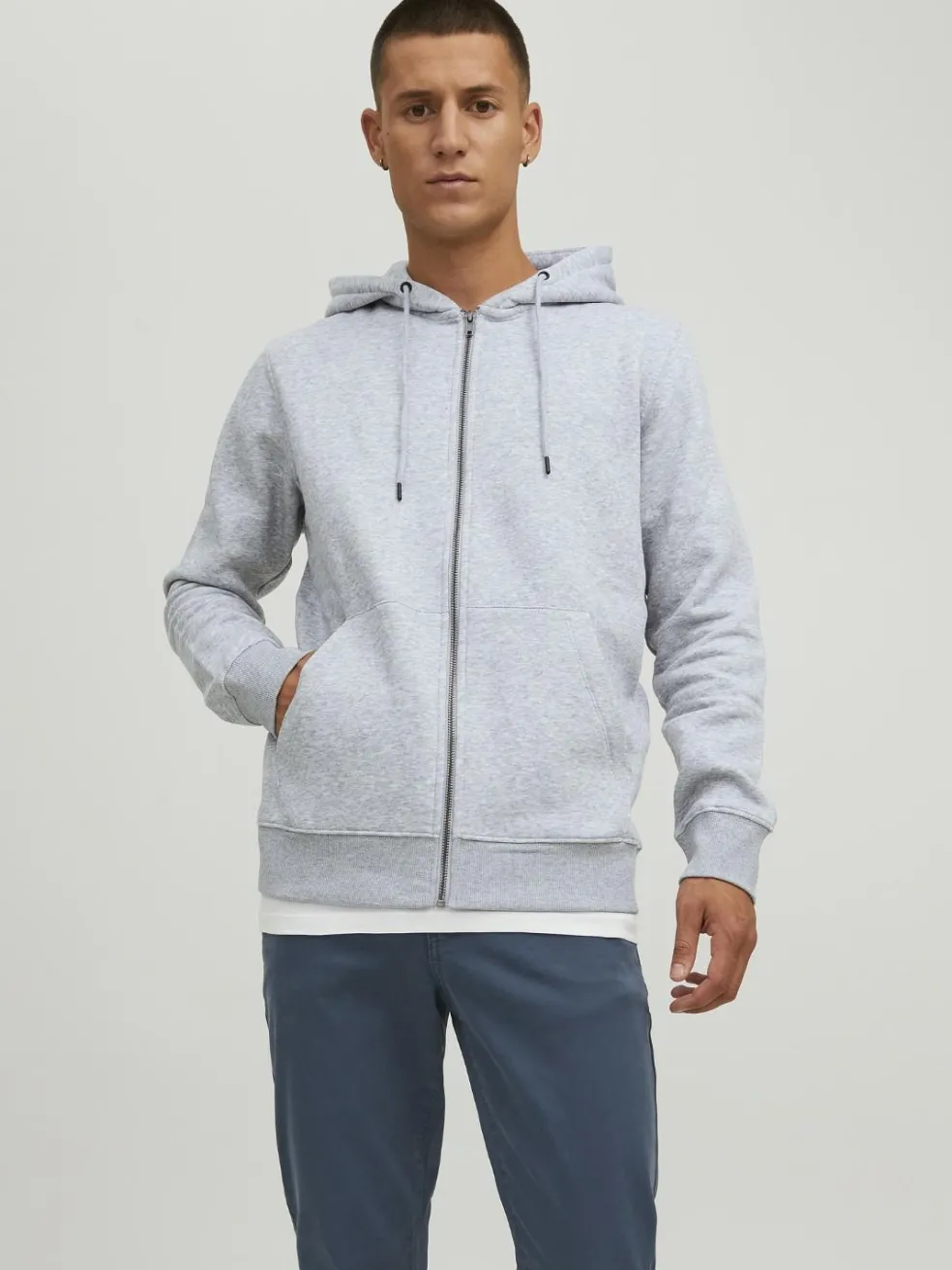 Sweatvest hoodie van JACK & JONES in het lichtgrijs melange. Een comfortabele hoodie met een fijne capuchon. Uitgevoerd in een sweatstof voor heerlijk draagcomfort, gemaakt van katoen in een prettige mix. Model wat open of dicht gedragen kan worden door de handige rits.