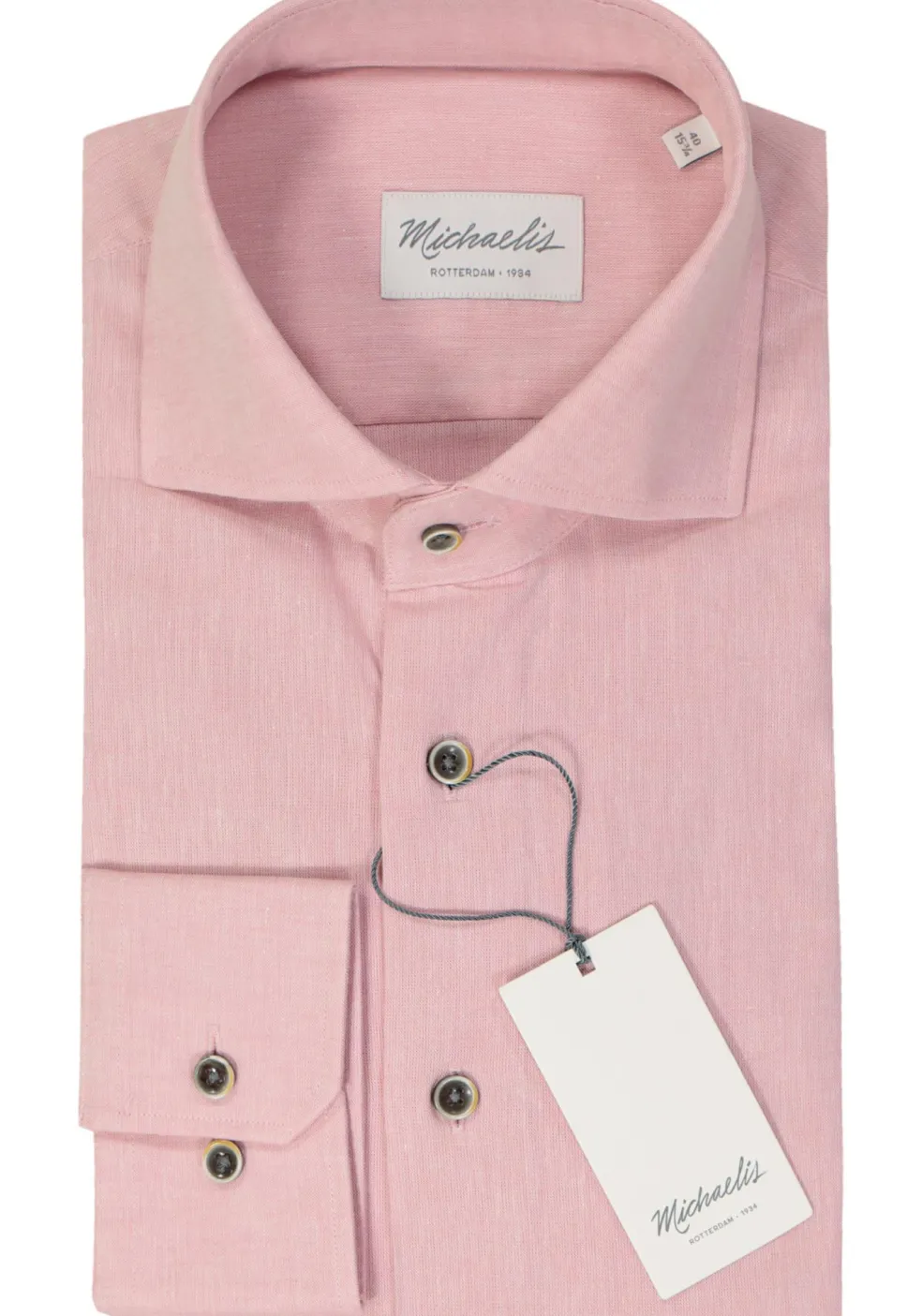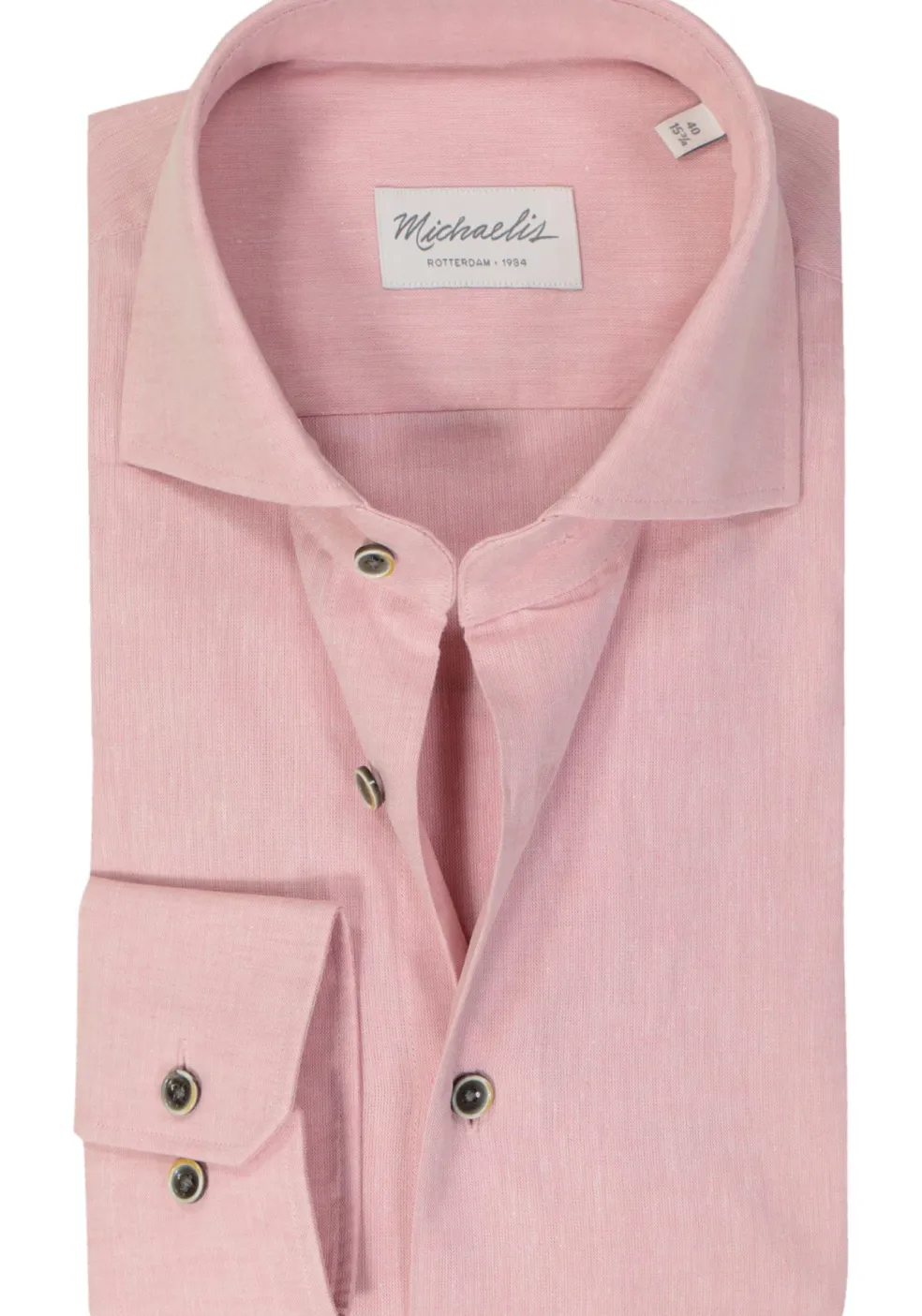 Ideaal overhemd voor de slanke jonge man die van getailleerde overhemden houdt. Dit heren overhemd van Michaelis heeft lange mouwen in een standaard mouwlengte. Het shirt heeft een moderne haifisch kraag waarbij de boordpunten wijd uit elkaar staan. Deze kraag is daarmee ideaal voor een breed geknoopte stropdas of om juist zonder stropdas te dragen. Door de uitvoering in een poplin weving is de stof glad, zacht, soepel en egaal. Dit is een van de meest gebruikte wevingen voor overhemden. De easy iron kwaliteit van de stof zorgt ervoor dat het slechts licht gestreken hoeft te worden voor een prachtig glad resultaat. Dit shirt heeft geen borstzak. Bij Michaelis zijn de even boordmaten minder getailleerd dan de oneven maten. In de maattabel tab bij dit artikel vind je de precieze afmetingen per boordmaat.