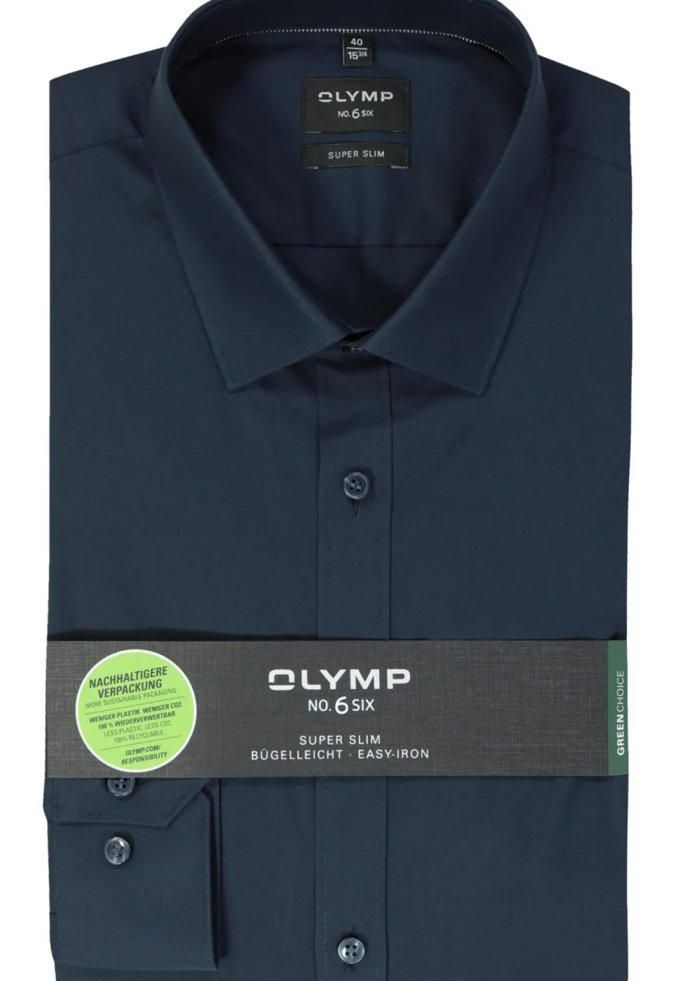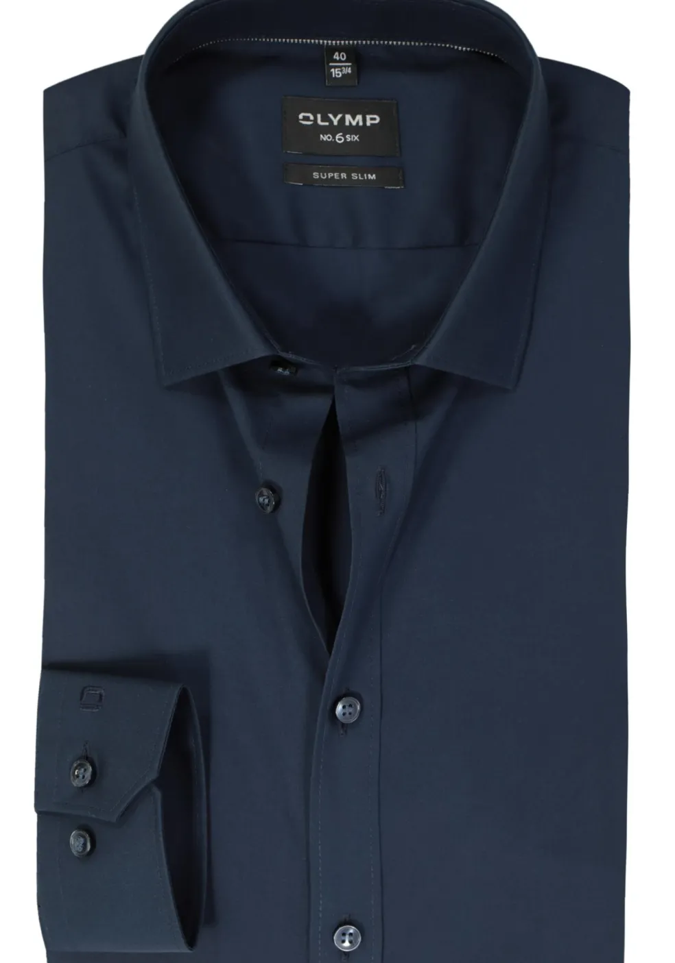 OLYMP No. Six super slim fit overhemd met lange mouwen. Navy blauw stijlvol overhemd voor de echt slanke mannen in de zeer sterk getailleerde, No. 6 Six super slim fit pasvorm. Nog strakker dan de Level 5 overhemden van Olymp, dus dit hemd is echt alleen geschikt voor zeer slanke mannen. Gemaakt van katoen met een elastaan wat zorgt voor een heerlijke stretch. Modisch shirt met Italiaanse knopen, taillering, Urban Kent kraag, logo op linker manchet en zonder borstzak. Strijkvriendelijk (extra easy care) dus hoeft bijna niet gestreken te worden.