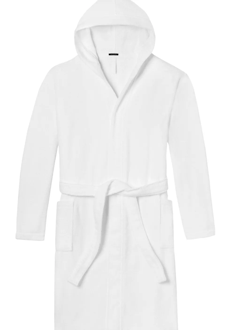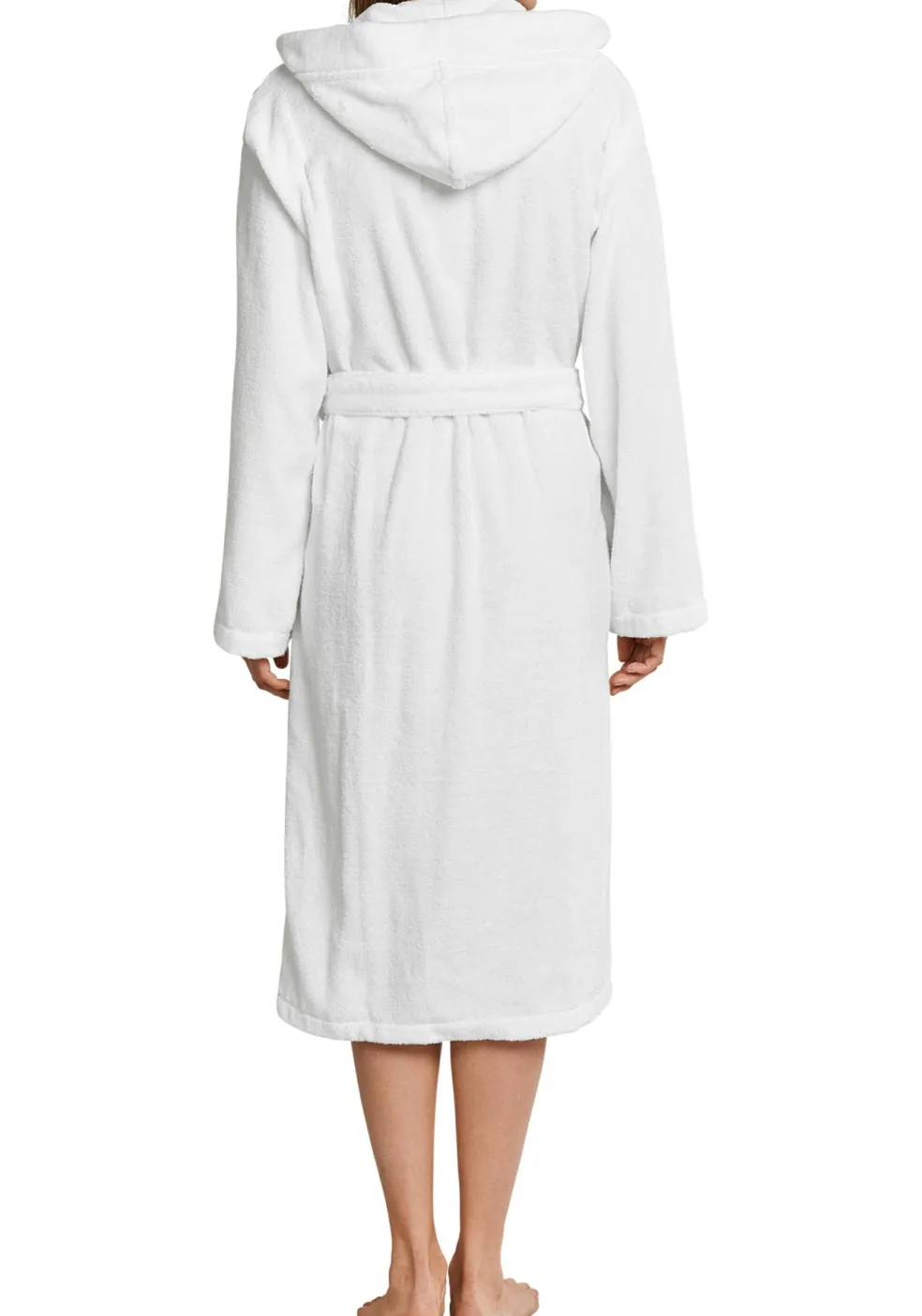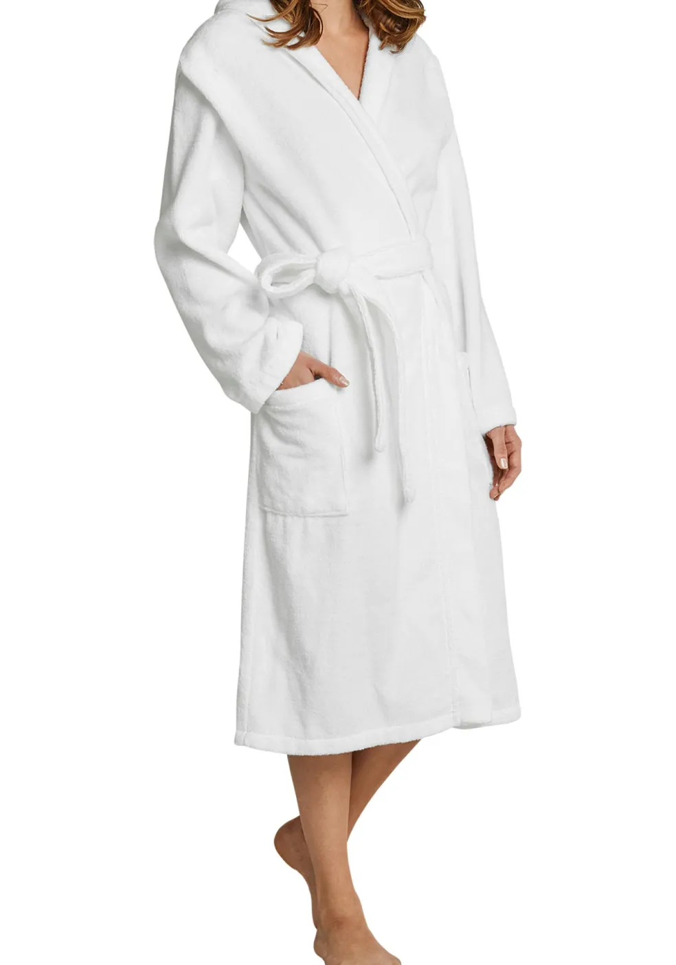 Comfortabele witte SCHIESSER dames badjas van 100% katoen met twee grote zakken, ceintuur en een capuchon. De lengte van de badjas is 120cm. Deze badjas is gemaakt van vocht opnemende badstof en daarmee zeer geschikt voor na het douchen of een heerlijk warm bad. Heerlijke badjas om even lekker in te ontspannen en is ook geschikt om u mee af te drogen. Ook zeer geschikt om mee te nemen naar de sauna. Comfortabele badjas van een heerlijke zachte, volle badstof, echt een jas om heerlijk in te ontspannen.