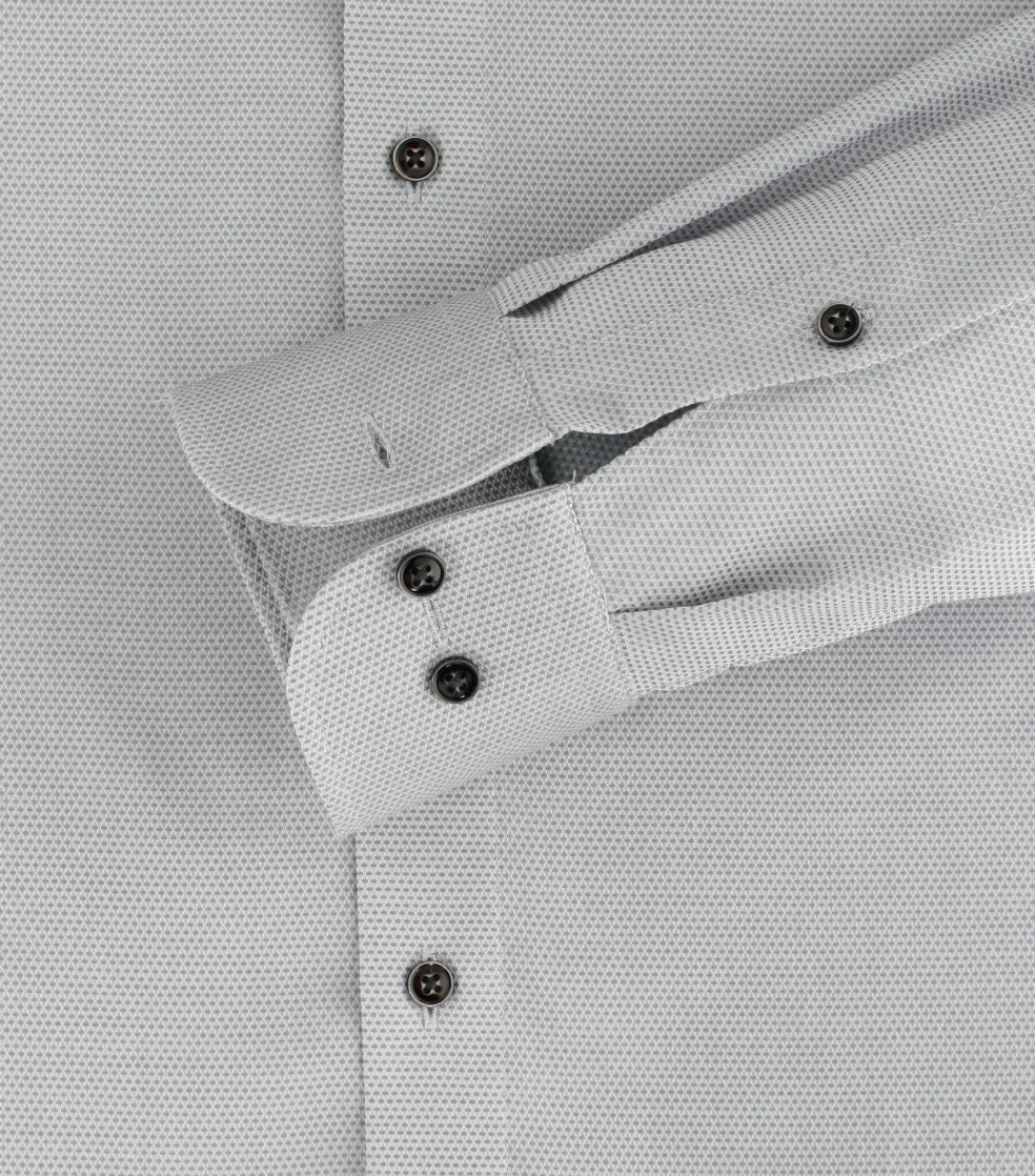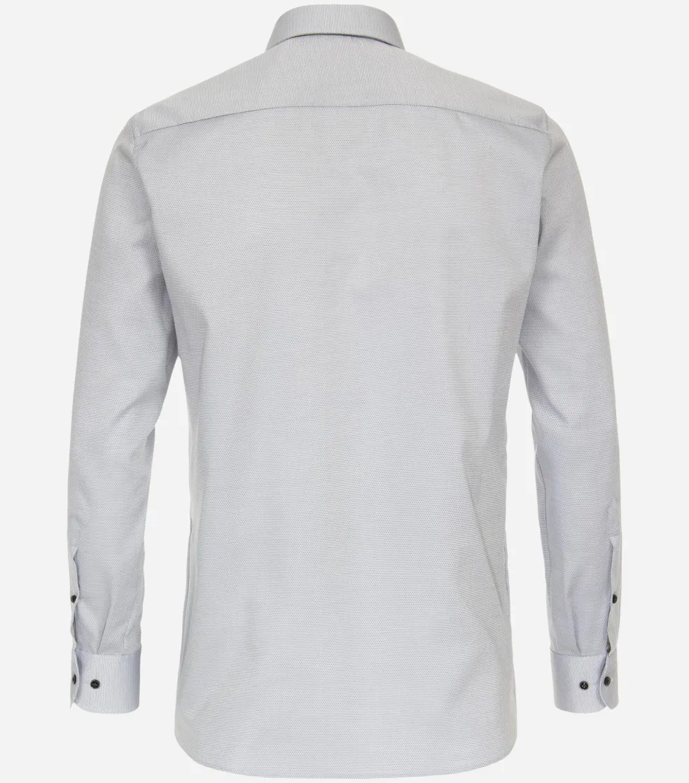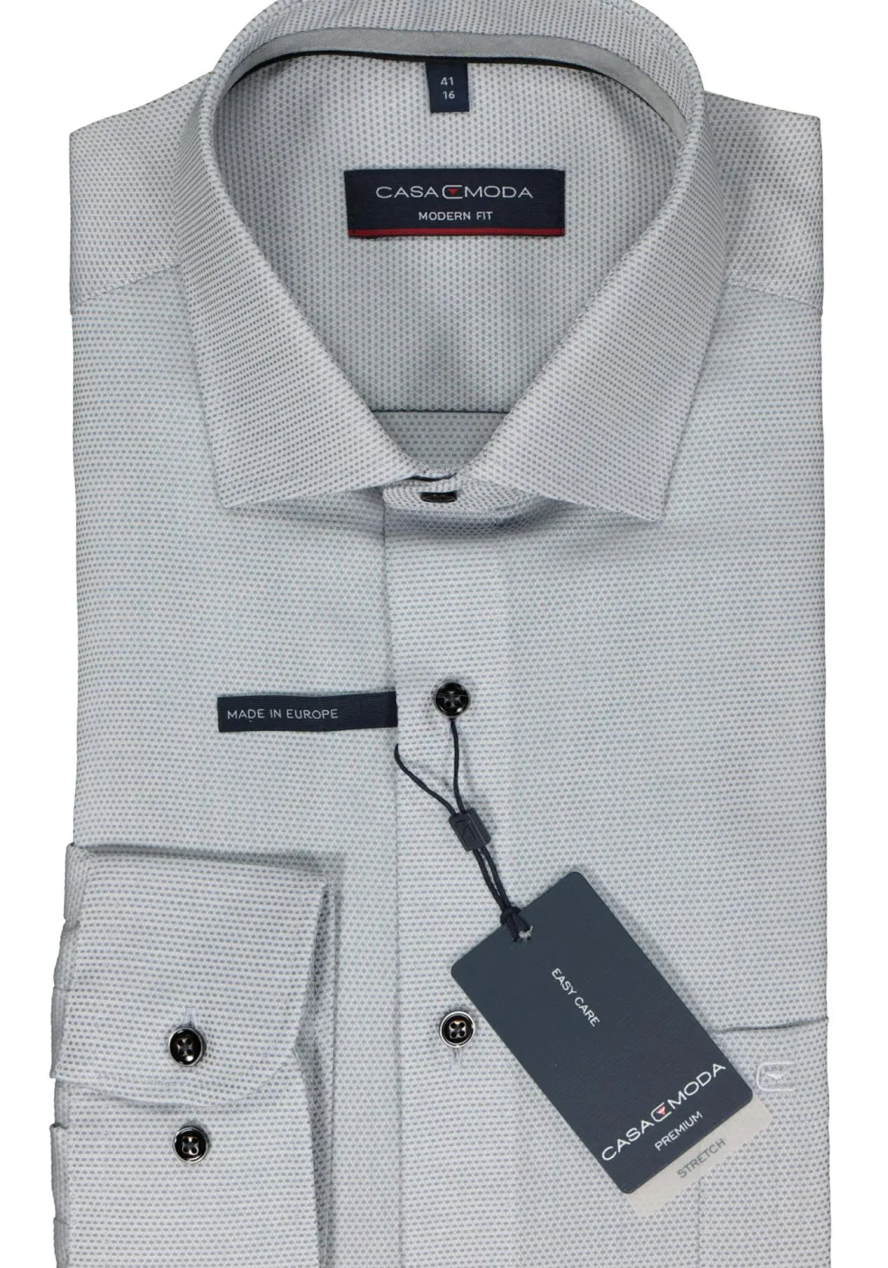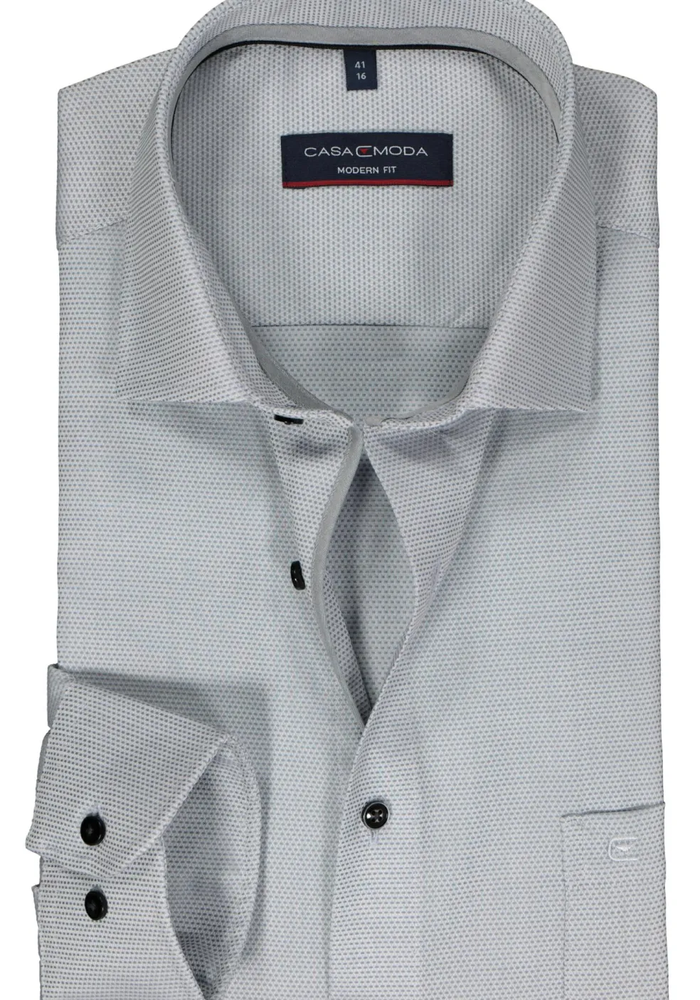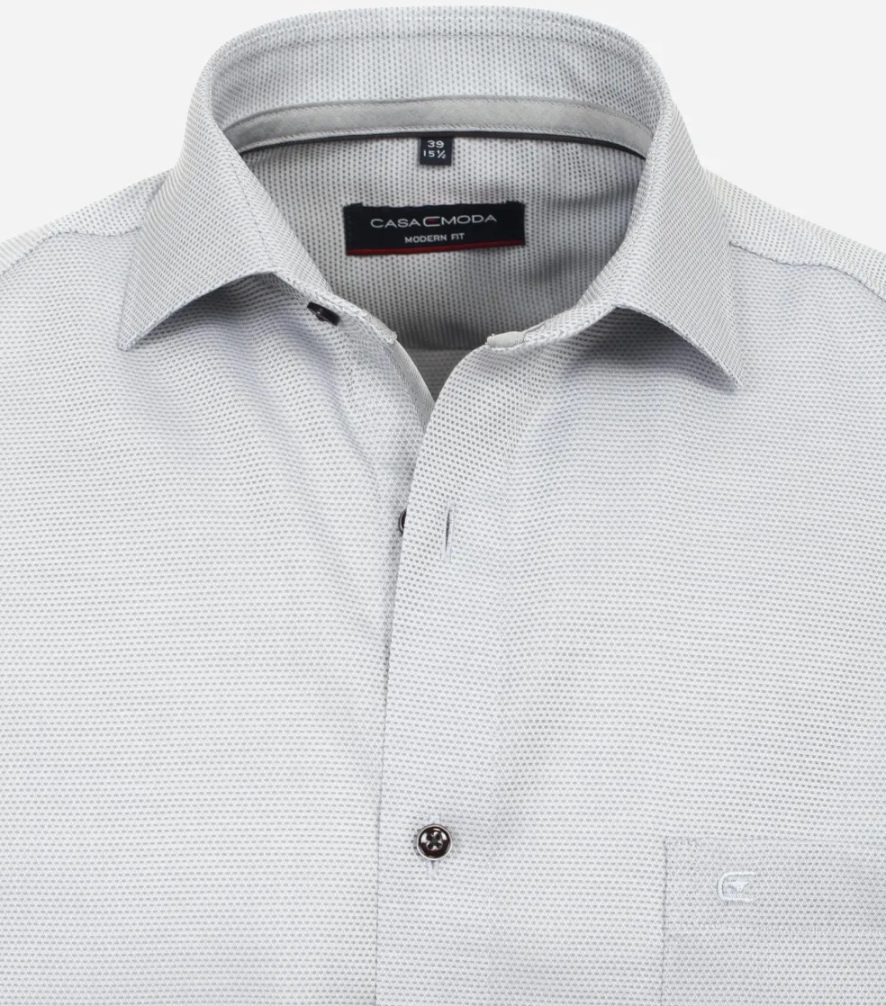 Modern getailleerd modern fit overhemd in een pasvorm die veel mannen past, het is niet heel wijd en niet heel strak. Dit heren overhemd van CASA MODA heeft lange mouwen in een standaard mouwlengte. Door de uitvoering in een dobby weving zijn kleine geometrische patronen zichtbaar voor extra textuur in de stof. Het shirt heeft een normale Kent kraag waarbij de boordpunten recht naar beneden wijzen en niet ver uit elkaar staan. Deze kraagvorm is ideaal om zo te dragen maar ook perfect te combineren met een stropdas. Door de speciale behandeling van de stof is dit hemd strijkvrij. Ideaal omdat er geen kreukels in komen tijdens het dragen en ook na het wassen hoeft het shirt niet gestreken te worden. Eventuele kreukels lopen er door de eigen lichaamswarmte uit. De handige borstzak op de linkerborst heeft een subtiel geborduurd logo. Een business shirt wat zich eenvoudig laat combineren voor een stijlvolle uitstraling.