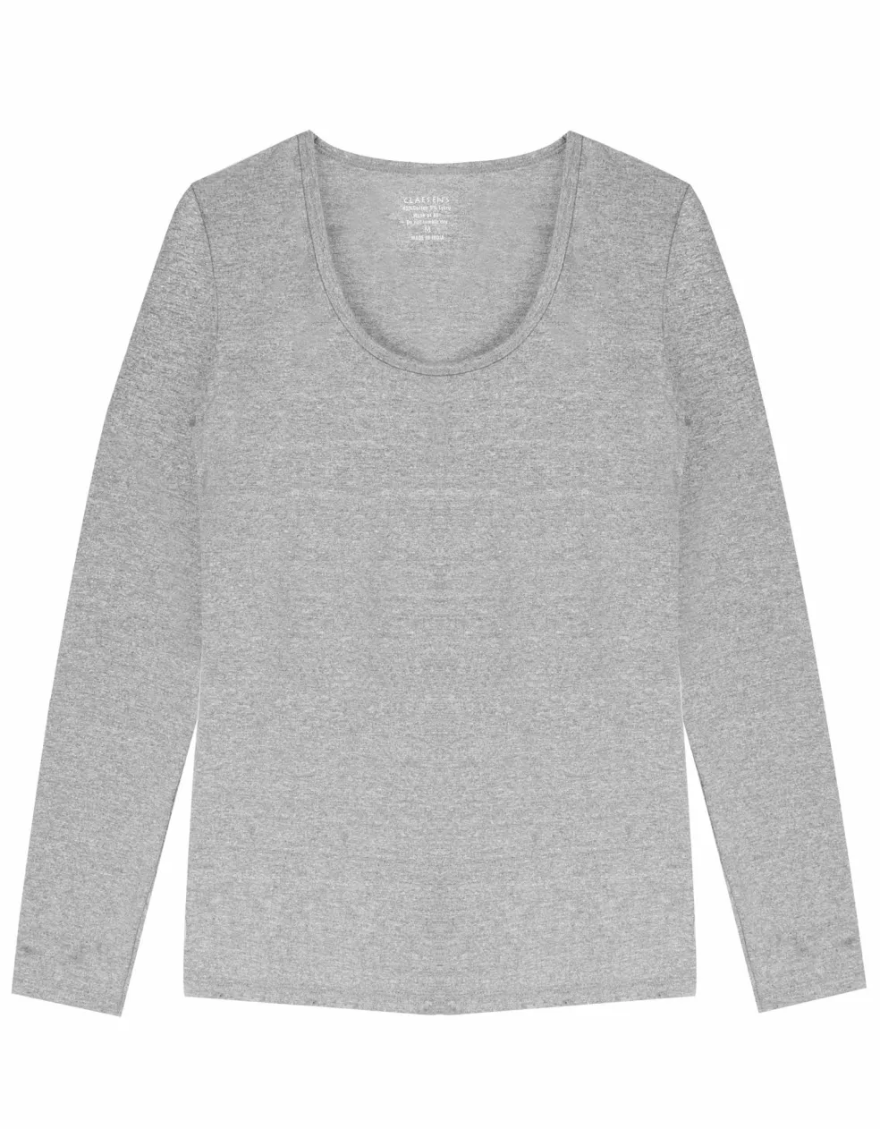 Dames T-shirt met ronde hals en lange mouwen in grijs melee. Het-T-shirt heeft een biesje langs de hals. Gemaakt van 95% katoen en 5% lycra.