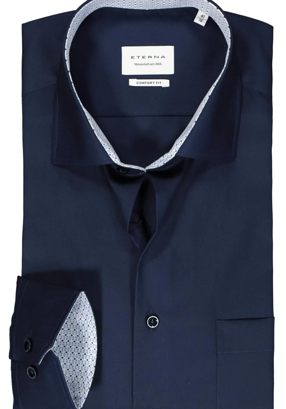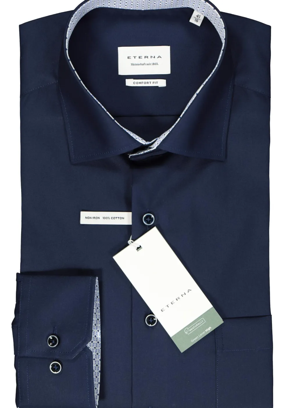 Comfort fit overhemd in een recht gesneden, ongetailleerd model met subtiele contrast details. Dit heren overhemd van ETERNA heeft lange mouwen in een standaard mouwlengte. Door de uitvoering in een poplin weving is de stof glad, zacht, soepel en egaal. Dit is een van de meest gebruikte wevingen voor overhemden. Het shirt heeft een normale Kent kraag waarbij de boordpunten recht naar beneden wijzen en niet ver uit elkaar staan. Deze kraagvorm is ideaal om zo te dragen maar ook perfect te combineren met een stropdas. Door de speciale behandeling van de stof is dit hemd strijkvrij. Ideaal omdat er geen kreukels in komen tijdens het dragen en ook na het wassen hoeft het shirt niet gestreken te worden. Eventuele kreukels lopen er door de eigen lichaamswarmte uit. De handige borstzak op de linkerborst heeft een subtiel geborduurd logo.