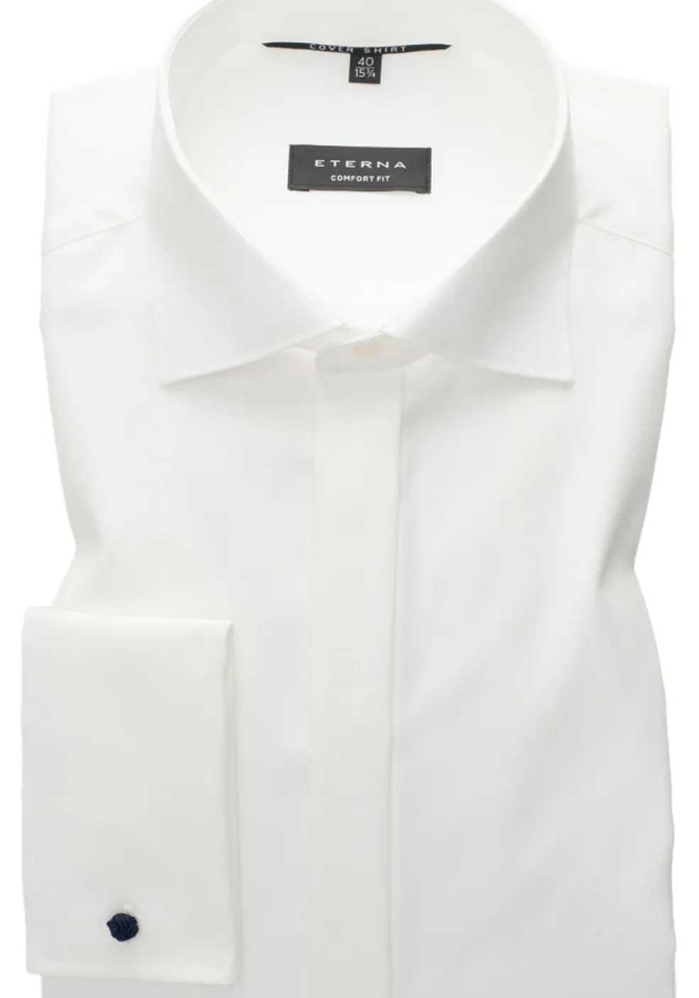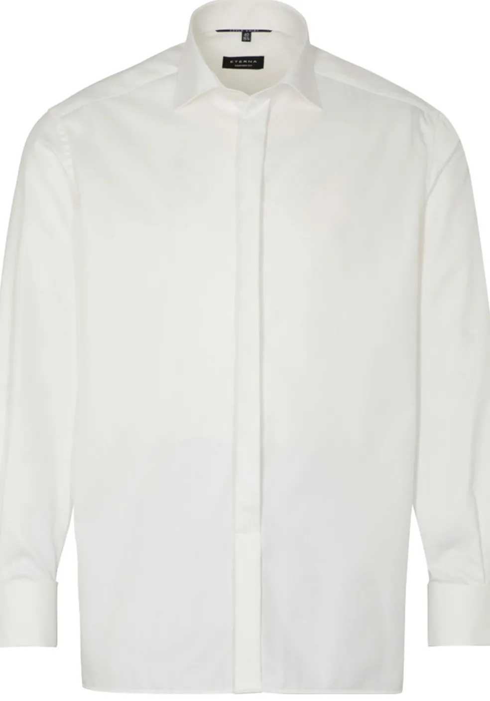 Comfort fit overhemd in een recht gesneden, ongetailleerd model. Dit heren overhemd van ETERNA heeft lange mouwen in een standaard mouwlengte. Of u nu wil voorkomen dat uw tatoeages zichtbaar zijn door uw lichte shirt, of gewoon omdat u het niet mooi vindt dat u de overgang ziet van uw ondershirt, met dit ondoorschijnende heren overhemd heeft u daar geen last meer van! Door de uitvoering in een twill of keper weving is de stof dicht en sterk. Twill is eenvoudig te herkennen aan het diagonale weefpatroon, wat ervoor zorgt dat de draden heel dicht op elkaar zitten en dus minder licht doorlaten. Daardoor is de stof minder doorschijnend dan bijvoorbeeld een poplin weving. Het shirt heeft een normale Kent kraag waarbij de boordpunten recht naar beneden wijzen en niet ver uit elkaar staan. Deze kraagvorm is ideaal om zo te dragen maar ook perfect te combineren met een stropdas. Door de speciale behandeling van de stof is dit hemd strijkvrij. Ideaal omdat er geen kreukels in komen tijdens het dragen en ook na het wassen hoeft het shirt niet gestreken te worden. Eventuele kreukels lopen er door de eigen lichaamswarmte uit. Voor een moderne uitstraling ontbreekt de borstzak bij dit shirt.