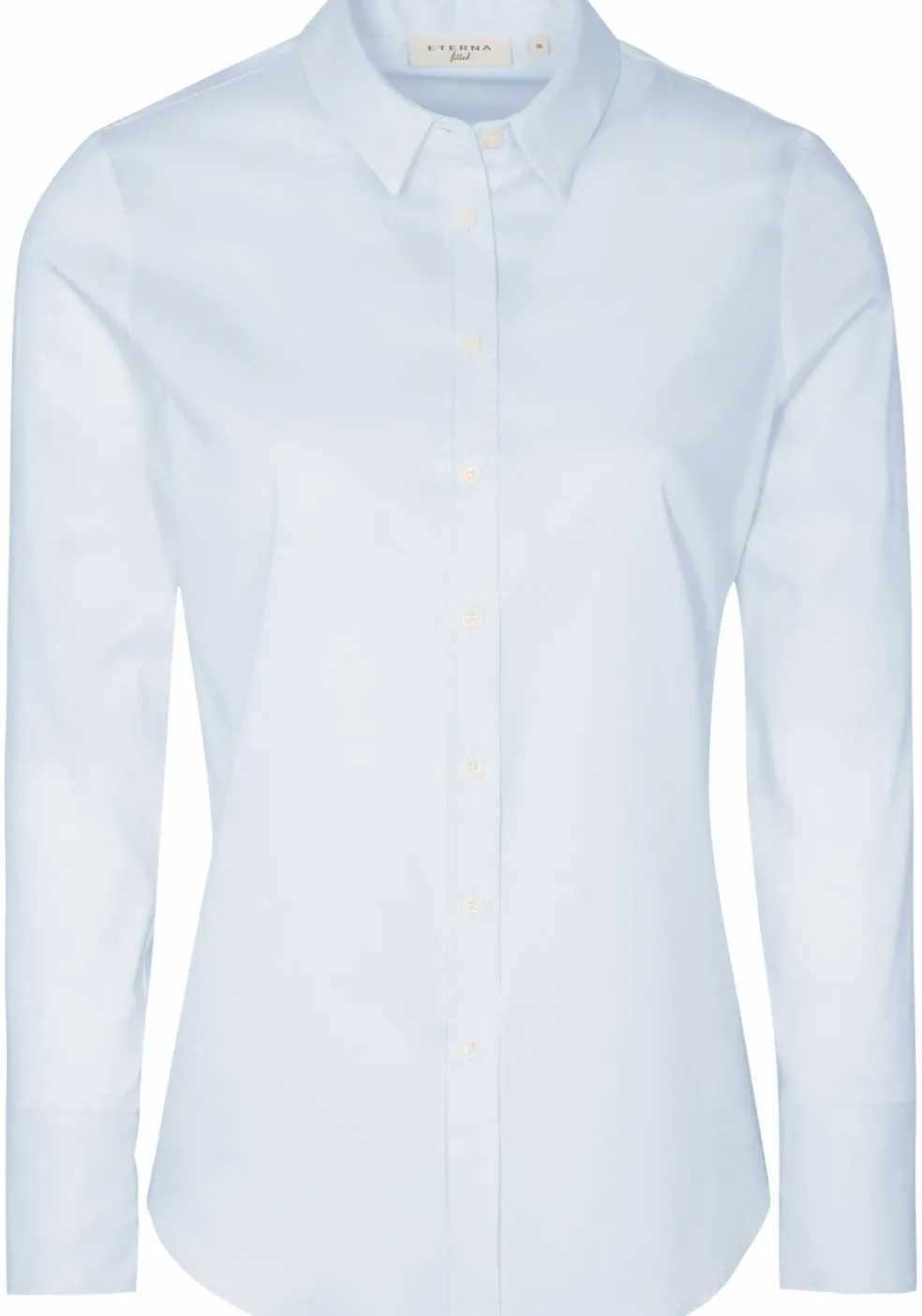 ETERNA damesblouse stretch slim fit is een klassieke lichtblauwe blouse in een prachtige moderne performance kwaliteit. Gemaakt van lyocell met polyamide en elastaan is deze combinatie niet alleen erg makkelijk te strijken, maar ook nog eens super elastisch, super zacht, verkoelend en ook de vervelende (transpiratie) geurtjes hebben er weinig effect op. Getailleerde dames blouse met een lichte glans en uitgevoerd in een twill weving. Klassieke, stijlvolle, zakelijke blouse met lange mouwen, rechte manchetten met een knoopsluiting en een afgeronde onderkant. Het slim fit model heeft een mooie taillering voor een prachtig slank silhouet, hoe strak de blouse zit hangt af van de maat die u bestelt. Maar dit is echt een blouse om iedere dag te dragen, dus ook in een strak aansluitende maat draagt dit shirt nog steeds erg lekker, juist door de super stretch. De kraag is mooi en blijft mooi en is net wat minder sterk verstevigd dan de heren variant, maar blijft net zo mooi zitten.