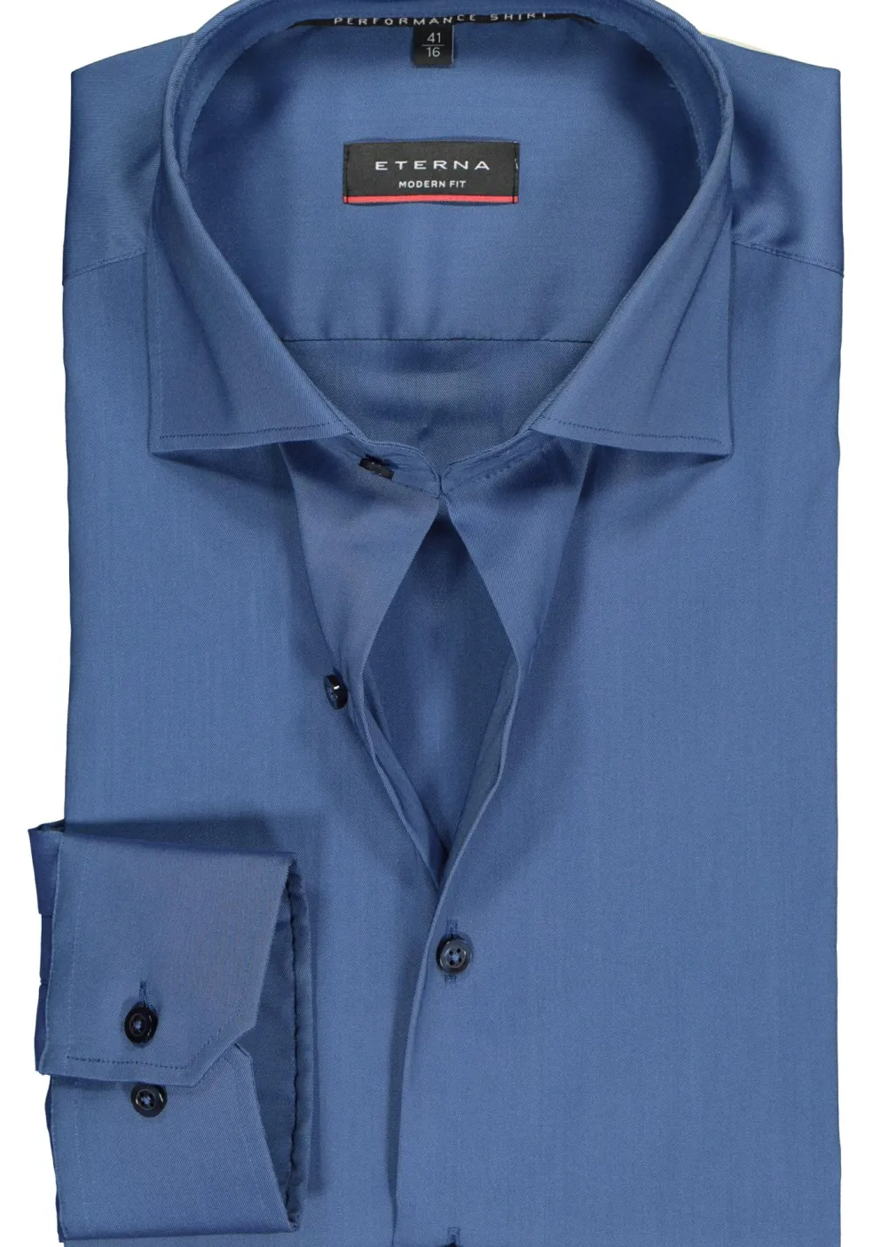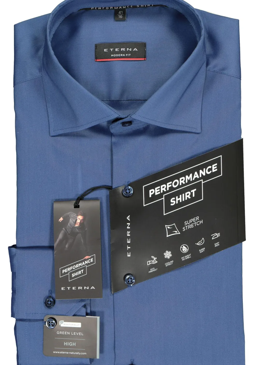 ETERNA modern fit performance overhemd. Een licht getailleerd model overhemd met lange mouwen in een zeer strijkvriendelijke kwaliteit die zo elastisch is dat het wel sportkleding lijkt. Het lyocell aandeel in het materiaal zorgt voor een verkoelend effect door de ademende en vocht absorberende eigenschappen van dit natuurlijke materiaal. Het heerlijk dragende hemd heeft een Kent kraag en de manchetten zijn verstelbaar in twee wijdtes en kunnen ook gedragen worden met manchetknopen. Heerlijk overhemd zonder borstzak met een hoog draagcomfort, een stevige kraag, een afgeronde onderkant en een prachtige afwerking.