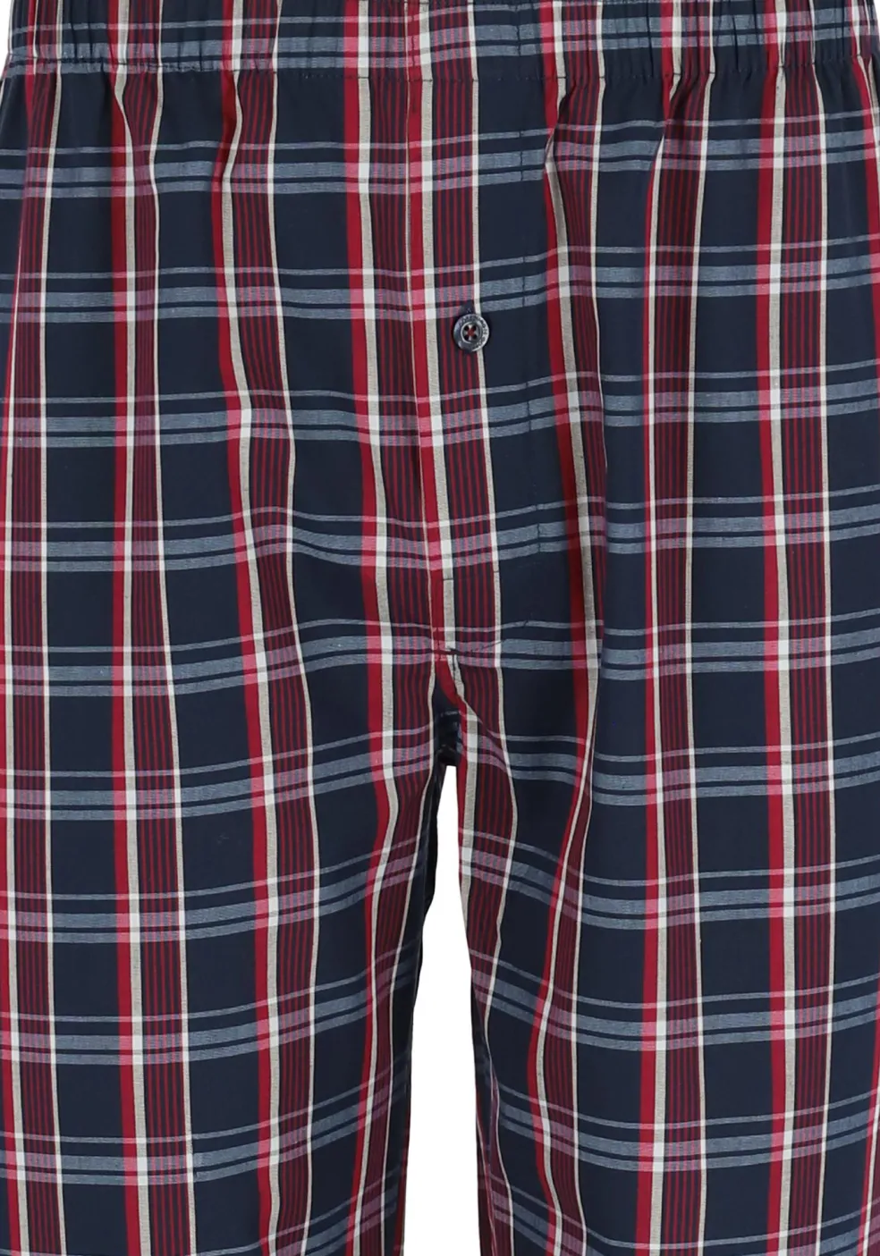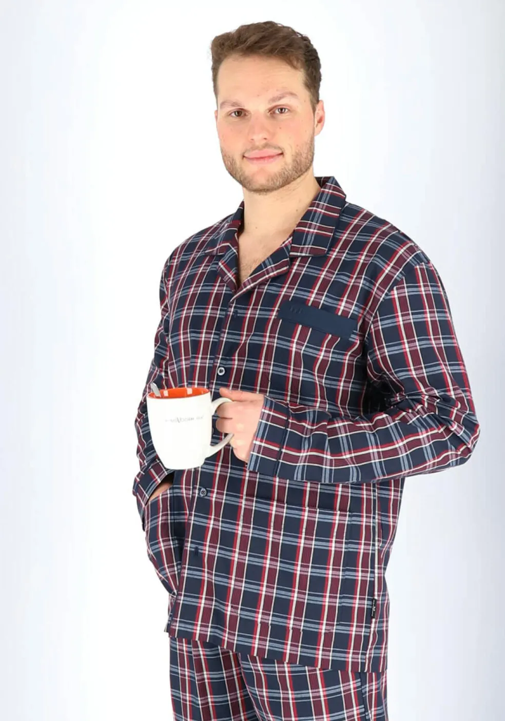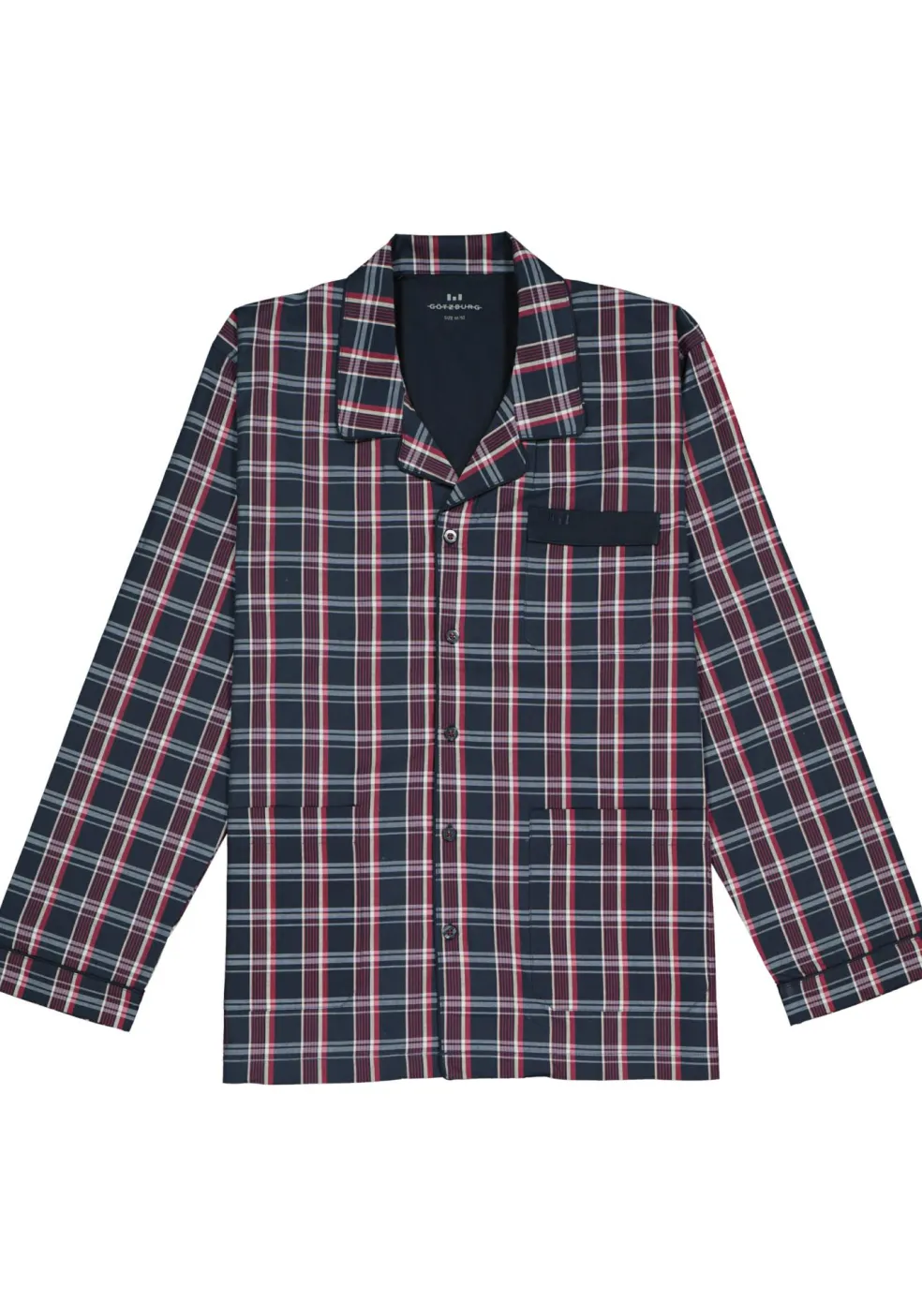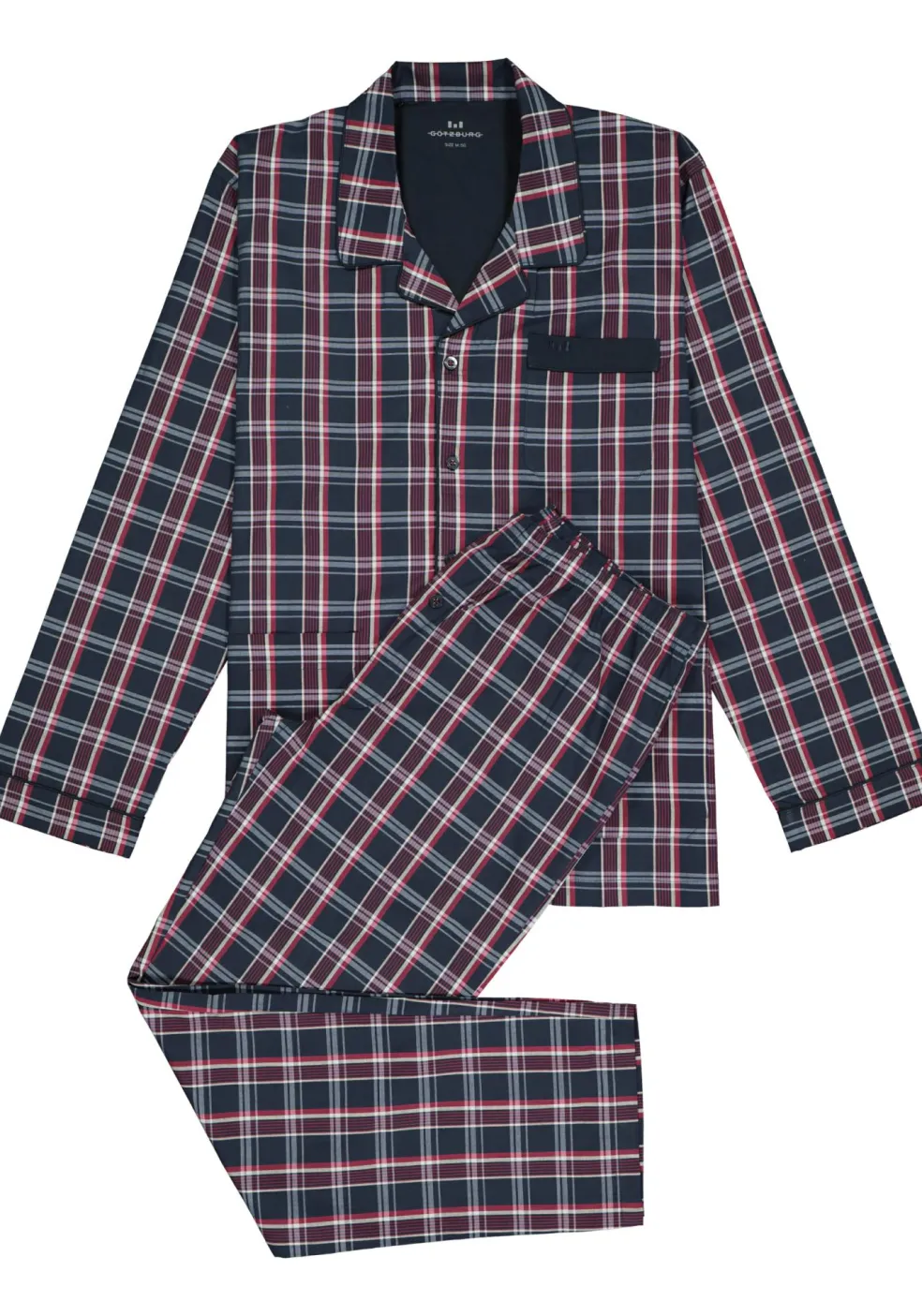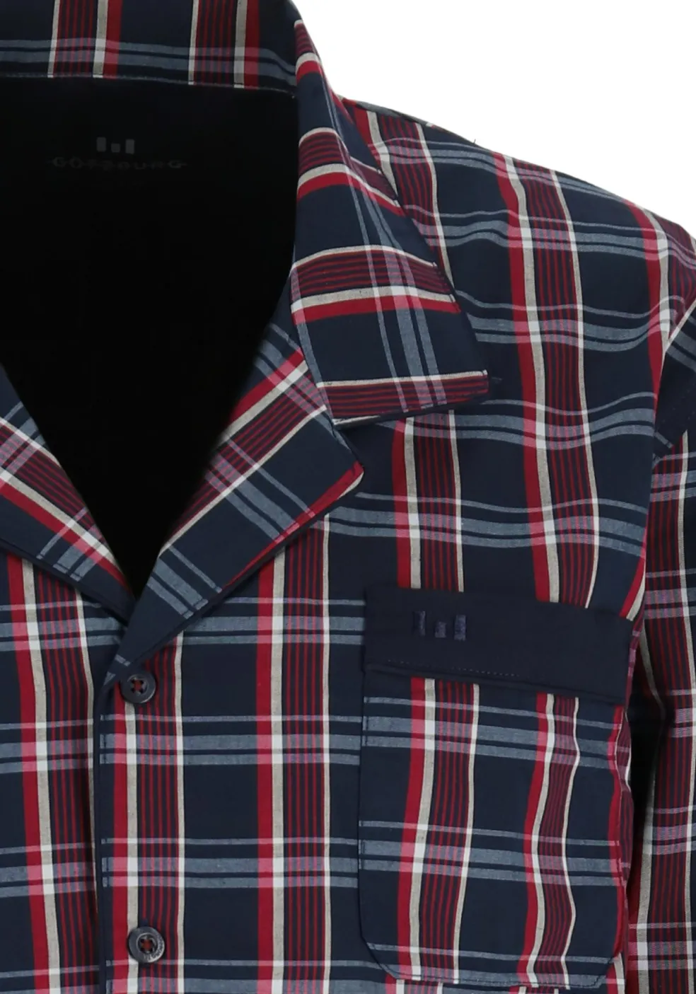 Klassieke heren pyjama van Gotzburg in een rood met wit en blauw ruitje. Een pyjama set met een lange broek en shirt met lange mouwen, een knoopsluiting en een revers kraag. Model met twee opgestikte zakken en een borstzak. Gemaakt van 100% katoen in een niet rekbare popeline uitvoering, gewoon zoals een klassieke heren pyjama hoort te zijn.