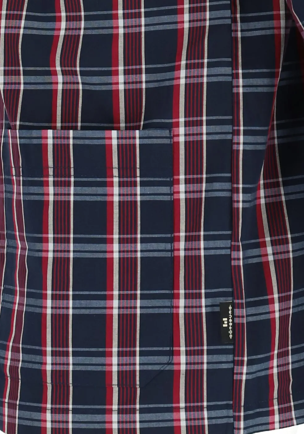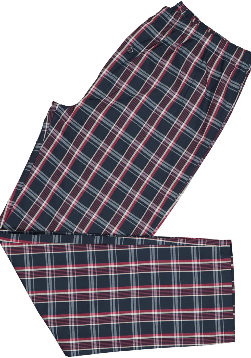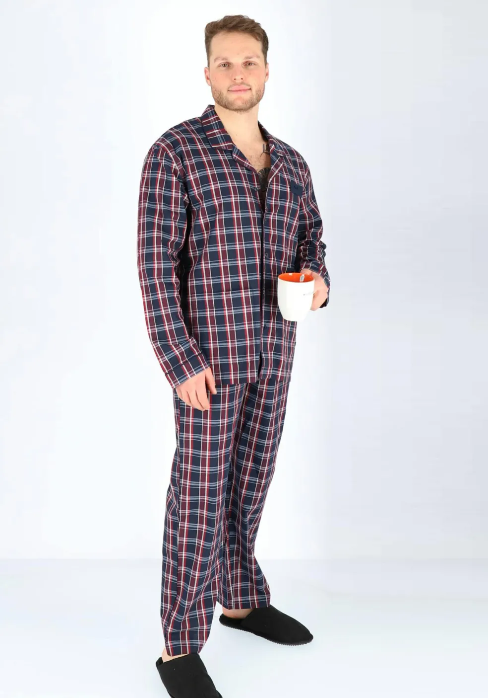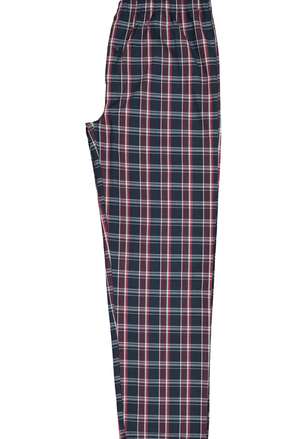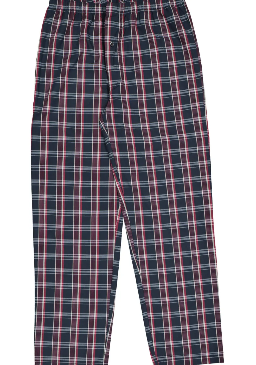 Klassieke heren pyjama van Gotzburg in een rood met wit en blauw ruitje. Een pyjama set met een lange broek en shirt met lange mouwen, een knoopsluiting en een revers kraag. Model met twee opgestikte zakken en een borstzak. Gemaakt van 100% katoen in een niet rekbare popeline uitvoering, gewoon zoals een klassieke heren pyjama hoort te zijn.