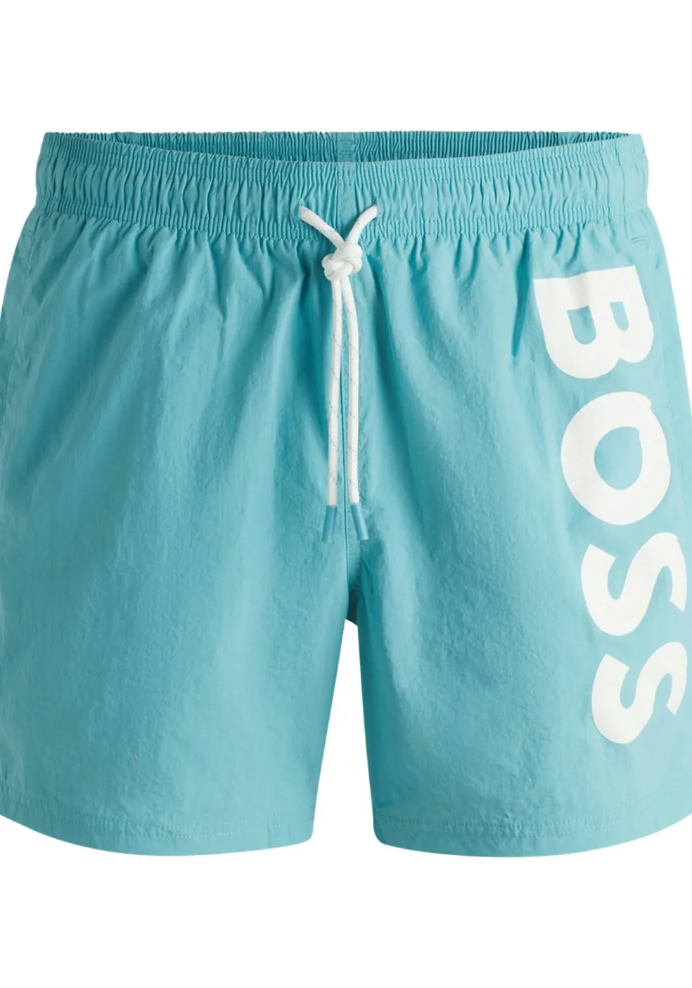 Octopus zwemshorts van BOSS. Een sportief swimshort wat opvalt door het grote contrasterende BOSS logo op de linkerpijp. De sneldrogende polyester zwembroek is volledig gevoerd met een polyester binnenbroek. De elastische tailleband kan verder op maat gemaakt worden met het koordje. Zwembroek met twee handige steekzakken voor en een kontzak.