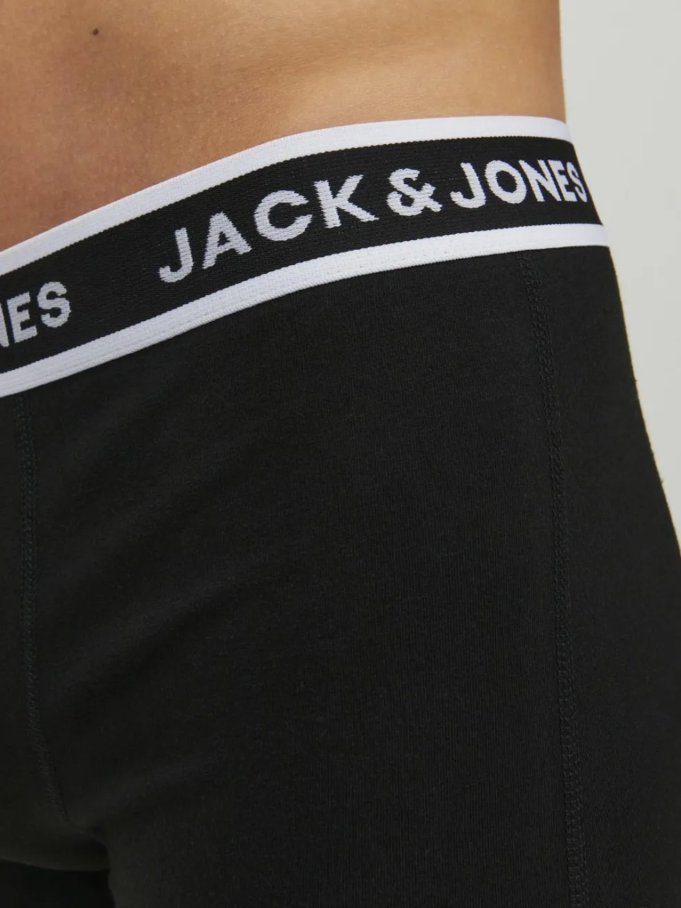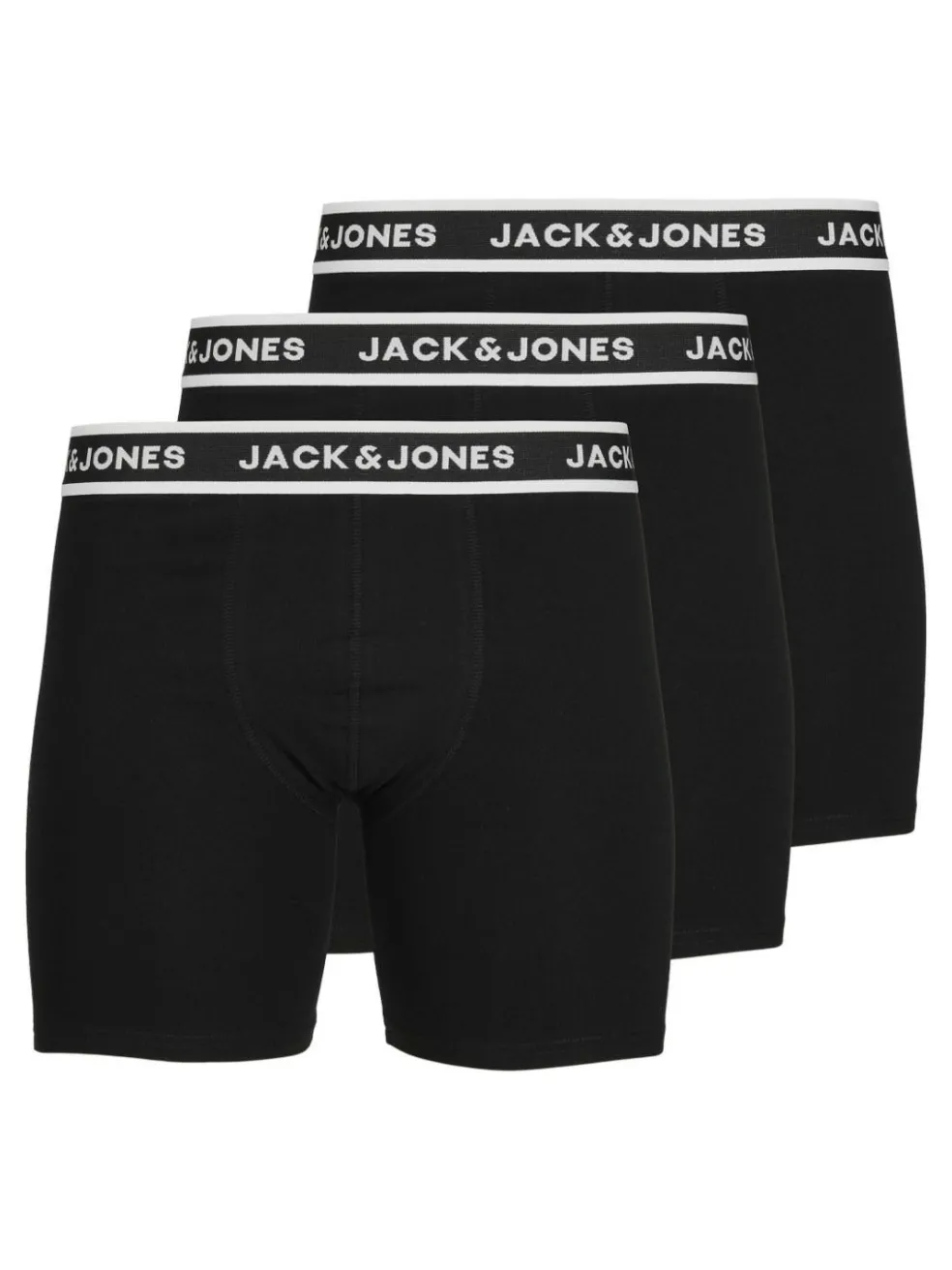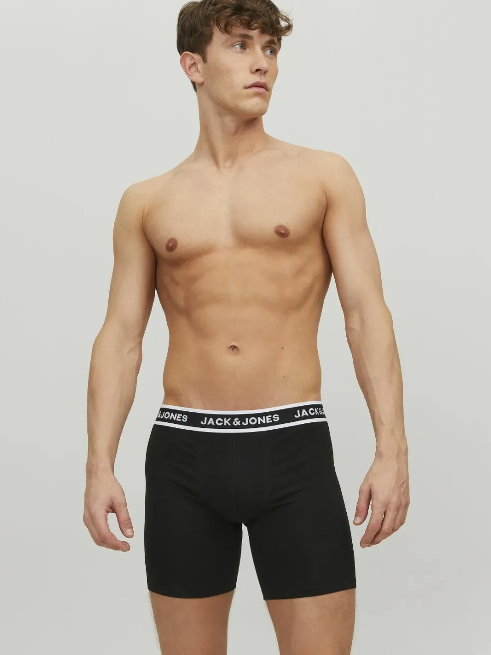 Jack & Jones Jacsolid boxer briefs in een handige verpakking van drie stuks. De boxers in deze set zijn zwart. Het boxer brief model heeft langere pijpjes dan de het standaard model van de trunk. Het voorpand is dubbel uitgevoerd voor een prettige ondersteuning. De boxer heeft geen gulp en is afgewerkt met een brede elastische tailleband. De onderbroek is uitgevoerd in een comfortabele single jersey weving van katoen met stretch voor flexibiliteit en comfort.