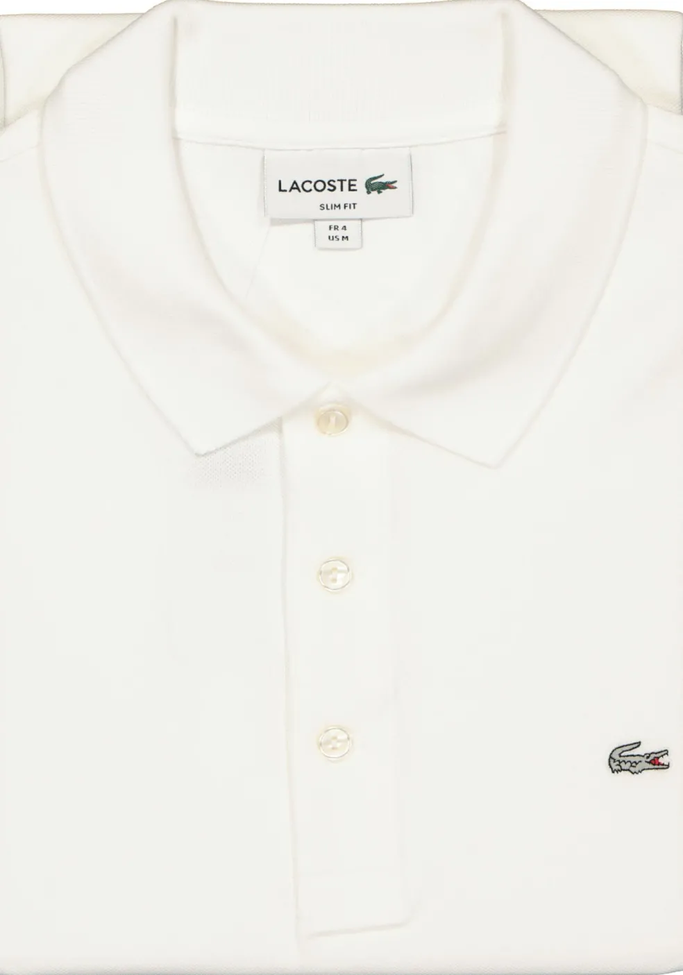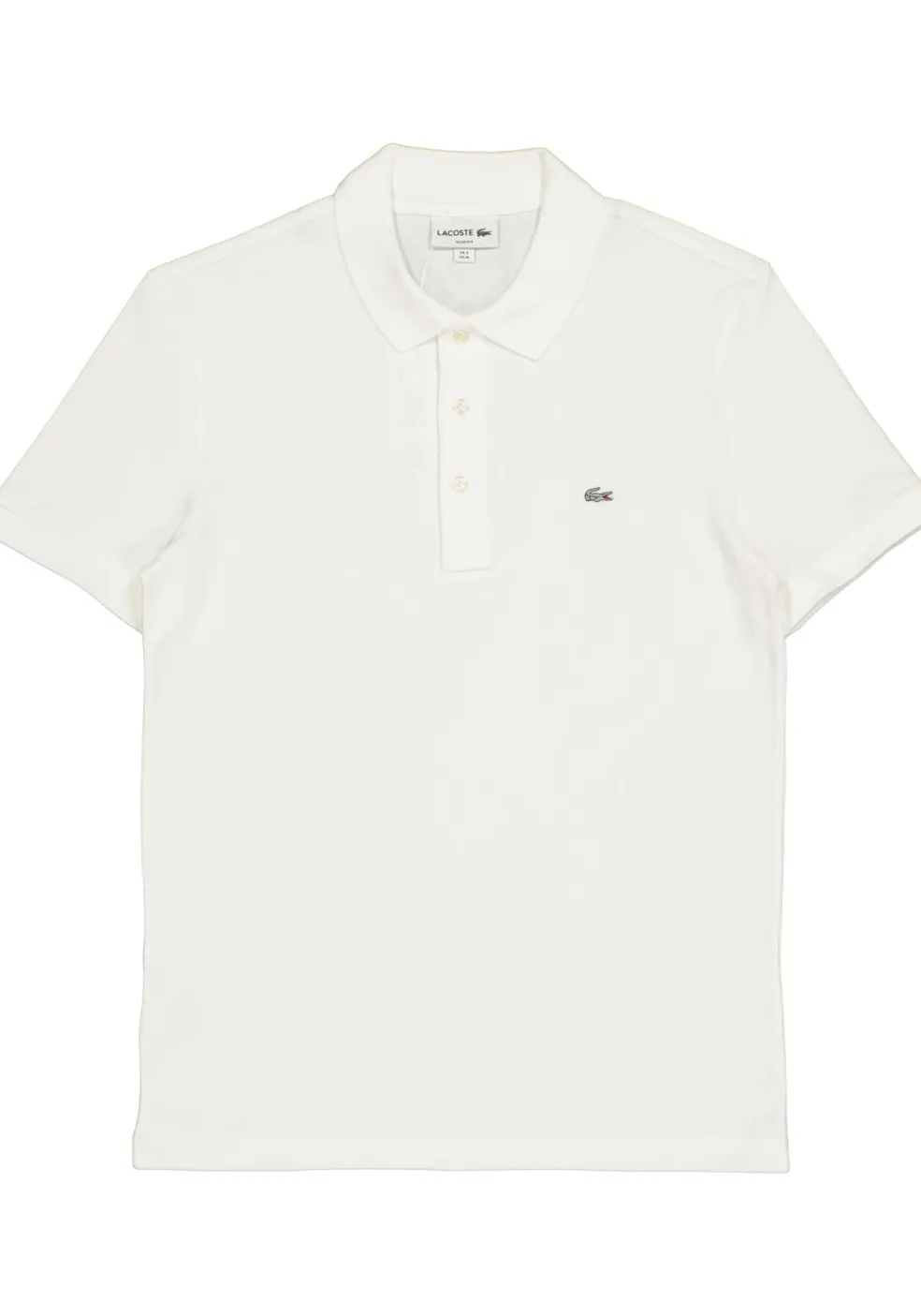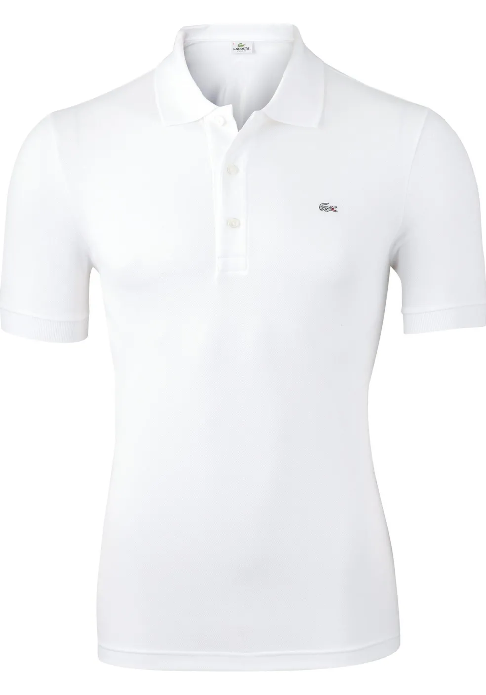 Witte Lacoste polo met korte mouwen in een strak getailleerde pasvorm. Gemaakt van 96% katoen en 4% elastaan voor een perfect draagcomfort. Door de toevoeging van stretch sluit deze slanke polo mooi aan op het lichaam. Ideale polo voor de slanke man! Deze witte polo is voorzien van een knooplijst met drie knopen, zilvergrijze krokodil (hiermee wordt de extra slanke pasvorm aangegeven) en geribde zoom bij de mouwen en kraag. Wasmachine bestendig en is gemakkelijk om te strijken (easycare). LET OP: deze polo is door zijn lengte niet geschikt voor lange mannen.