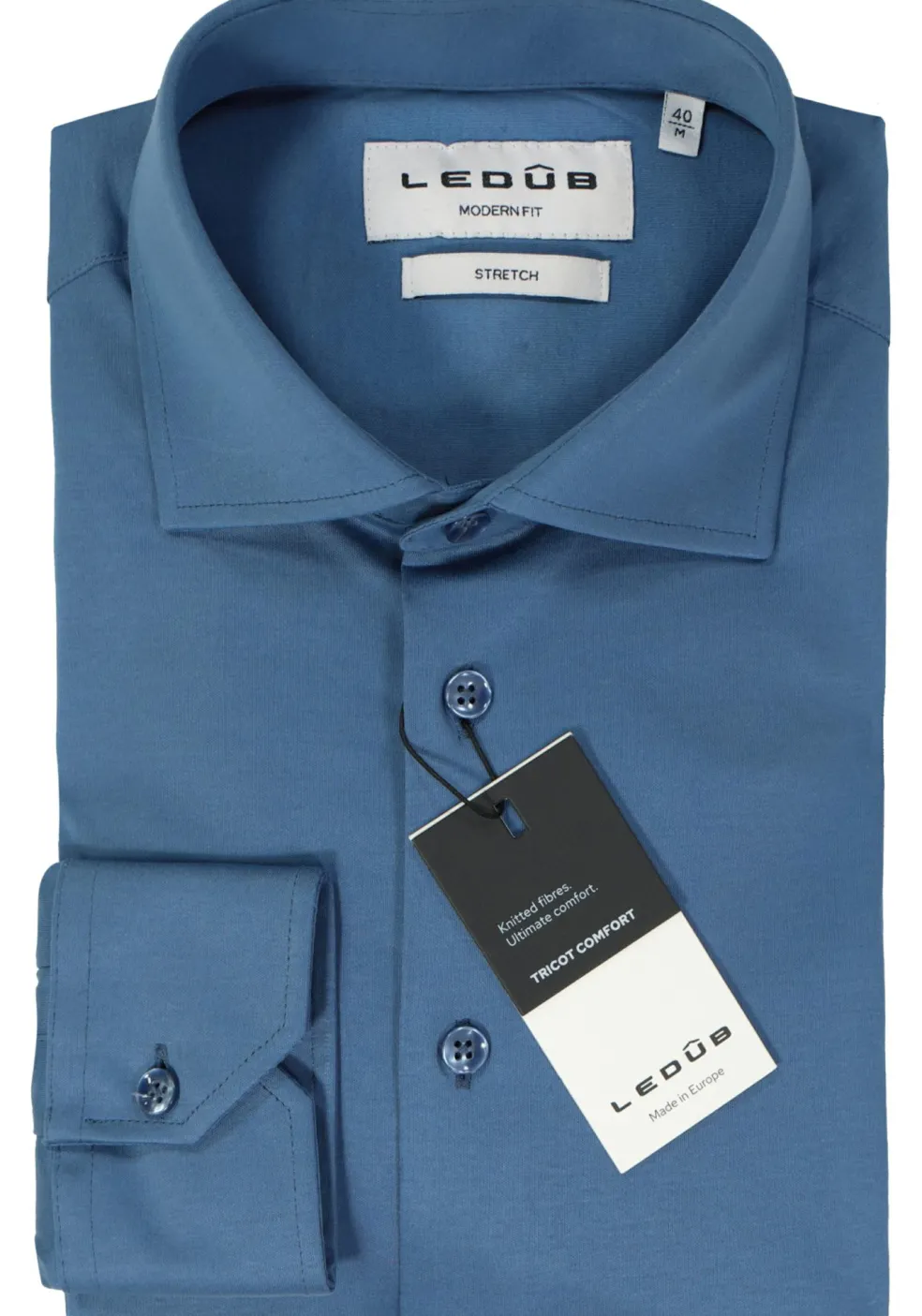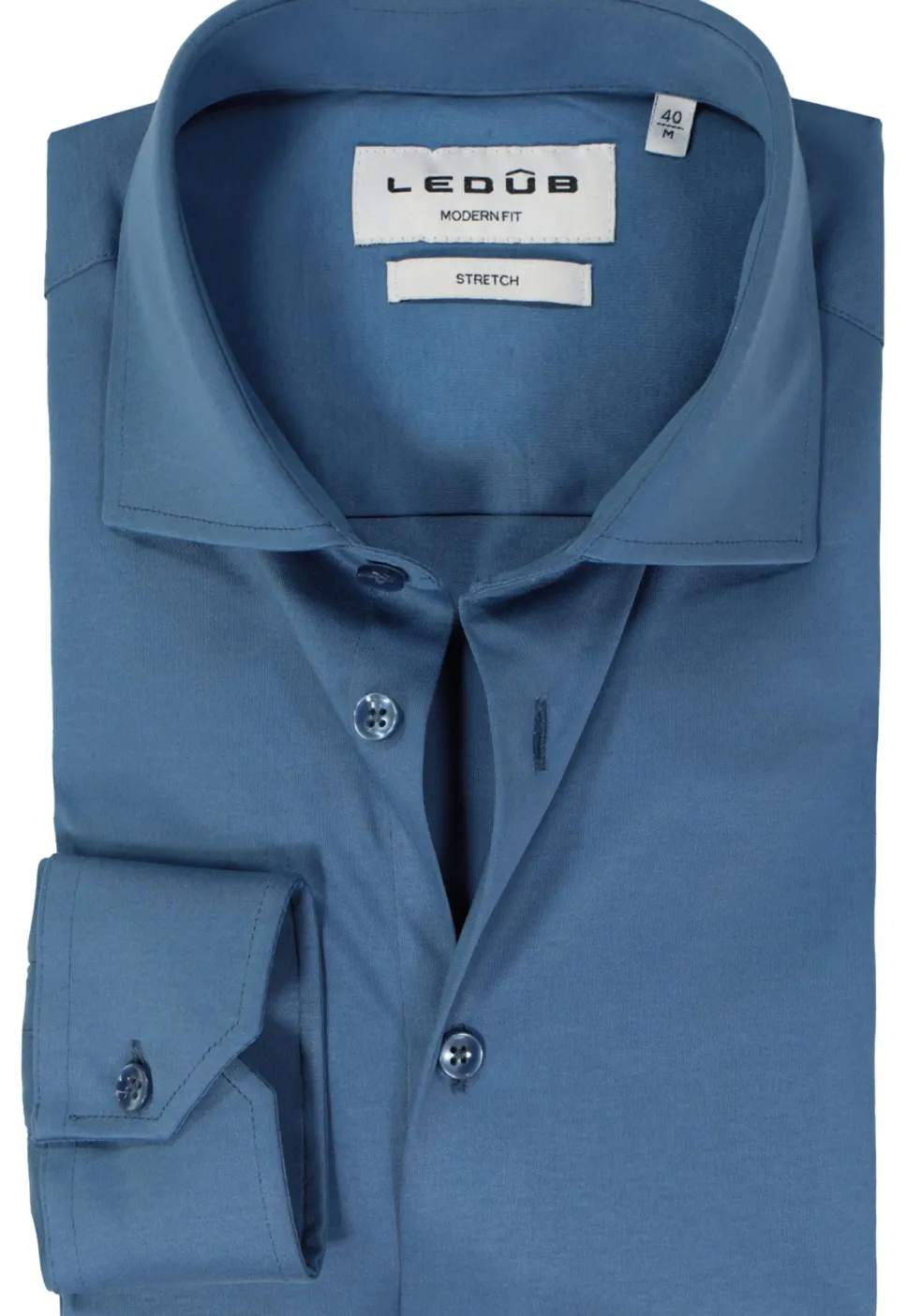 Modern getailleerd modern fit overhemd. De lichte taillering van dit hemd zorgt ervoor dat deze pasvorm de meeste mannen past. Dit heren overhemd van Ledub heeft standaard lengte lange mouwen, door Ledub Sleeve 5 genoemd. Ledub Sleeve 5 mouwen zijn 68 cm lang, waarmee ze wat langer zijn dan veel van onze andere hemden. Door de uitvoering in een poplin weving is de stof glad, zacht, soepel en egaal. Dit is een van de meest gebruikte wevingen voor overhemden. Het shirt heeft een moderne haifisch kraag waarbij de boordpunten wijd uit elkaar staan. Deze kraag is daarmee ideaal voor een breed geknoopte stropdas of om juist zonder stropdas te dragen. De easy iron kwaliteit van de stof zorgt ervoor dat het slechts licht gestreken hoeft te worden voor een prachtig glad resultaat. Voor een moderne uitstraling ontbreekt de borstzak bij dit shirt. Bij Ledub modern fit heeft iedere boordmaat ook voor de rest van het hemd een eigen maatvoering. Raadpleeg voor de juiste maat dan ook even de maattabel zodat u de juiste maat kan bestellen.