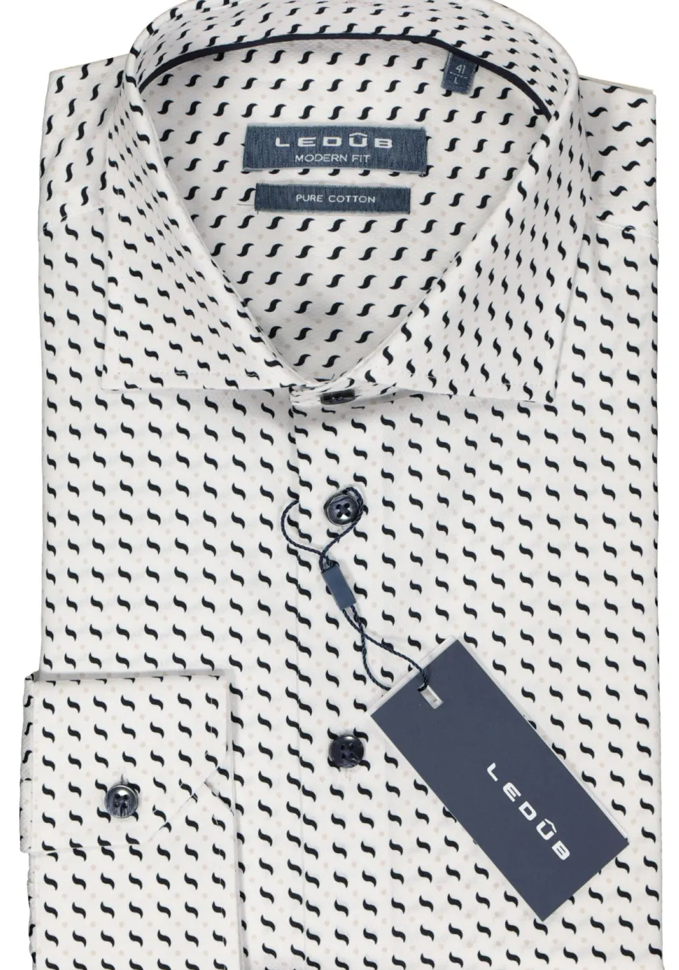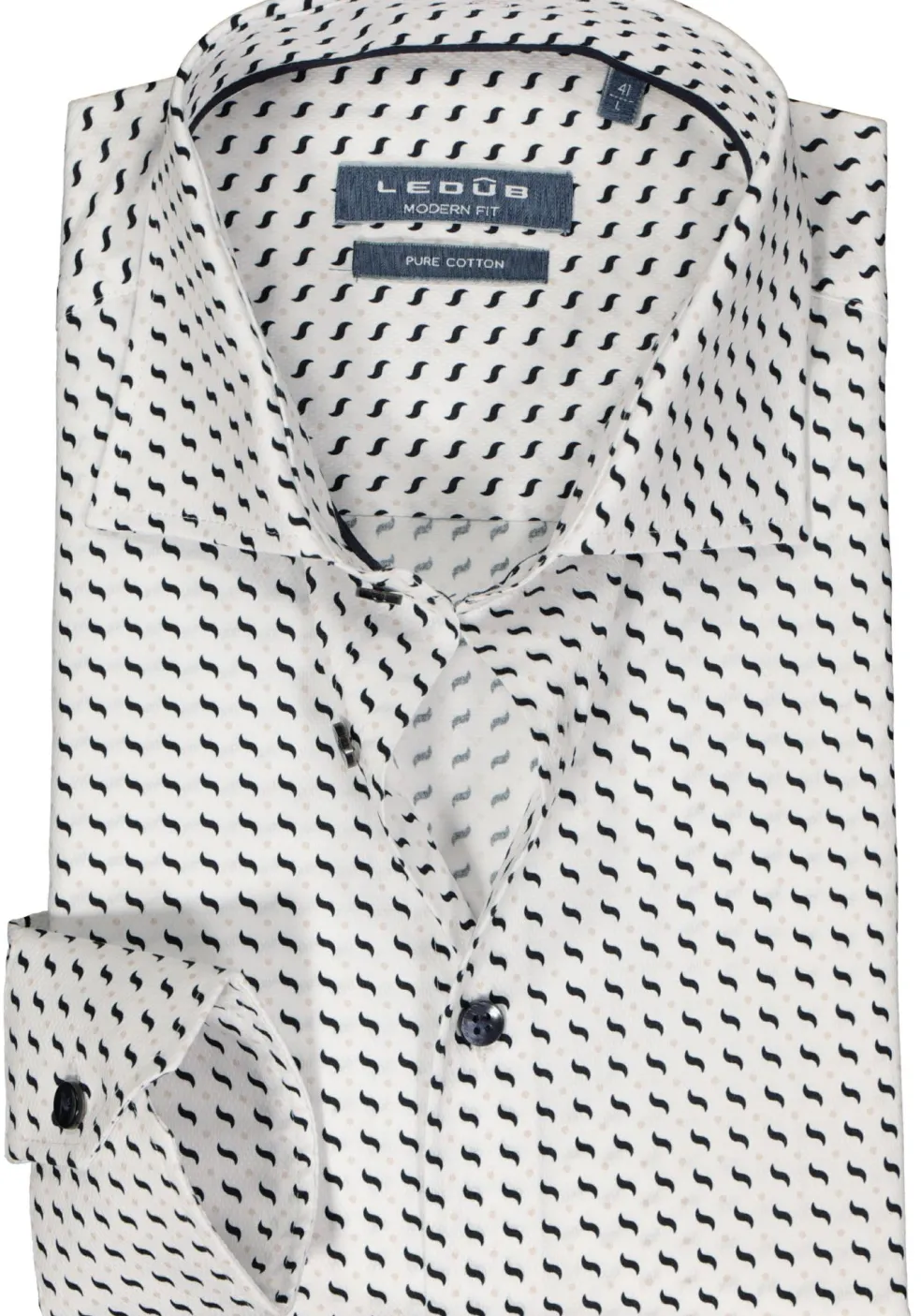 Modern getailleerd modern fit overhemd. De lichte taillering van dit hemd zorgt ervoor dat deze pasvorm de meeste mannen past. Dit heren overhemd van Ledub heeft standaard lengte lange mouwen, door Ledub Sleeve 5 genoemd. Ledub Sleeve 5 mouwen zijn 68 cm lang, waarmee ze wat langer zijn dan veel van onze andere hemden. Door de uitvoering in een poplin weving is de stof glad, zacht, soepel en egaal. Dit is een van de meest gebruikte wevingen voor overhemden. Het shirt heeft een moderne haifisch kraag waarbij de boordpunten wijd uit elkaar staan. Deze kraag is daarmee ideaal voor een breed geknoopte stropdas of om juist zonder stropdas te dragen. De easy iron kwaliteit van de stof zorgt ervoor dat het slechts licht gestreken hoeft te worden voor een prachtig glad resultaat. Voor een moderne uitstraling ontbreekt de borstzak bij dit shirt. Bij Ledub modern fit heeft iedere boordmaat ook voor de rest van het hemd een eigen maatvoering. Raadpleeg voor de juiste maat dan ook even de maattabel zodat u de juiste maat kan bestellen.