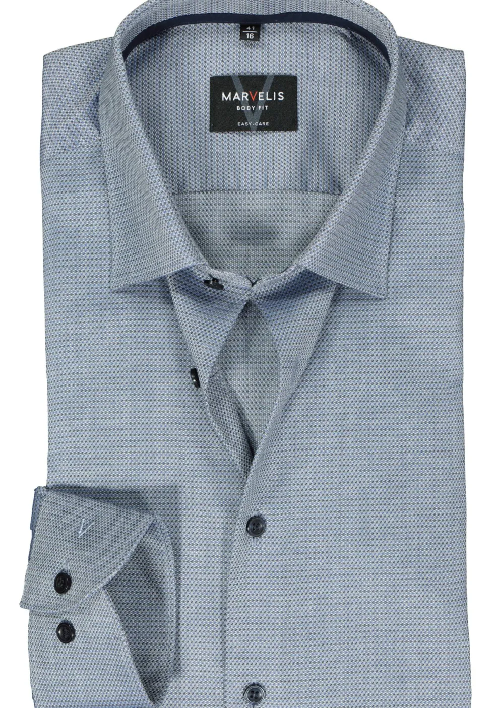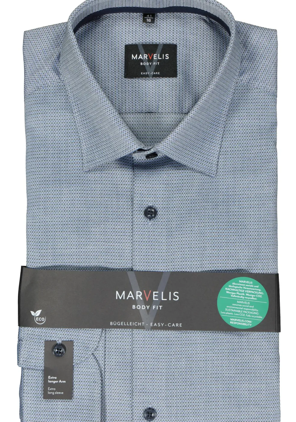Overhemd van MARVELIS in een donkerblauw mini dessin. De body fit pasvorm van MARVELIS is strak getailleerd en heeft een moderne uitstraling door de aansluitende pasvorm en smaller gesneden mouwen. Dit heren overhemd van MARVELIS heeft extra lange mouwen speciaal voor lange mannen. Een heren overhemd van MARVELIS met mouwlengte 7 is alleen geschikt voor lange mannen. De mouwen zijn 5cm langer dan bij de standaard mouwlengte, maar ook het hemd zelf is langer waardoor deze ook perfect in de broek blijft zitten als u wat langer bent. Door de uitvoering in een structuurweving zit er wat afwisseling in de stof voor een stijlvol resultaat. Het shirt heeft een normale Kent kraag waarbij de boordpunten recht naar beneden wijzen en niet ver uit elkaar staan. Deze kraagvorm is ideaal om zo te dragen maar ook perfect te combineren met een stropdas. De easy iron kwaliteit van de stof zorgt ervoor dat het slechts licht gestreken hoeft te worden voor een prachtig glad resultaat. Voor een moderne uitstraling ontbreekt de borstzak bij dit shirt. MARVELIS slim fit overhemden vallen op door hun perfecte pasvorm en de moderne uitvoering met oog voor detail.