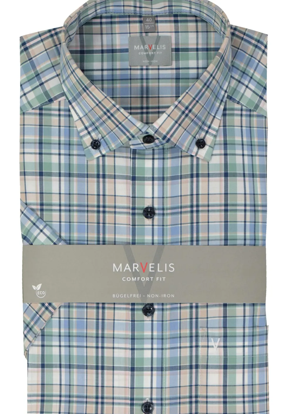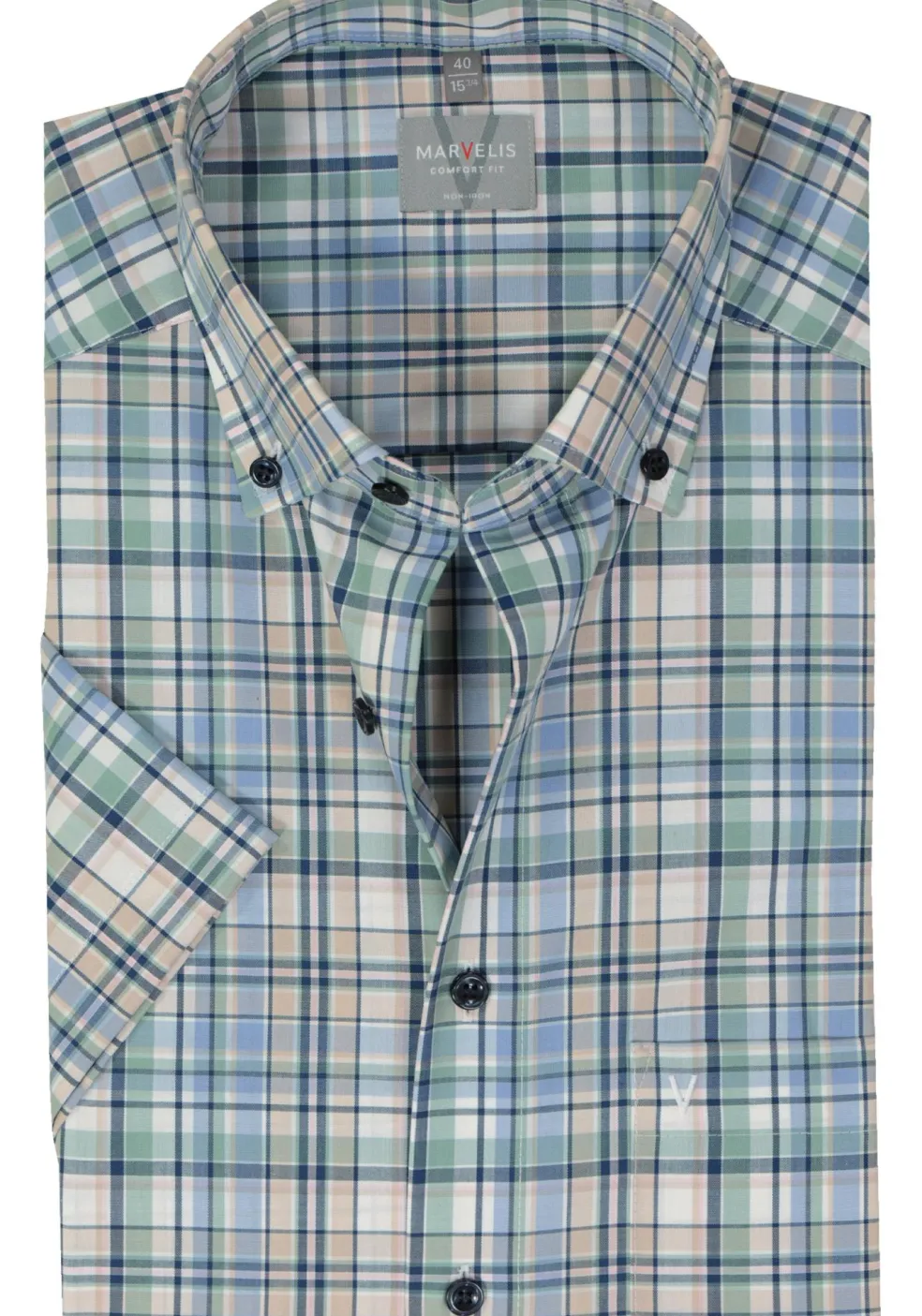 Overhemd van MARVELIS in een groen geruite uitvoering. De comfort fit pasvorm van MARVELIS is niet getailleerd. Het rechte model is prettig dragen bij een wat gevulder postuur, maar natuurlijk ook voor iedere man die houdt van een lekker ruim vallend shirt. Dit heren overhemd van MARVELIS heeft korte mouwen. Heerlijk voor de warme dagen, maar ook fijn voor de mannen die gewoon graag een shirt met korte mouwen dragen. Door de uitvoering in een poplin weving is de stof glad, zacht, soepel en egaal. Dit is een van de meest gebruikte wevingen voor overhemden. Het shirt heeft een sportieve button-down kraag die meestal zonder stropdas gedragen wordt. Door de knoopjes in de boordpunten waarmee de punten van de kraag vastgezet kunnen worden aan het hemd, blijft de kraag mooi zitten. Door de speciale behandeling van de stof is dit hemd strijkvrij. Ideaal omdat er geen kreukels in komen tijdens het dragen en ook na het wassen hoeft het shirt niet gestreken te worden. Eventuele kreukels lopen er door de eigen lichaamswarmte uit. De handige borstzak op de linkerborst heeft een subtiel geborduurd logo. MARVELIS comfort fit overhemden zijn ideaal voor de man die van een comfortabel overhemd houdt en graag goed gekleed voor de dag komt met deze prachtig uitgewerkte shirts.