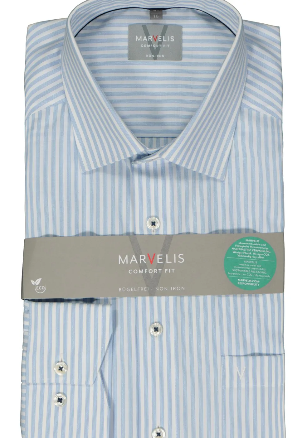 Overhemd van MARVELIS in een lichtblauw gestreepte uitvoering. De comfort fit pasvorm van MARVELIS is niet getailleerd. Het rechte model is prettig dragen bij een wat gevulder postuur, maar natuurlijk ook voor iedere man die houdt van een lekker ruim vallend shirt. Dit heren overhemd van MARVELIS heeft lange mouwen in een standaard mouwlengte. Een heren overhemd van MARVELIS met lange mouwen is ideaal voor iedere gelegenheid. De manchetten zijn in twee wijdtes te dragen waardoor ze makkelijk aan te passen zijn naar de eigen voorkeur. Door de uitvoering in een poplin weving is de stof glad, zacht, soepel en egaal. Dit is een van de meest gebruikte wevingen voor overhemden. Het shirt heeft een normale Kent kraag waarbij de boordpunten recht naar beneden wijzen en niet ver uit elkaar staan. Deze kraagvorm is ideaal om zo te dragen maar ook perfect te combineren met een stropdas. Door de speciale behandeling van de stof is dit hemd strijkvrij. Ideaal omdat er geen kreukels in komen tijdens het dragen en ook na het wassen hoeft het shirt niet gestreken te worden. Eventuele kreukels lopen er door de eigen lichaamswarmte uit. De handige borstzak op de linkerborst heeft een subtiel geborduurd logo. MARVELIS comfort fit overhemden zijn ideaal voor de man die van een comfortabel overhemd houdt en graag goed gekleed voor de dag komt met deze prachtig uitgewerkte shirts.