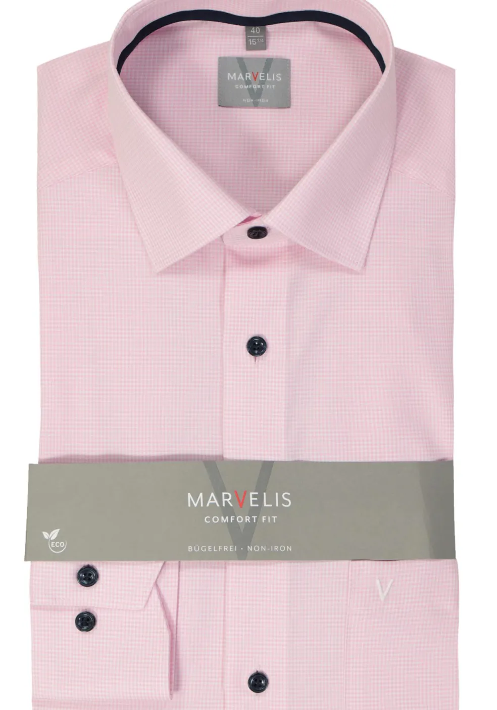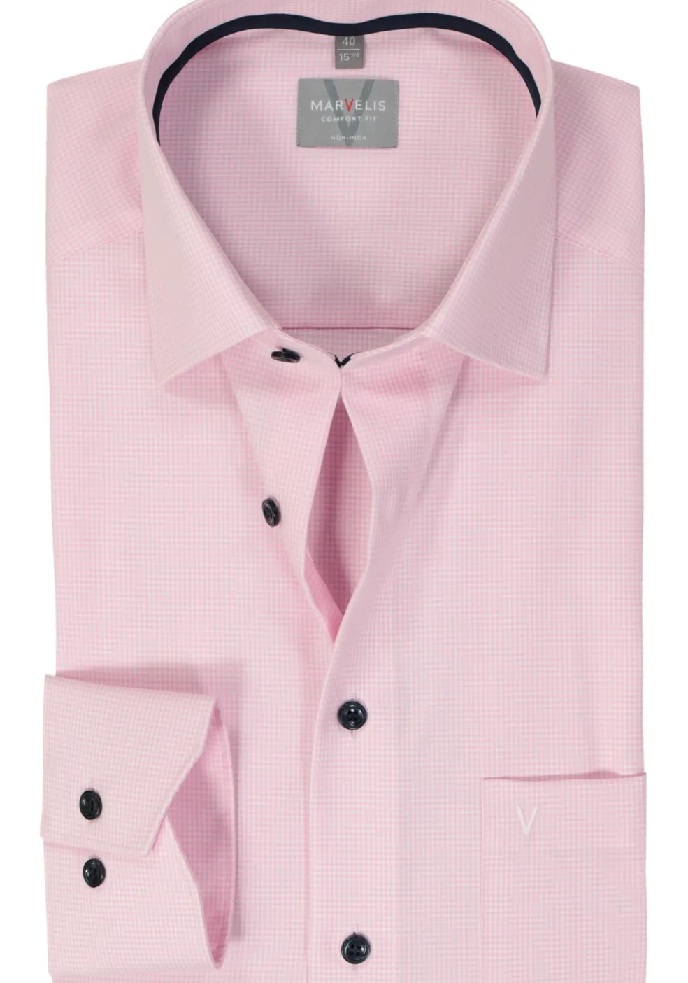 Overhemd van MARVELIS in een roze geruite uitvoering. De comfort fit pasvorm van MARVELIS is niet getailleerd. Het rechte model is prettig dragen bij een wat gevulder postuur, maar natuurlijk ook voor iedere man die houdt van een lekker ruim vallend shirt. Dit heren overhemd van MARVELIS heeft lange mouwen in een standaard mouwlengte. Een heren overhemd van MARVELIS met lange mouwen is ideaal voor iedere gelegenheid. De manchetten zijn in twee wijdtes te dragen waardoor ze makkelijk aan te passen zijn naar de eigen voorkeur. Door de uitvoering in een poplin weving is de stof glad, zacht, soepel en egaal. Dit is een van de meest gebruikte wevingen voor overhemden. Het shirt heeft een normale Kent kraag waarbij de boordpunten recht naar beneden wijzen en niet ver uit elkaar staan. Deze kraagvorm is ideaal om zo te dragen maar ook perfect te combineren met een stropdas. Door de speciale behandeling van de stof is dit hemd strijkvrij. Ideaal omdat er geen kreukels in komen tijdens het dragen en ook na het wassen hoeft het shirt niet gestreken te worden. Eventuele kreukels lopen er door de eigen lichaamswarmte uit. De handige borstzak op de linkerborst heeft een subtiel geborduurd logo. MARVELIS comfort fit overhemden zijn ideaal voor de man die van een comfortabel overhemd houdt en graag goed gekleed voor de dag komt met deze prachtig uitgewerkte shirts.