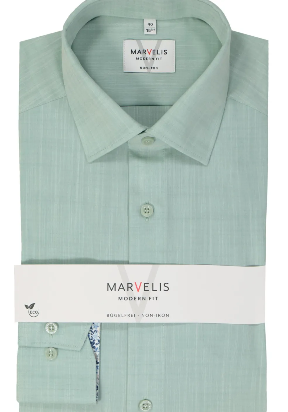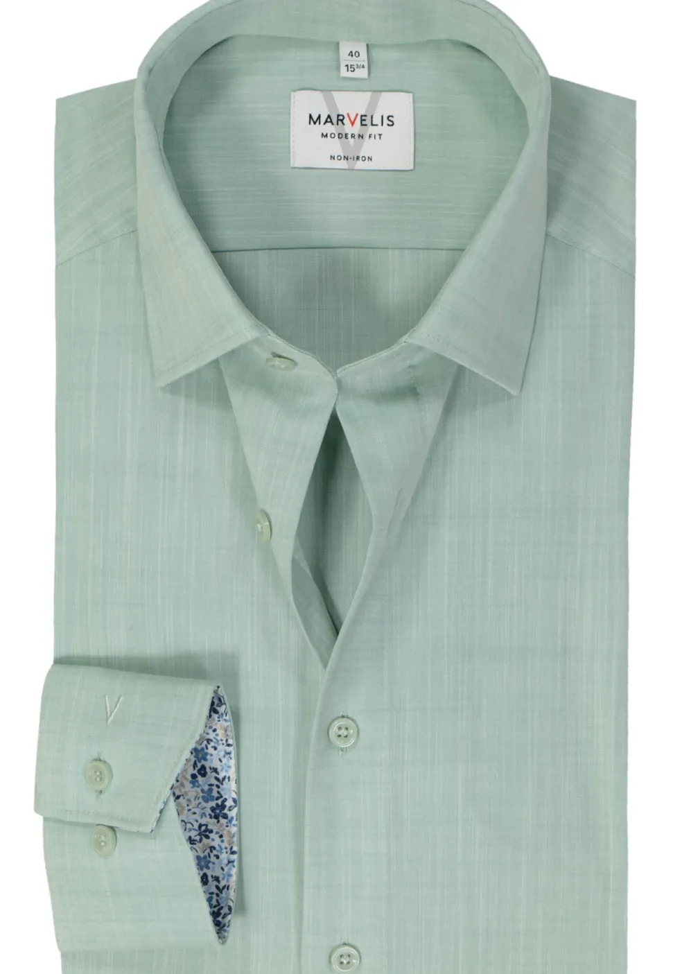 Lichtgroen overhemd van MARVELIS. De modern fit pasvorm van MARVELIS is licht getailleerd en daarmee strak genoeg voor een moderne uitstraling en wijd genoeg om lekker te zitten. Het is een pasvorm die geschikt is voor de meeste mannen en daardoor ook de meest verkochte pasvorm van MARVELIS. Dit heren overhemd van MARVELIS heeft lange mouwen in een standaard mouwlengte. Een heren overhemd van MARVELIS met lange mouwen is ideaal voor iedere gelegenheid. De manchetten zijn in twee wijdtes te dragen waardoor ze makkelijk aan te passen zijn naar de eigen voorkeur. Door de uitvoering in een poplin weving is de stof glad, zacht, soepel en egaal. Dit is een van de meest gebruikte wevingen voor overhemden. Het shirt heeft een normale Kent kraag waarbij de boordpunten recht naar beneden wijzen en niet ver uit elkaar staan. Deze kraagvorm is ideaal om zo te dragen maar ook perfect te combineren met een stropdas. Door de speciale behandeling van de stof is dit hemd strijkvrij. Ideaal omdat er geen kreukels in komen tijdens het dragen en ook na het wassen hoeft het shirt niet gestreken te worden. Eventuele kreukels lopen er door de eigen lichaamswarmte uit. Dit shirt heeft geen borstzak. MARVELIS modern fit overhemden vallen op door hun perfecte pasvorm en de moderne uitvoering met oog voor detail.