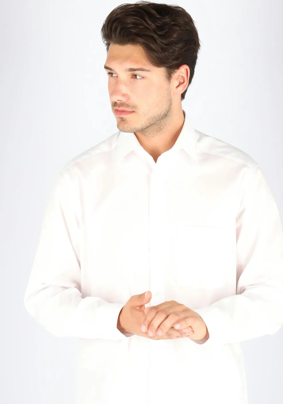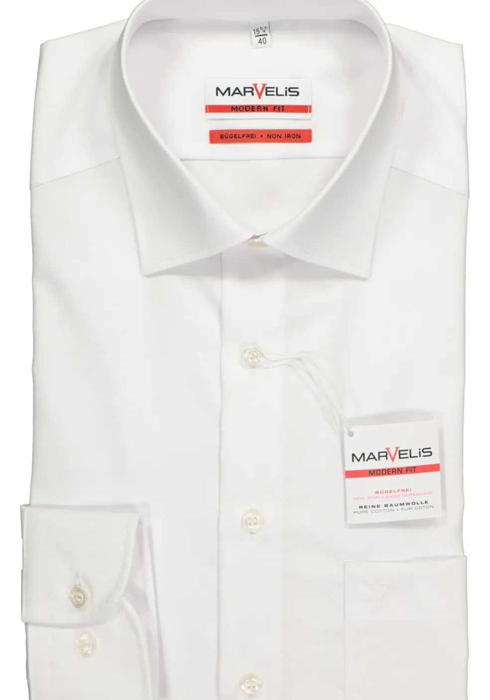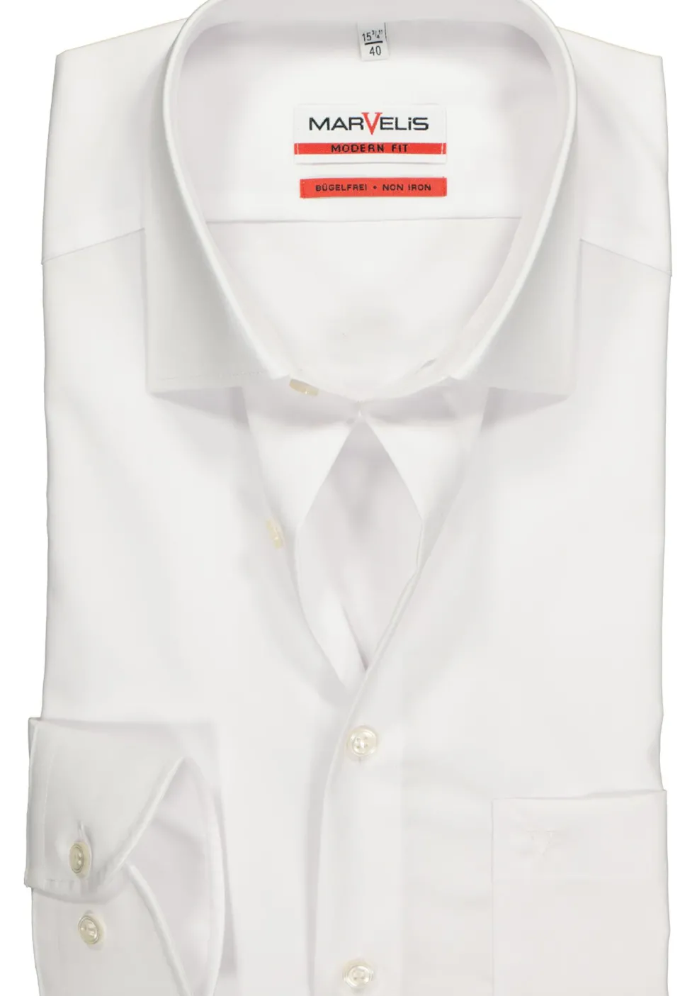 Helder wit licht getailleerd strijkvrij heren overhemd met lange mouwen. Dit MARVELIS modern fit overhemd heeft een new kent kraag, borstzak met subtiel logo borduursel en manchet combinatie met twee sluit opties. Het shirt is gemaakt van 100% (strijkvrij) katoen en is daardoor huidvriendelijk, ademend en zeer aangenaam om te dragen. Ideaal aan dit overhemd is, is dat het de hele dag door mooi glad blijft en na het wassen niet gestreken hoeft te worden.