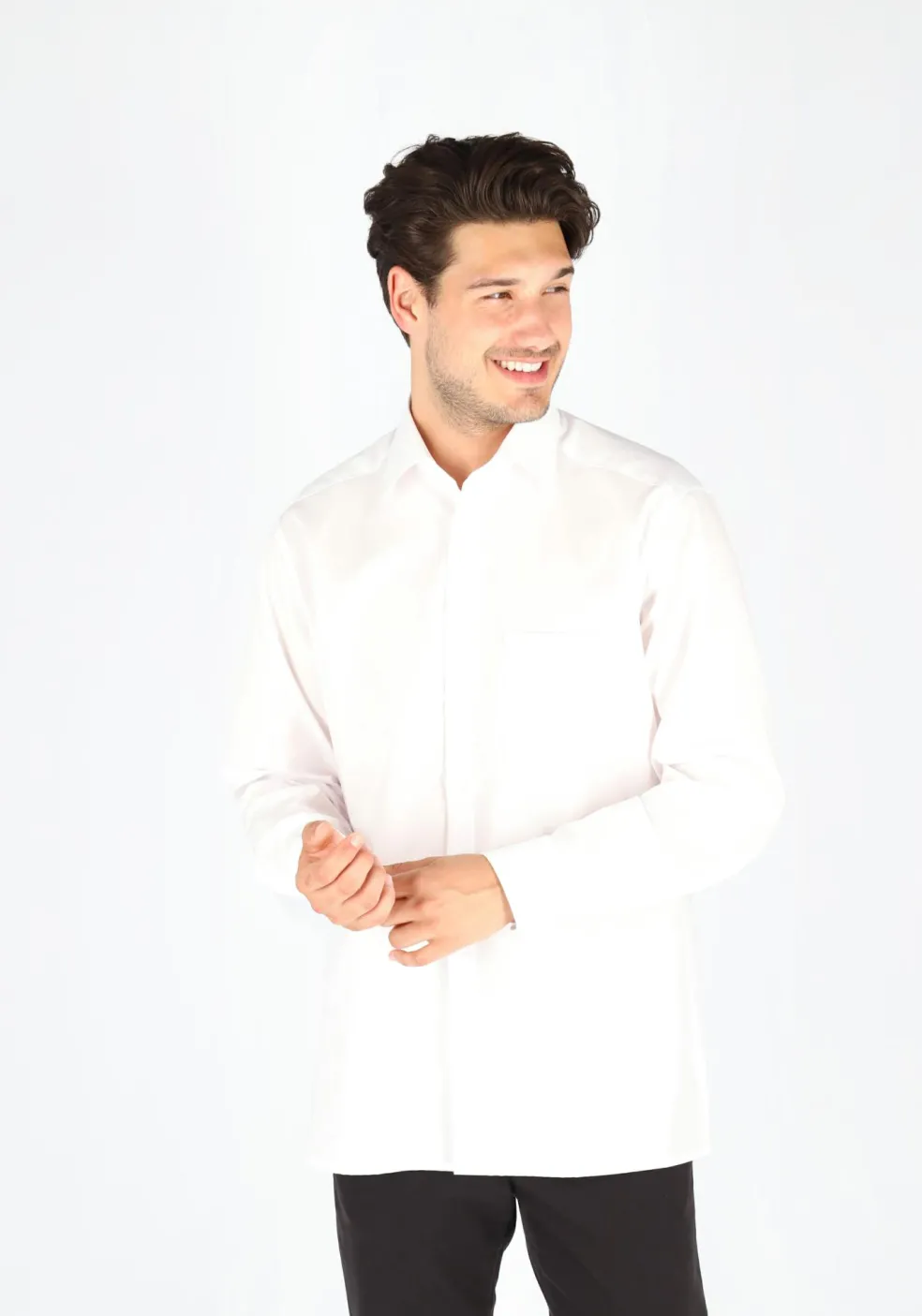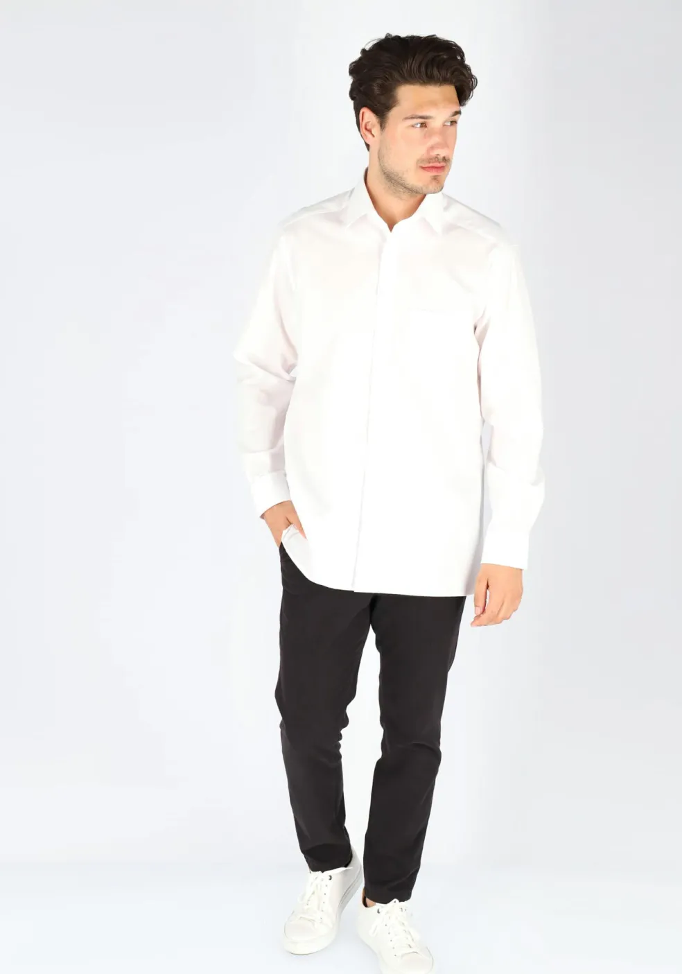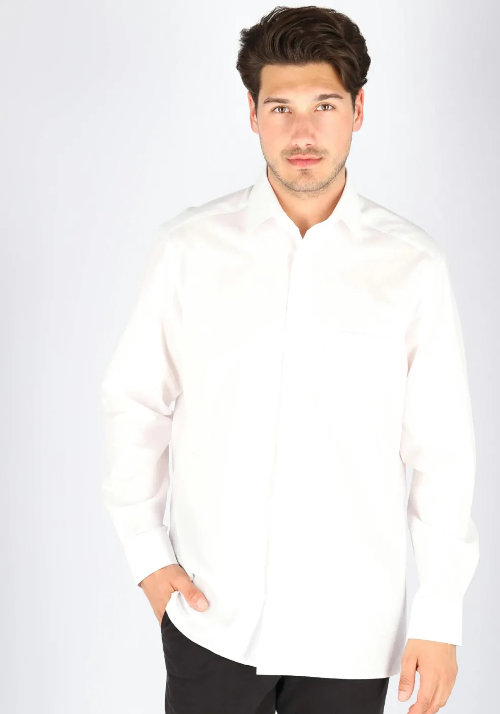 Helder wit licht getailleerd strijkvrij heren overhemd met lange mouwen. Dit MARVELIS modern fit overhemd heeft een new kent kraag, borstzak met subtiel logo borduursel en manchet combinatie met twee sluit opties. Het shirt is gemaakt van 100% (strijkvrij) katoen en is daardoor huidvriendelijk, ademend en zeer aangenaam om te dragen. Ideaal aan dit overhemd is, is dat het de hele dag door mooi glad blijft en na het wassen niet gestreken hoeft te worden.