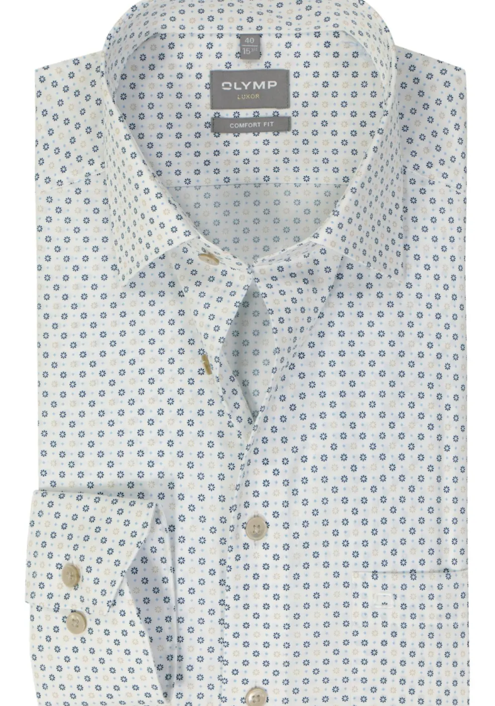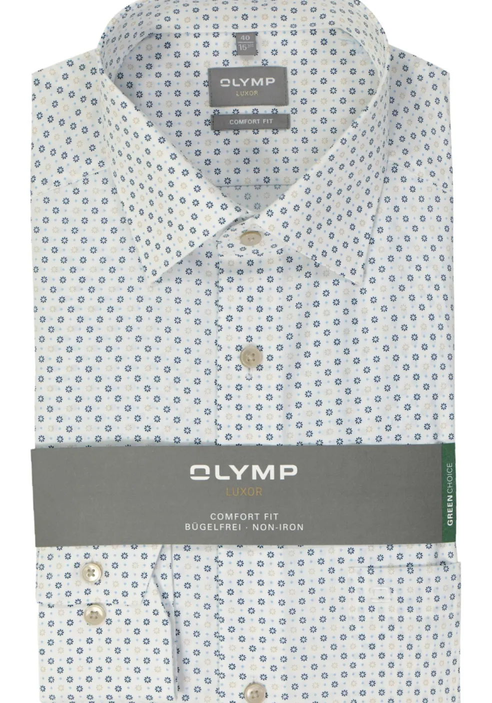 Beige OLYMP overhemd in een ongetailleerde comfort fit pasvorm. Het rechte model is prettig dragen bij een wat gevulder postuur, maar natuurlijk ook voor iedere man die houdt van een lekker ruim vallend shirt. Dit heren overhemd van OLYMP heeft lange mouwen in een standaard mouwlengte. Een heren overhemd van OLYMP met lange mouwen is ideaal voor iedere gelegenheid. De manchetten zijn in twee wijdtes te dragen waardoor ze makkelijk aan te passen zijn naar de eigen voorkeur. Door de uitvoering in een poplin weving is de stof glad, zacht, soepel en egaal. Dit is een van de meest gebruikte wevingen voor overhemden. Het shirt heeft een normale Kent kraag waarbij de boordpunten recht naar beneden wijzen en niet ver uit elkaar staan. Deze kraagvorm is ideaal om zo te dragen maar ook perfect te combineren met een stropdas. Door de speciale behandeling van de stof is dit hemd strijkvrij. Ideaal omdat er geen kreukels in komen tijdens het dragen en ook na het wassen hoeft het shirt niet gestreken te worden. Eventuele kreukels lopen er door de eigen lichaamswarmte uit. De borstzak op de linkerborst heeft een subtiel geborduurd logo. OLYMP Luxor comfort fit overhemden zijn ideaal voor de man die van een comfortabel overhemd houdt en graag goed gekleed voor de dag komt met deze prachtig uitgewerkte shirts.