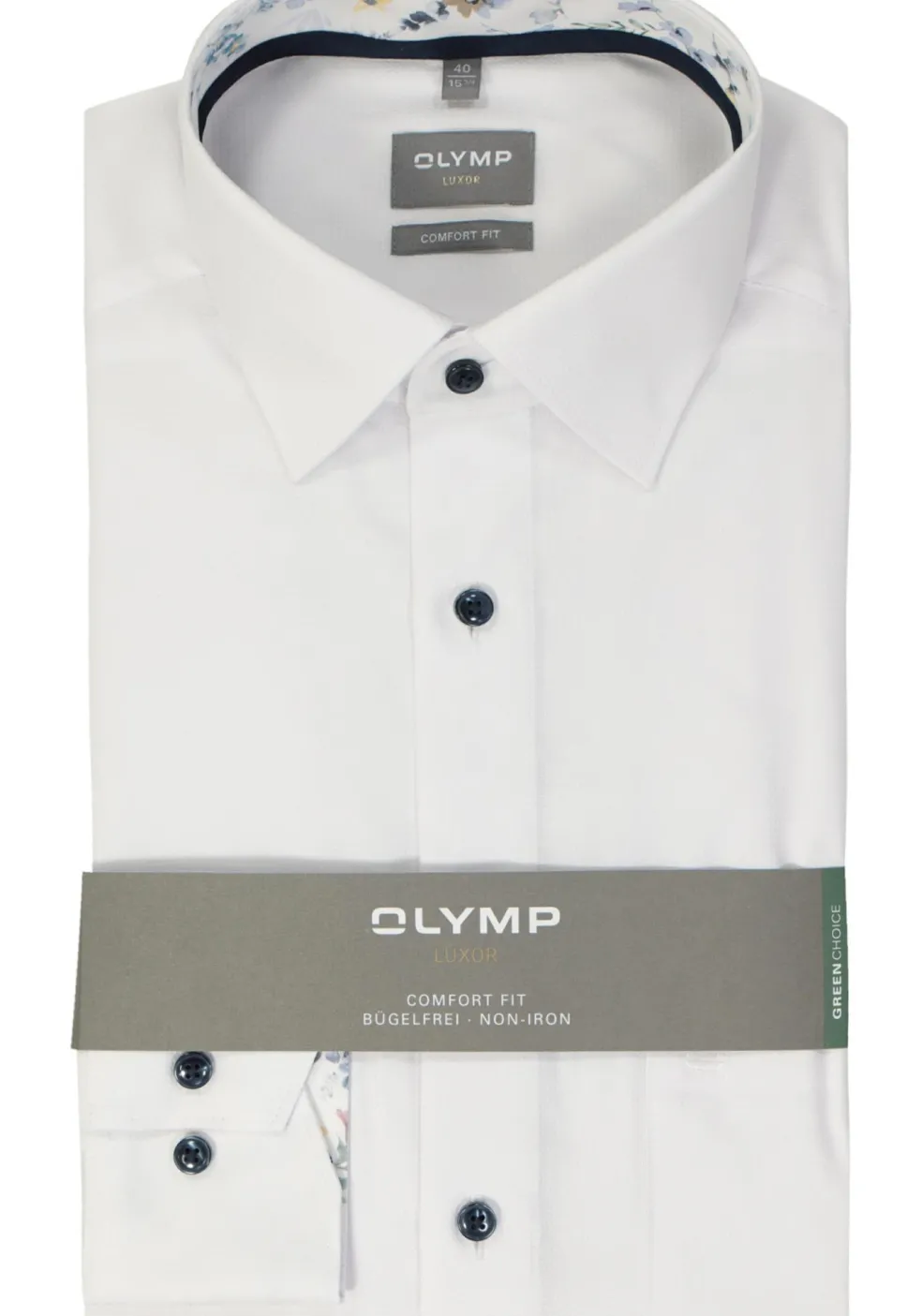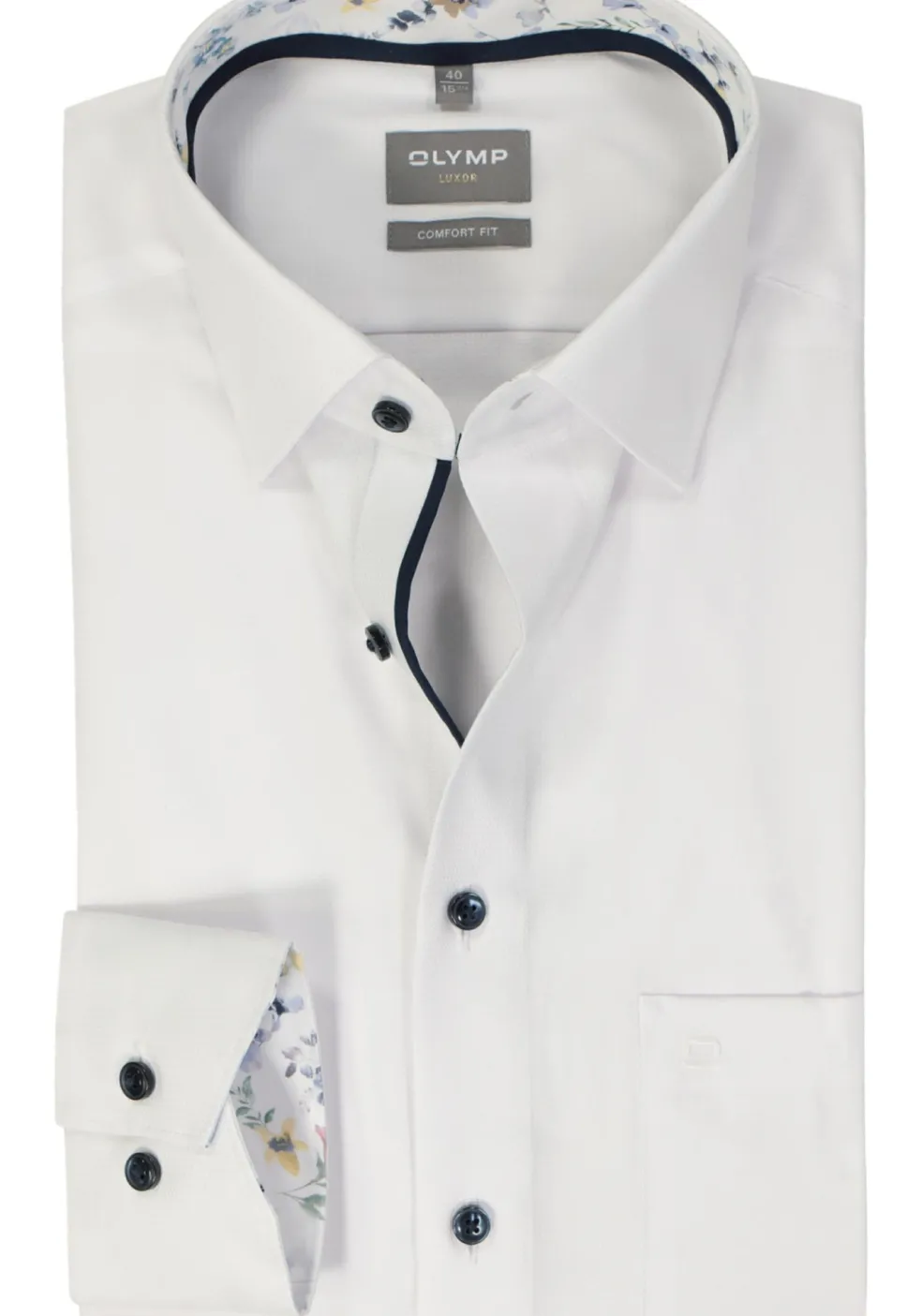 Wit OLYMP overhemd in een ongetailleerde comfort fit pasvorm. Het rechte model is prettig dragen bij een wat gevulder postuur, maar natuurlijk ook voor iedere man die houdt van een lekker ruim vallend shirt. Dit heren overhemd van OLYMP heeft lange mouwen in een standaard mouwlengte. Een heren overhemd van OLYMP met lange mouwen is ideaal voor iedere gelegenheid. De manchetten zijn in twee wijdtes te dragen waardoor ze makkelijk aan te passen zijn naar de eigen voorkeur. Door de uitvoering in een structuurweving zit er wat afwisseling in de stof voor een stijlvol resultaat. Het shirt heeft een normale Kent kraag waarbij de boordpunten recht naar beneden wijzen en niet ver uit elkaar staan. Deze kraagvorm is ideaal om zo te dragen maar ook perfect te combineren met een stropdas. Door de speciale behandeling van de stof is dit hemd strijkvrij. Ideaal omdat er geen kreukels in komen tijdens het dragen en ook na het wassen hoeft het shirt niet gestreken te worden. Eventuele kreukels lopen er door de eigen lichaamswarmte uit. De borstzak op de linkerborst heeft een subtiel geborduurd logo. OLYMP Luxor comfort fit overhemden zijn ideaal voor de man die van een comfortabel overhemd houdt en graag goed gekleed voor de dag komt met deze prachtig uitgewerkte shirts.