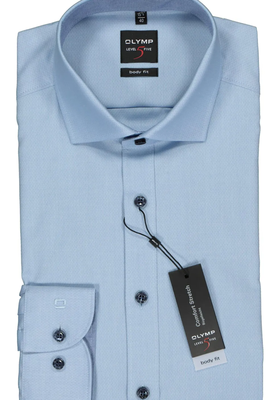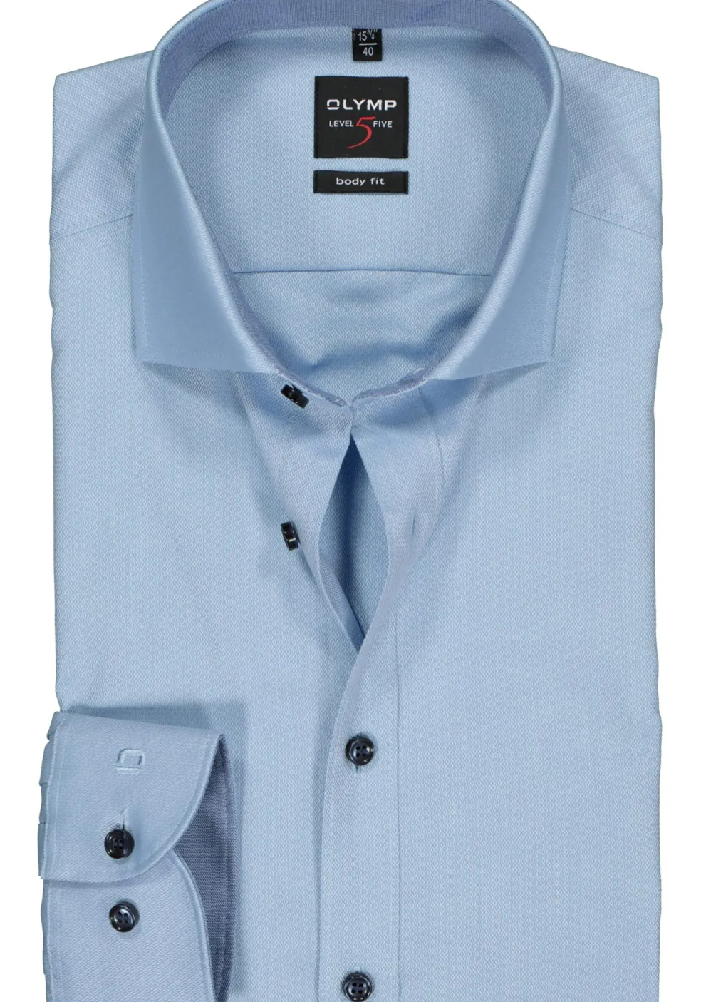 OLYMP Level 5 Body Fit overhemd met lange mouwen. Rustig lichtblauw structuur overhemd in een strak getailleerde uitvoering. De binnenkant van de boord van de royal Kent kraag is afgewerkt met een lichtblauwe Oxford geweven stof die ook weer terugkomt in de binnenkant van de manchetten. Level 5 overhemden hebben een strak getailleerde pasvorm en geen borstzak. Door de toevoeging van stretch aan het katoenen hemd draagt het heerlijk comfortabel en rekt het mee waar nodig. Het extra easy care materiaal heeft maar weinig onderhoud nodig en hoeft slechts licht gestreken te worden om perfect kreukloos te zijn.