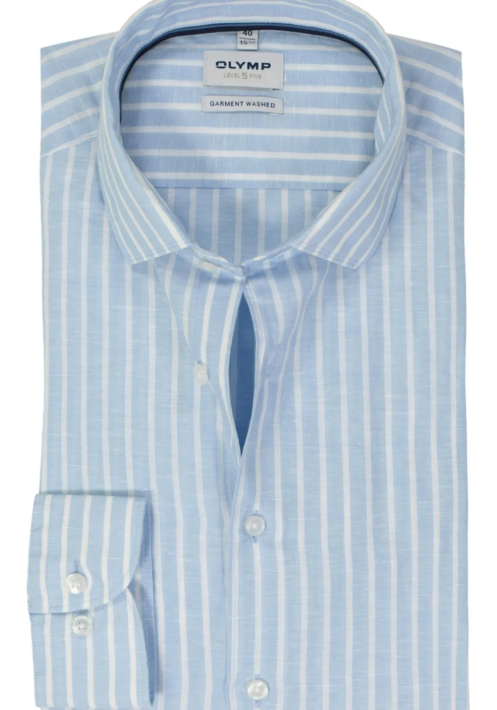 Lichtblauw OLYMP overhemd in een strak getailleerde body fit pasvorm met een moderne uitstraling door de aansluitende pasvorm en smaller gesneden mouwen. Dit heren overhemd van OLYMP heeft lange mouwen in een standaard mouwlengte. Een heren overhemd van OLYMP met lange mouwen is ideaal voor iedere gelegenheid. De manchetten zijn in twee wijdtes te dragen waardoor ze makkelijk aan te passen zijn naar de eigen voorkeur. Door de uitvoering in een poplin weving is de stof glad, zacht, soepel en egaal. Dit is een van de meest gebruikte wevingen voor overhemden. Het shirt heeft een normale Kent kraag waarbij de boordpunten recht naar beneden wijzen en niet ver uit elkaar staan. Deze kraagvorm is ideaal om zo te dragen maar ook perfect te combineren met een stropdas. De easy iron kwaliteit van de stof zorgt ervoor dat het slechts licht gestreken hoeft te worden voor een prachtig glad resultaat. Shirt zonder borstzak. OLYMP Level 5 overhemden vallen op door hun perfecte pasvorm en de moderne uitvoering met oog voor detail.