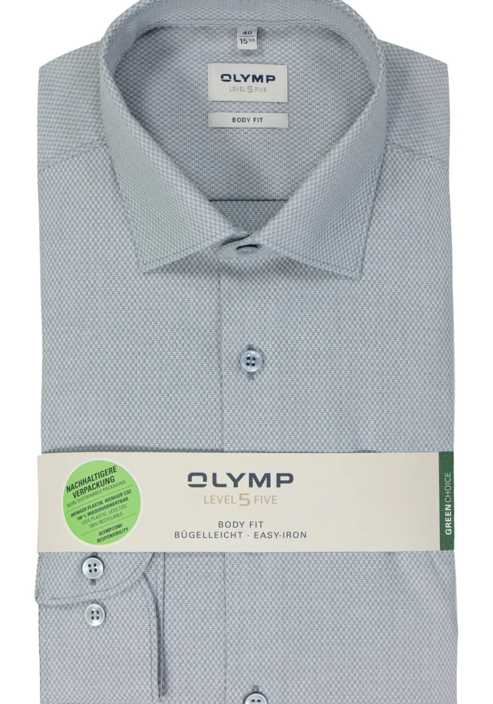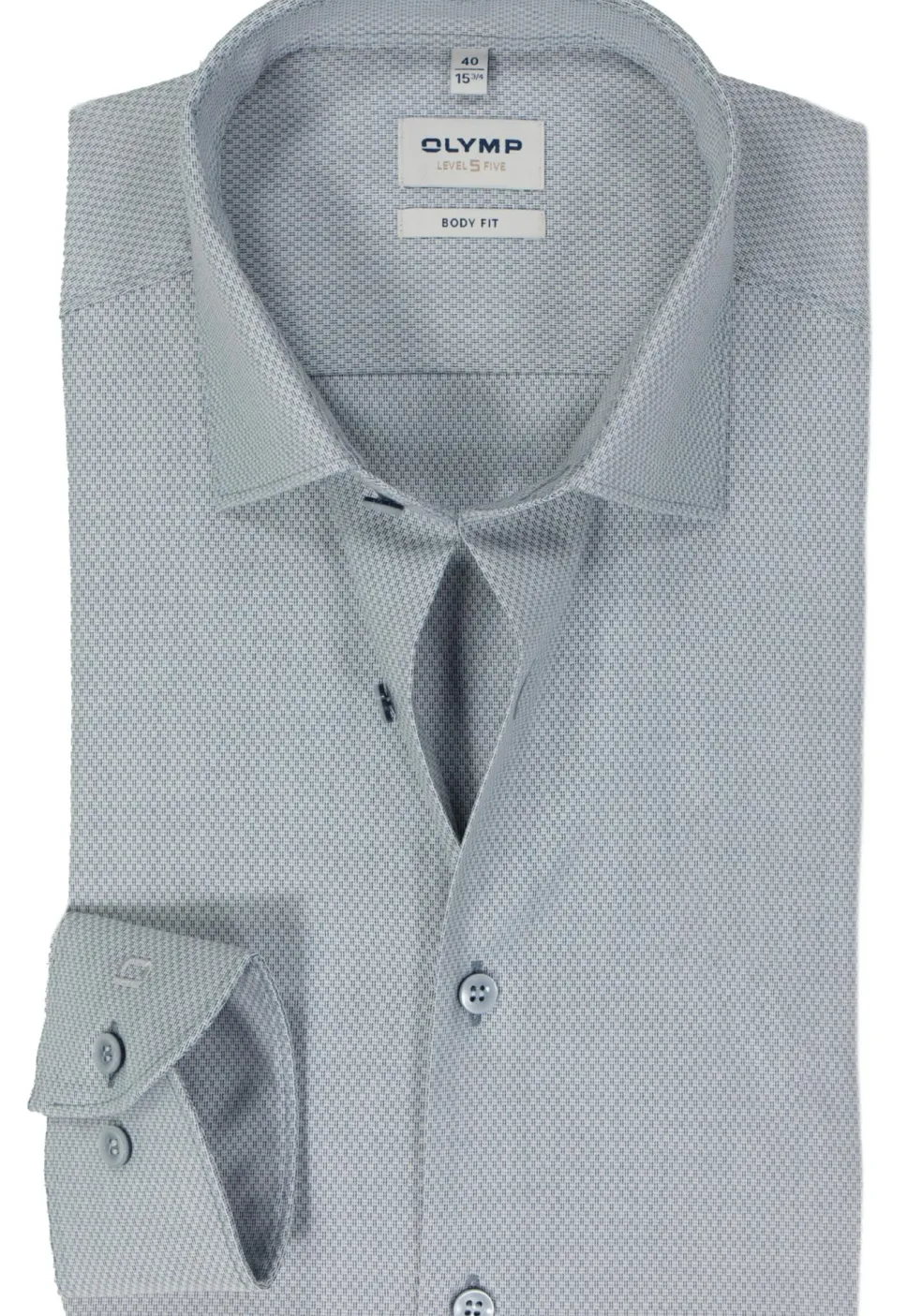 Blauw OLYMP overhemd in een strak getailleerde body fit pasvorm met een moderne uitstraling door de aansluitende pasvorm en smaller gesneden mouwen. Dit heren overhemd van OLYMP heeft lange mouwen in een standaard mouwlengte. Een heren overhemd van OLYMP met lange mouwen is ideaal voor iedere gelegenheid. De manchetten zijn in twee wijdtes te dragen waardoor ze makkelijk aan te passen zijn naar de eigen voorkeur. Door de uitvoering in een structuurweving zit er wat afwisseling in de stof voor een stijlvol resultaat. Het shirt heeft een normale Kent kraag waarbij de boordpunten recht naar beneden wijzen en niet ver uit elkaar staan. Deze kraagvorm is ideaal om zo te dragen maar ook perfect te combineren met een stropdas. De easy iron kwaliteit van de stof zorgt ervoor dat het slechts licht gestreken hoeft te worden voor een prachtig glad resultaat. Shirt zonder borstzak. OLYMP Level 5 overhemden vallen op door hun perfecte pasvorm en de moderne uitvoering met oog voor detail.