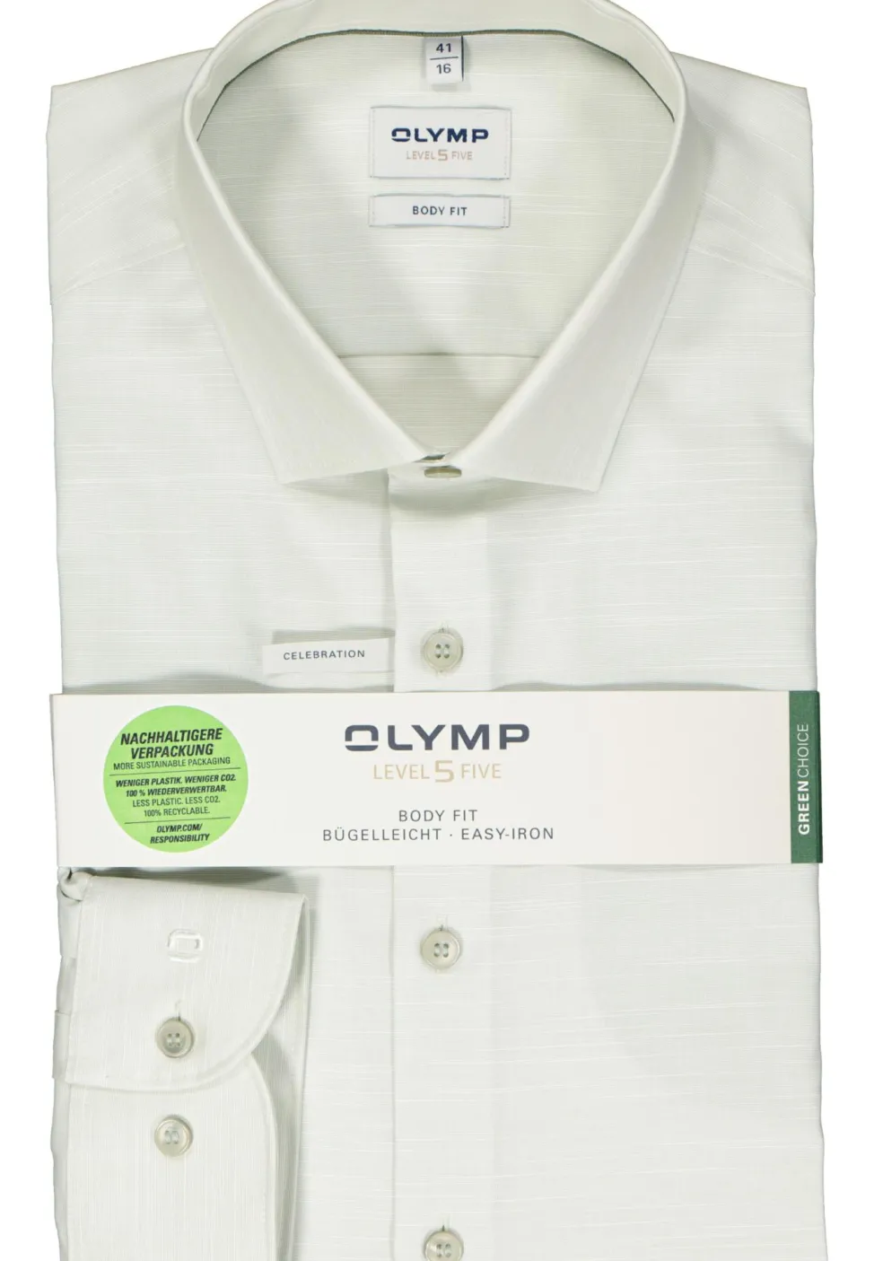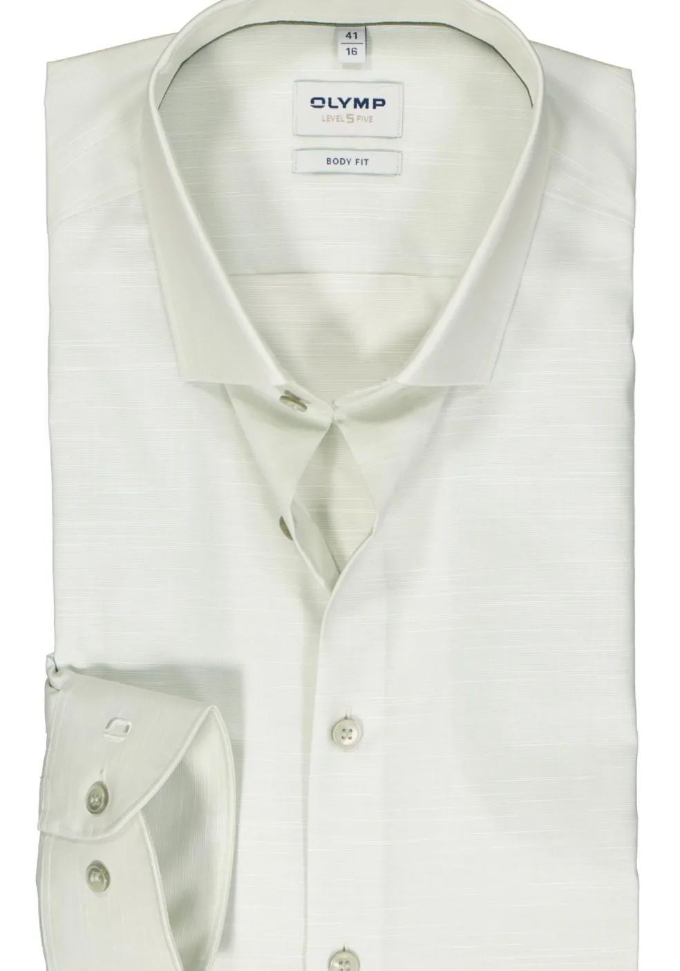 Olijfgroen OLYMP overhemd in een strak getailleerde body fit pasvorm met een moderne uitstraling door de aansluitende pasvorm en smaller gesneden mouwen. Dit heren overhemd van OLYMP heeft lange mouwen in een standaard mouwlengte. Een heren overhemd van OLYMP met lange mouwen is ideaal voor iedere gelegenheid. De manchetten zijn in twee wijdtes te dragen waardoor ze makkelijk aan te passen zijn naar de eigen voorkeur. Door de uitvoering in een structuurweving zit er wat afwisseling in de stof voor een stijlvol resultaat. Het shirt heeft een normale Kent kraag waarbij de boordpunten recht naar beneden wijzen en niet ver uit elkaar staan. Deze kraagvorm is ideaal om zo te dragen maar ook perfect te combineren met een stropdas. De easy iron kwaliteit van de stof zorgt ervoor dat het slechts licht gestreken hoeft te worden voor een prachtig glad resultaat. Shirt zonder borstzak. OLYMP Level 5 overhemden vallen op door hun perfecte pasvorm en de moderne uitvoering met oog voor detail.