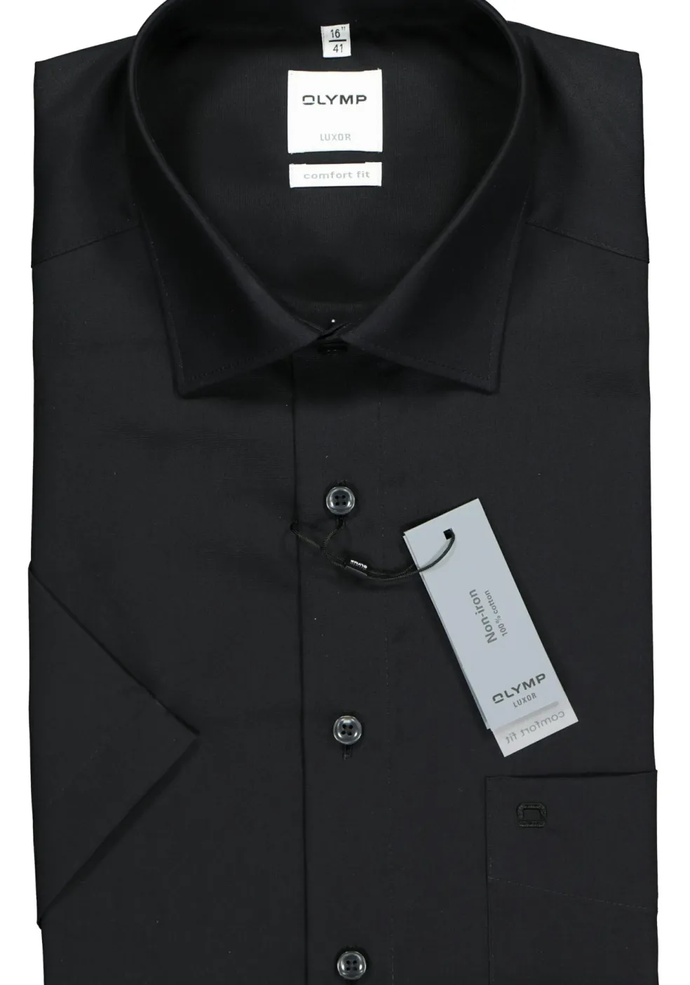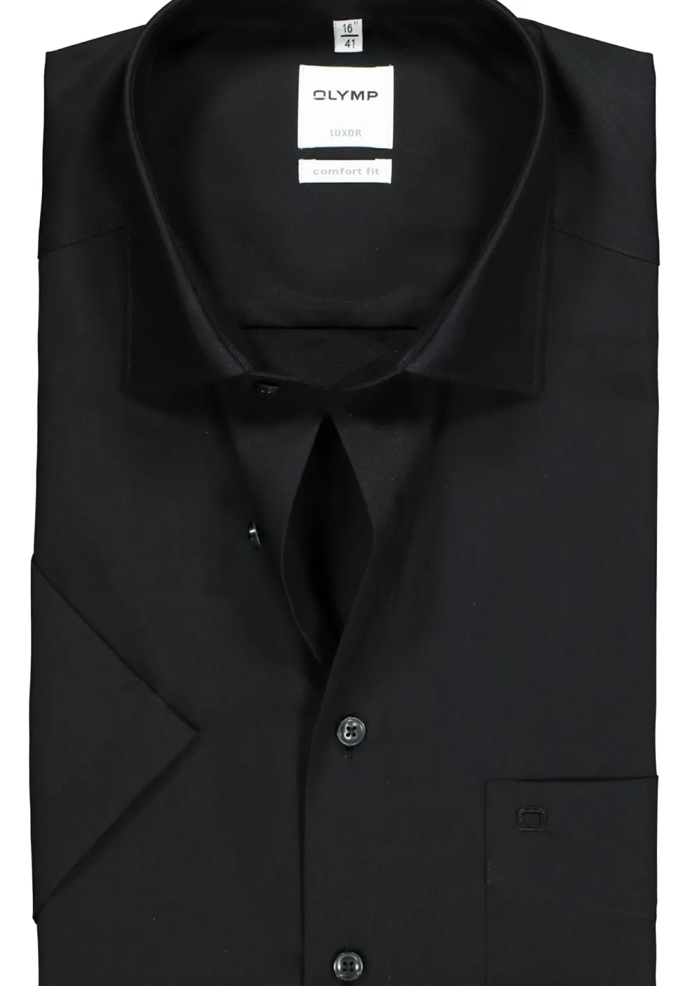 OLYMP Luxor comfort fit overhemd met korte mouwen. Dit zwarte overhemd met een heerlijk ruime pasvorm heeft korte mouwen en is strijkvrij. De kleur laat zich veelvuldig combineren en kan zowel zakelijk als in privé gelegenheden gedragen worden. Voorzien van een Kent kraag die met een zonder stropdas gedragen kan worden en een borstzak met subtiel logo borduursel. Dit recht gesneden model van OLYMP Luxor comfort fit is gemaakt van 100% katoen voor een comfortabel draagcomfort: ademend, maximale vochtopname en zacht voor de huid. Bijkomend voordeel is dat het overhemd niet gestreken hoeft te worden.