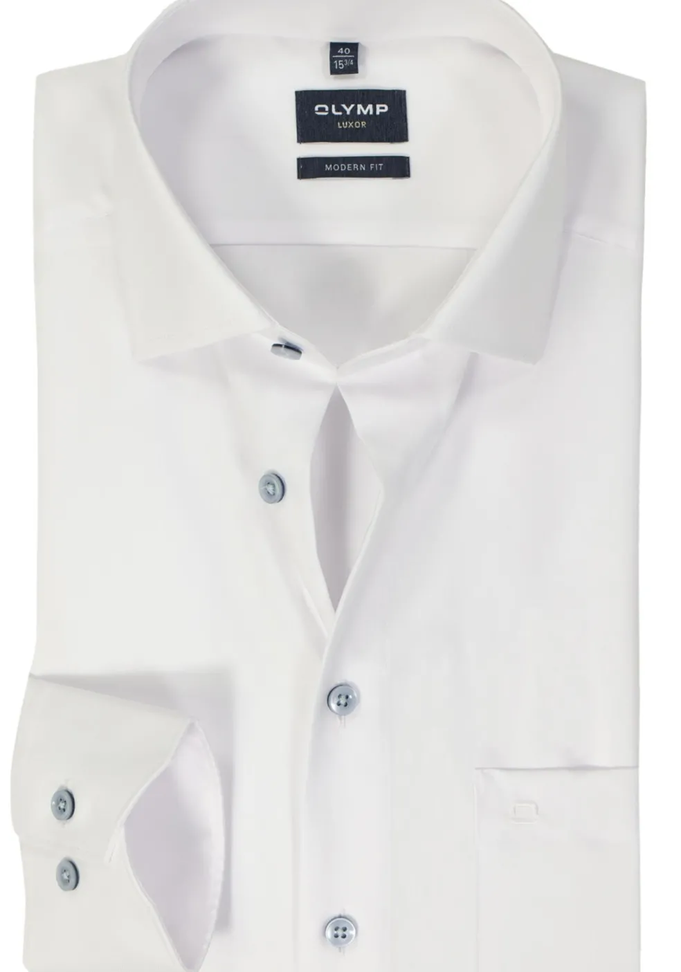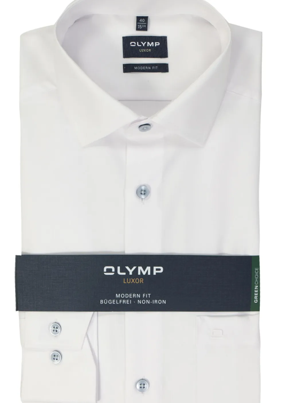 Wit OLYMP overhemd in een licht getailleerde modern fit pasvorm die strak genoeg is voor een moderne uitstraling en wijd genoeg is om lekker te zitten. Het is een pasvorm die geschikt is voor de meeste mannen en daardoor ook de meest verkochte pasvorm van OLYMP. Dit heren overhemd van OLYMP heeft lange mouwen in een standaard mouwlengte. Een heren overhemd van OLYMP met lange mouwen is ideaal voor iedere gelegenheid. De manchetten zijn in twee wijdtes te dragen waardoor ze makkelijk aan te passen zijn naar de eigen voorkeur. Door de uitvoering in een structuurweving zit er wat afwisseling in de stof voor een stijlvol resultaat. Het shirt heeft een normale Kent kraag waarbij de boordpunten recht naar beneden wijzen en niet ver uit elkaar staan. Deze kraagvorm is ideaal om zo te dragen maar ook perfect te combineren met een stropdas. Door de speciale behandeling van de stof is dit hemd strijkvrij. Ideaal omdat er geen kreukels in komen tijdens het dragen en ook na het wassen hoeft het shirt niet gestreken te worden. Eventuele kreukels lopen er door de eigen lichaamswarmte uit. De borstzak op de linkerborst heeft een subtiel geborduurd logo. OLYMP Luxor modern fit overhemden vallen op door hun perfecte pasvorm en de moderne uitvoering met oog voor detail.