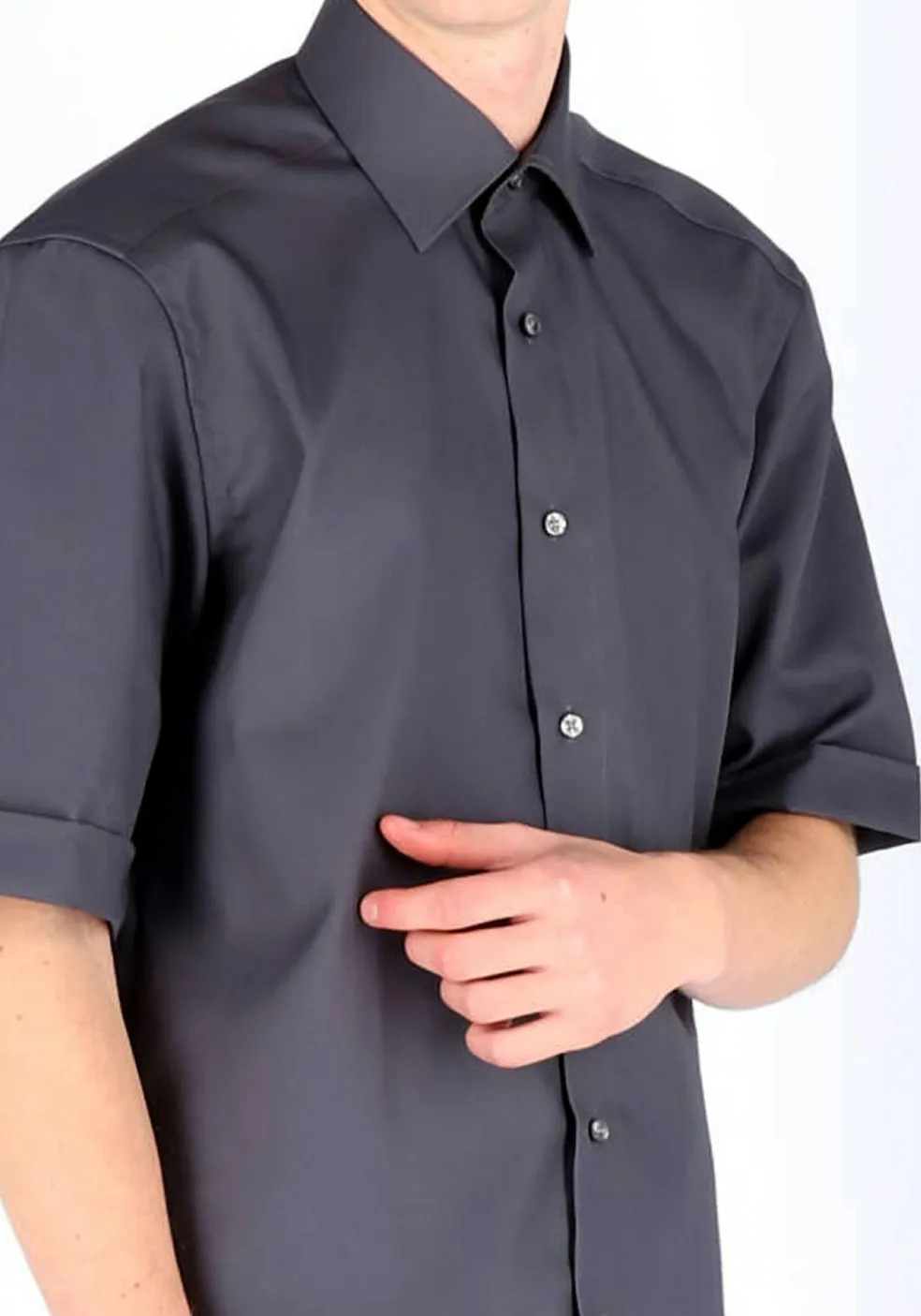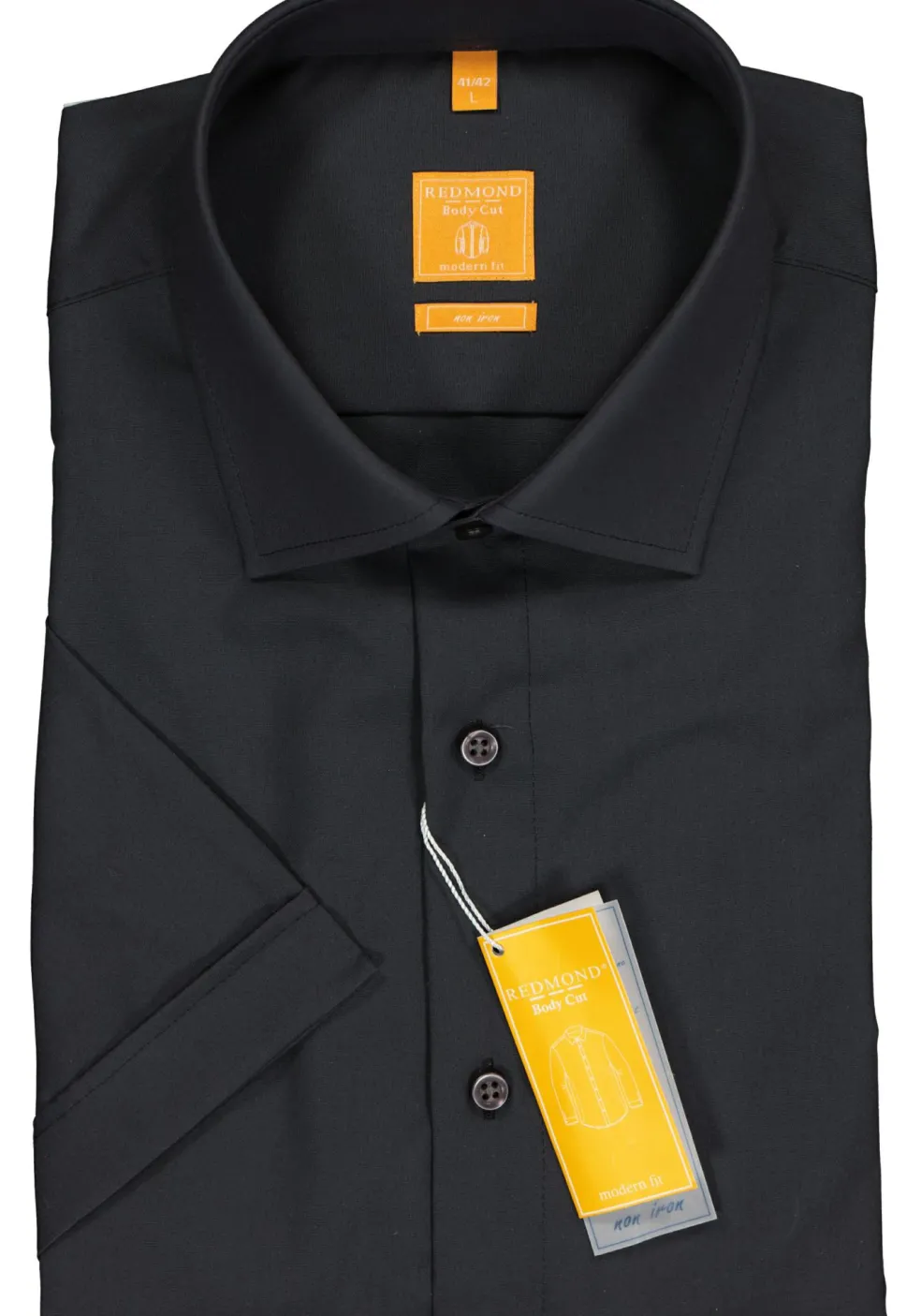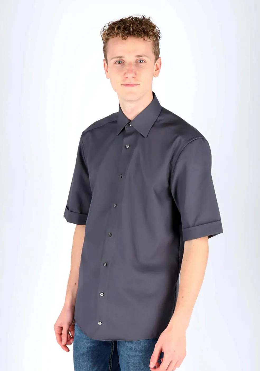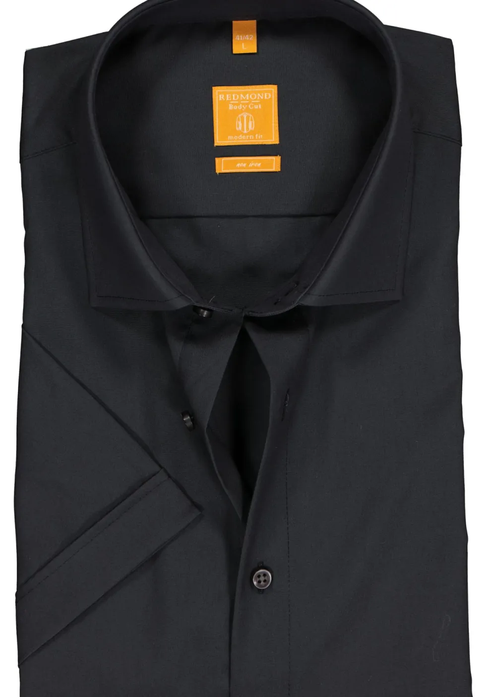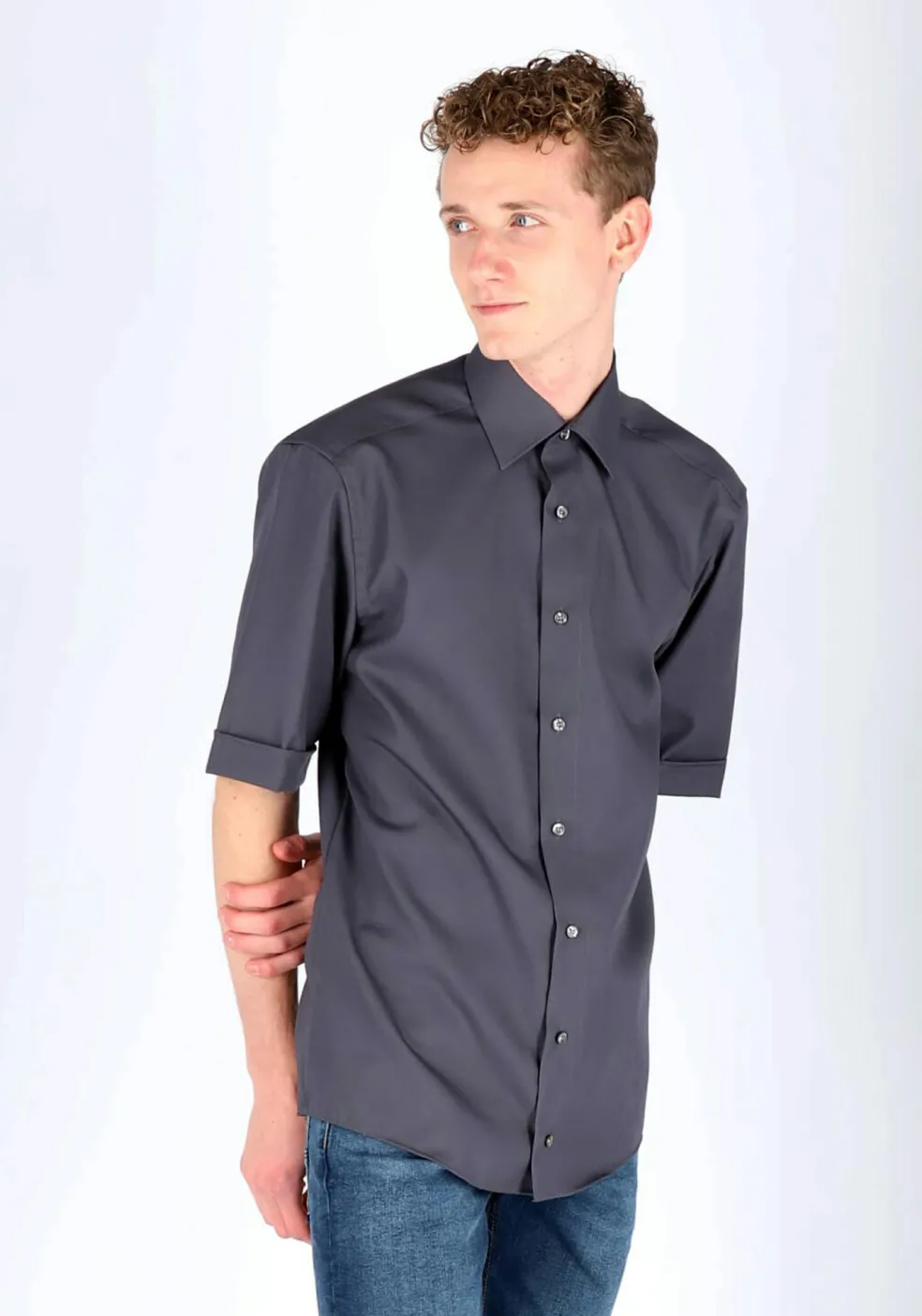 Donker grijs katoenen overhemd met korte mouwen in een licht getailleerde Redmond modern fit pasvorm. Dit overhemd is gemaakt van 100% strijkvriendelijk katoen in een polplin: heerlijk luchtig en hoeft na het wassen niet gestreken te worden. Trendy overhemd zonder borstzak en met een Kent kraag. Redmond shirts hebben een mooie prijs-kwaliteit verhouding die uitnodigen tot het aanvullen van uw garderobe.