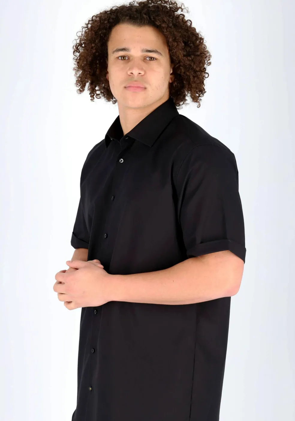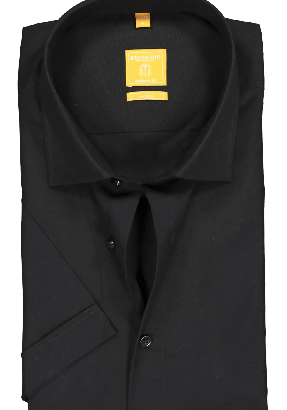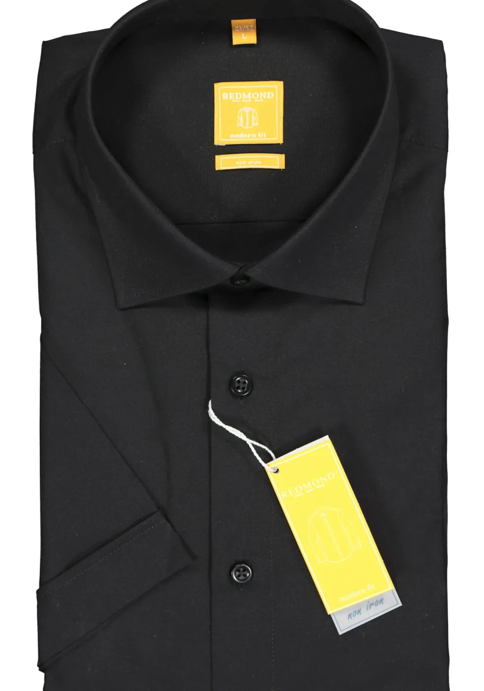 Zwart katoenen overhemd met korte mouwen in een licht getailleerde Redmond modern fit pasvorm. Dit overhemd is gemaakt van 100% strijkvriendelijk katoen in een polplin: heerlijk luchtig en hoeft na het wassen niet gestreken te worden. Trendy overhemd zonder borstzak en met een Kent kraag. Redmond shirts hebben een mooie prijs-kwaliteit verhouding die uitnodigen tot het aanvullen van uw garderobe.