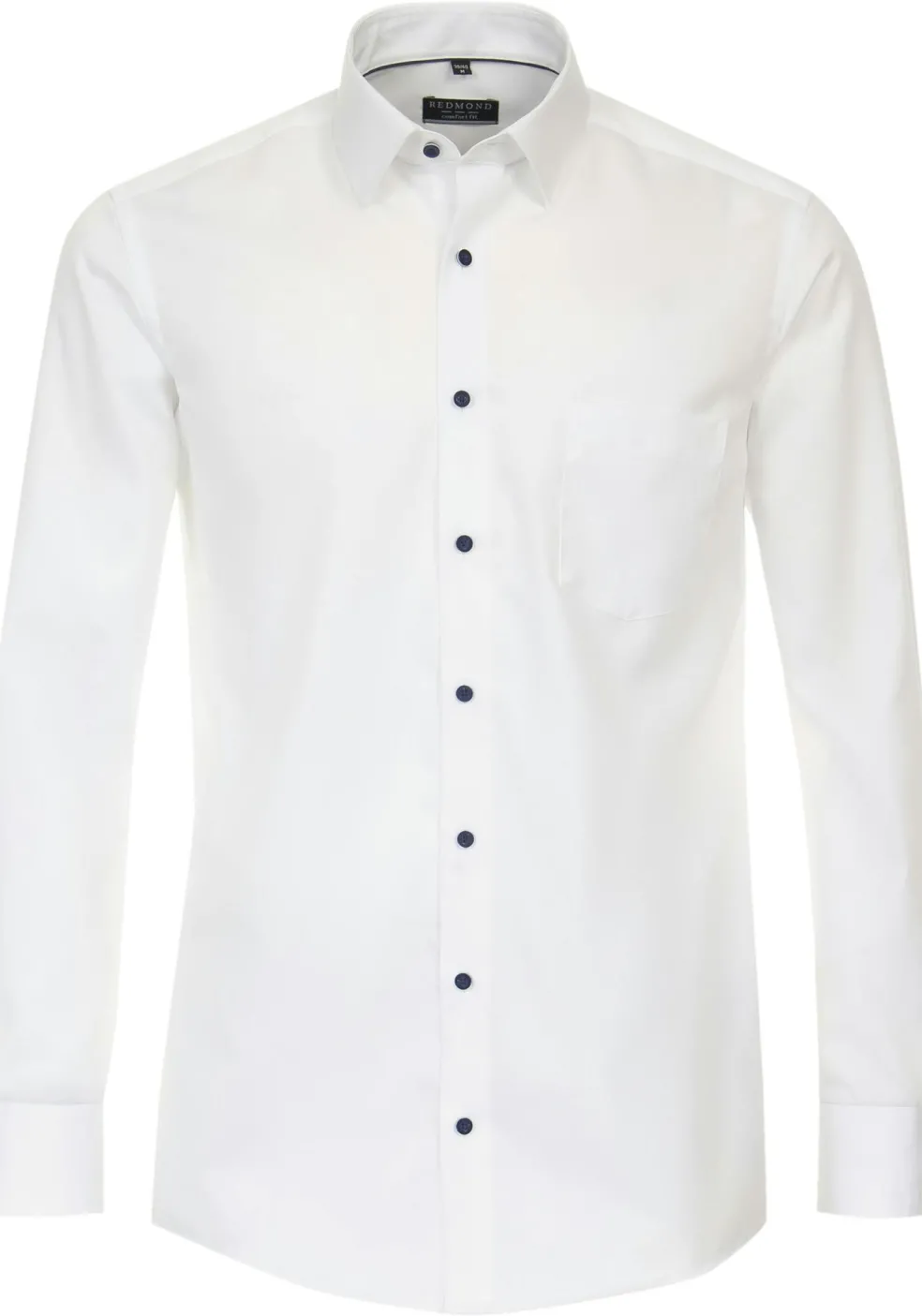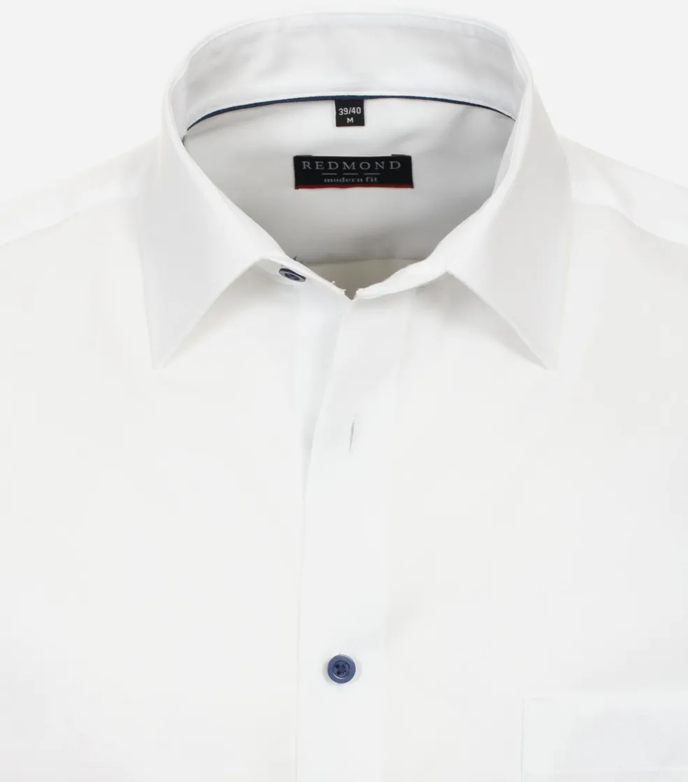 Overhemd met lange mouwen in een licht getailleerde Redmond modern fit pasvorm die niet heel wijd en niet heel strak is en daarmee geschikt is voor veel mannen. De verstelbare manchetten hebben twee knoopjes zodat u zelf de juiste wijdte in kan stellen. Dit heren overhemd van Redmond heeft lange mouwen in een standaard mouwlengte. Het shirt heeft een normale Kent kraag waarbij de boordpunten recht naar beneden wijzen en niet ver uit elkaar staan. Het is de meest gebruikte kraagvorm en ideaal om zo te dragen maar ook perfect te combineren met een stropdas. Door de uitvoering in een poplin weving is de stof glad, zacht, soepel en egaal. Dit is een van de meest gebruikte wevingen voor overhemden. De easy iron kwaliteit van de stof zorgt ervoor dat het slechts licht gestreken hoeft te worden voor een prachtig glad resultaat. De handige borstzak op de linkerborst heeft een subtiel geborduurd logo.