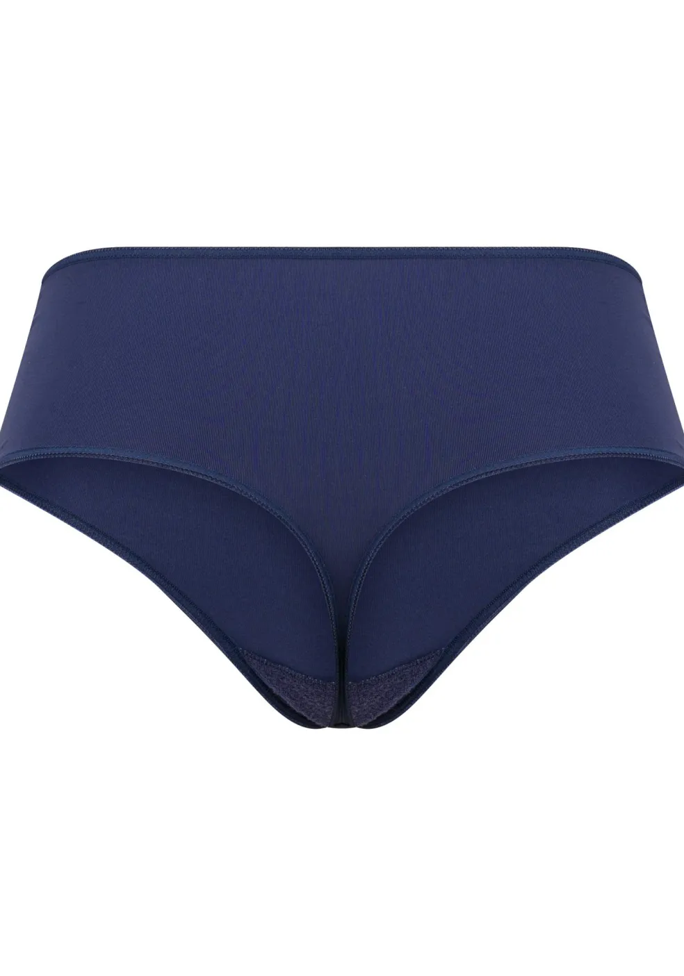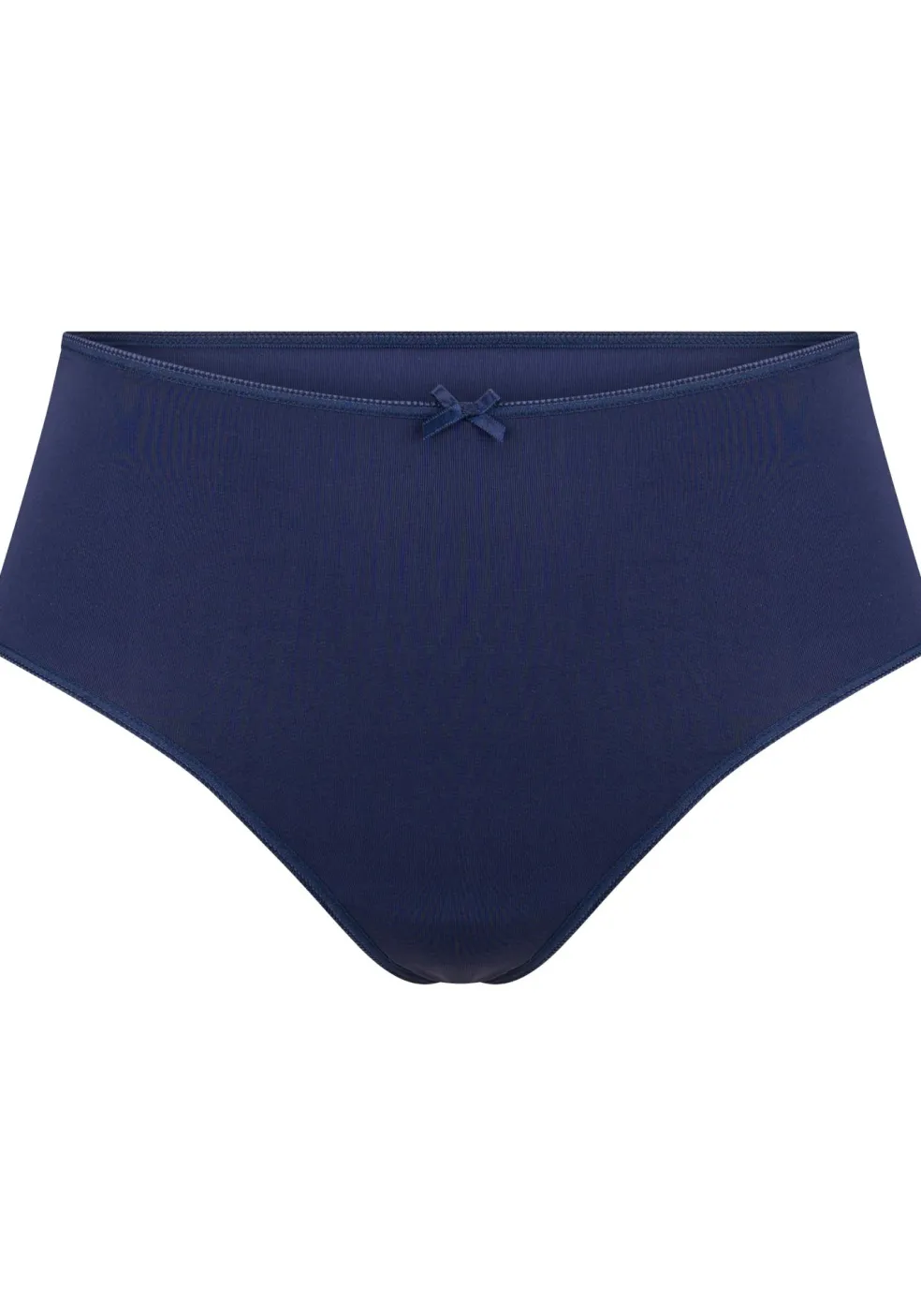 Donkerblauwe RJ Pure Color dames string van glad en super elastsich microfiber in een taillehoog model, welke is afgewerkt met een zacht satijnbiesje en strikje.