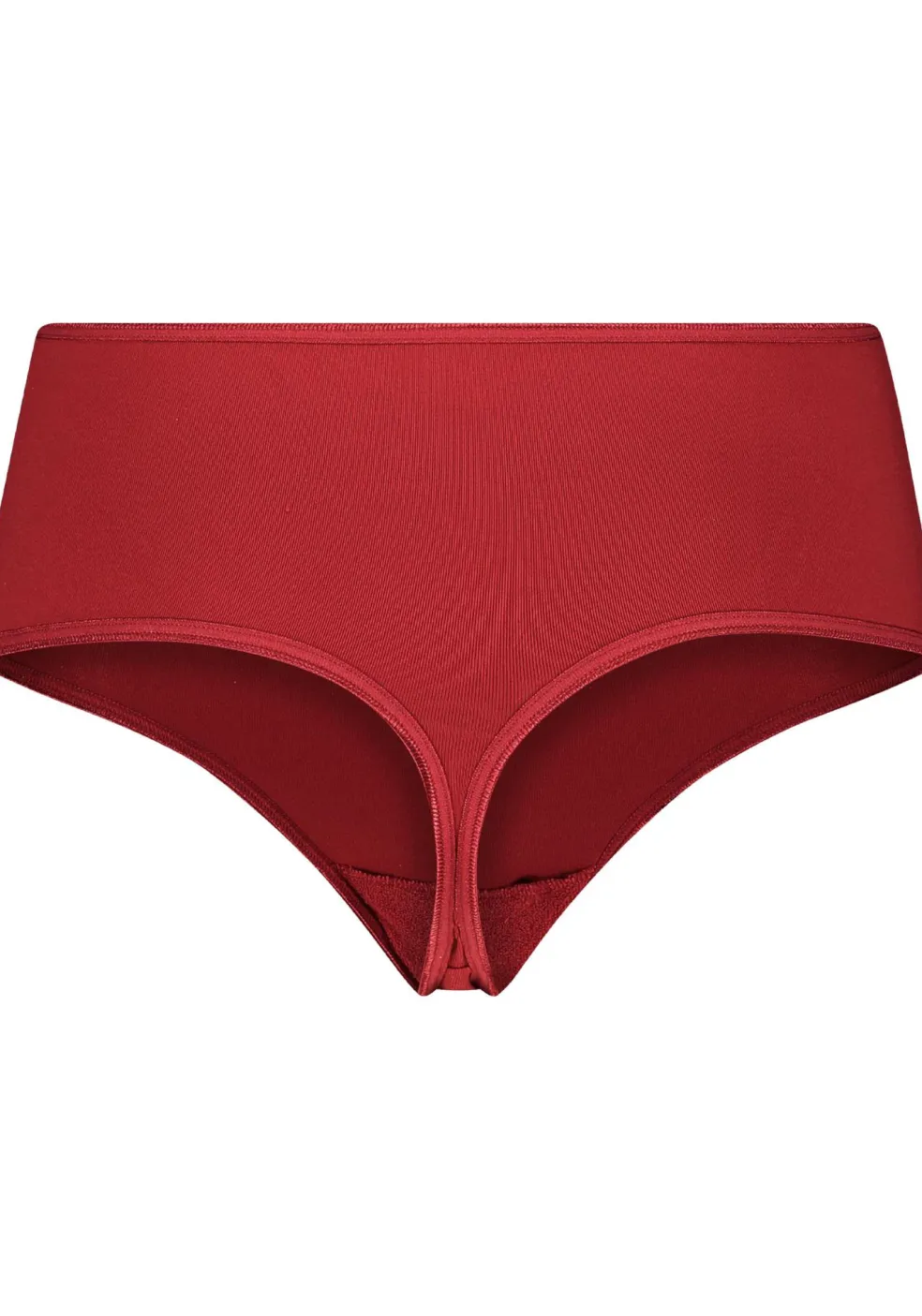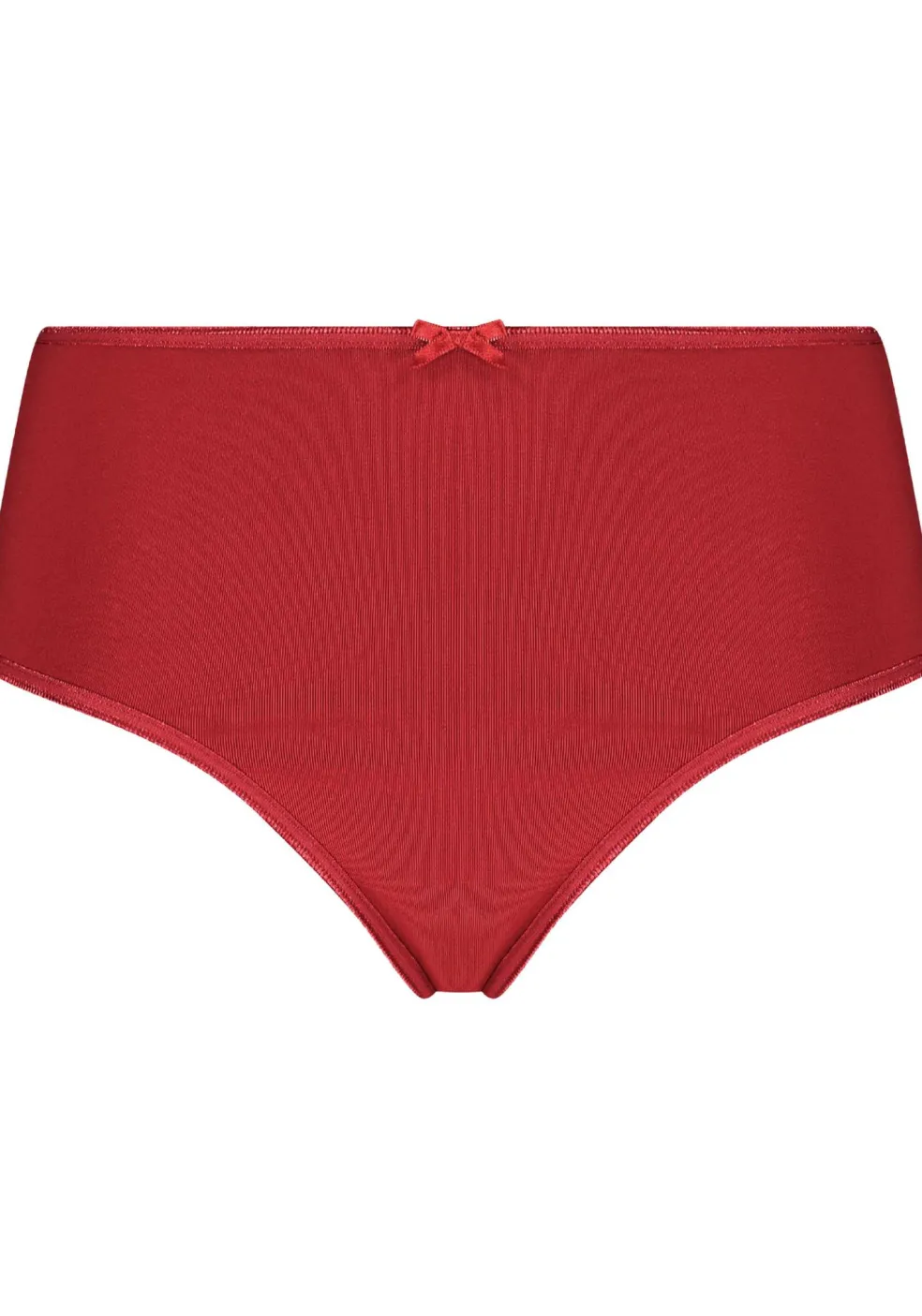 Donkerrode RJ Pure Color dames string van glad en super elastsich microfiber in een taillehoog model, welke is afgewerkt met een zacht satijnbiesje en strikje.