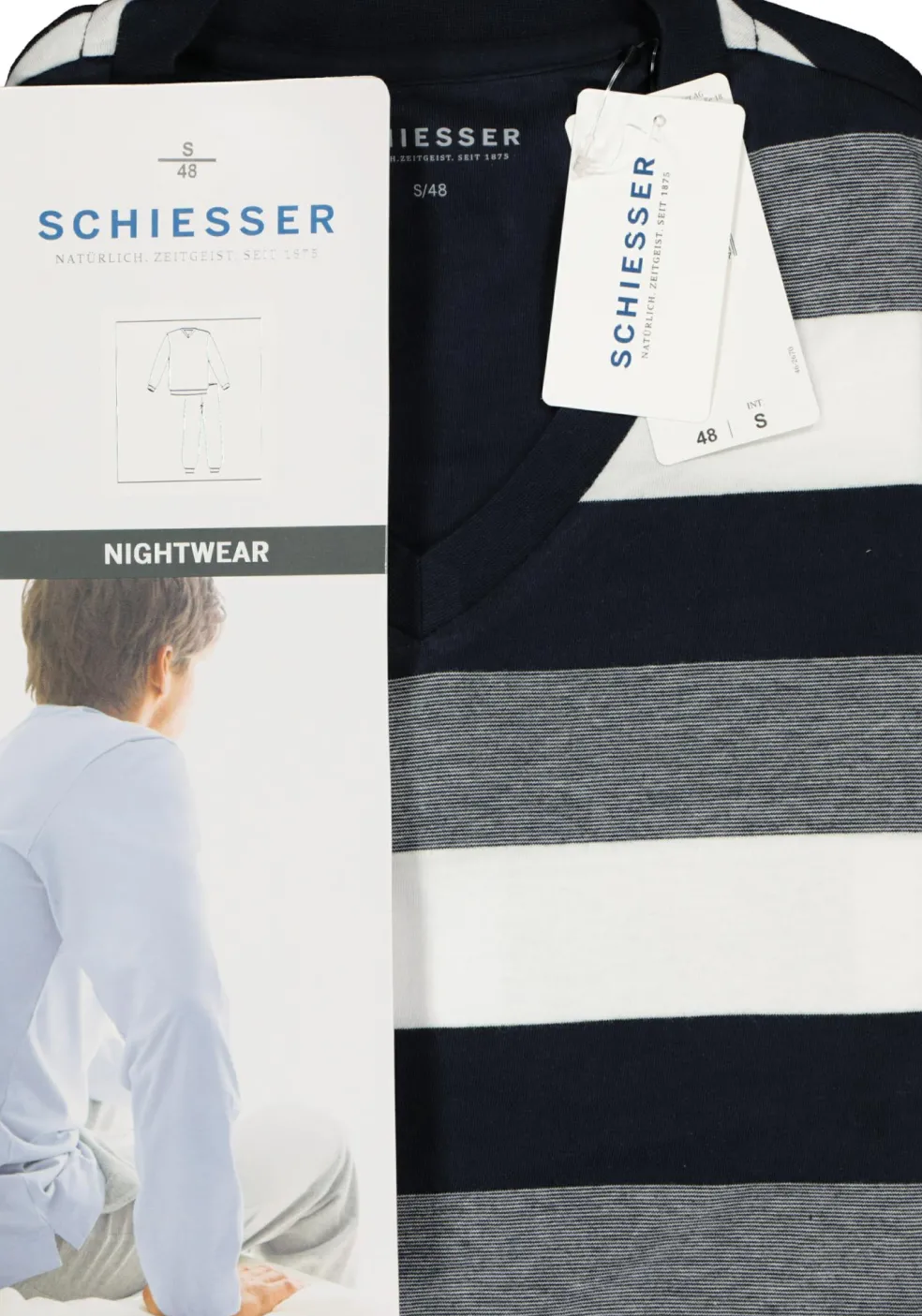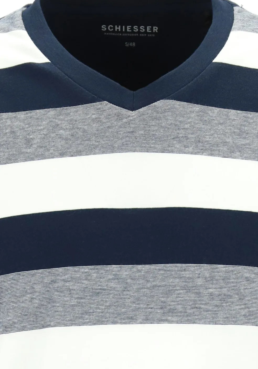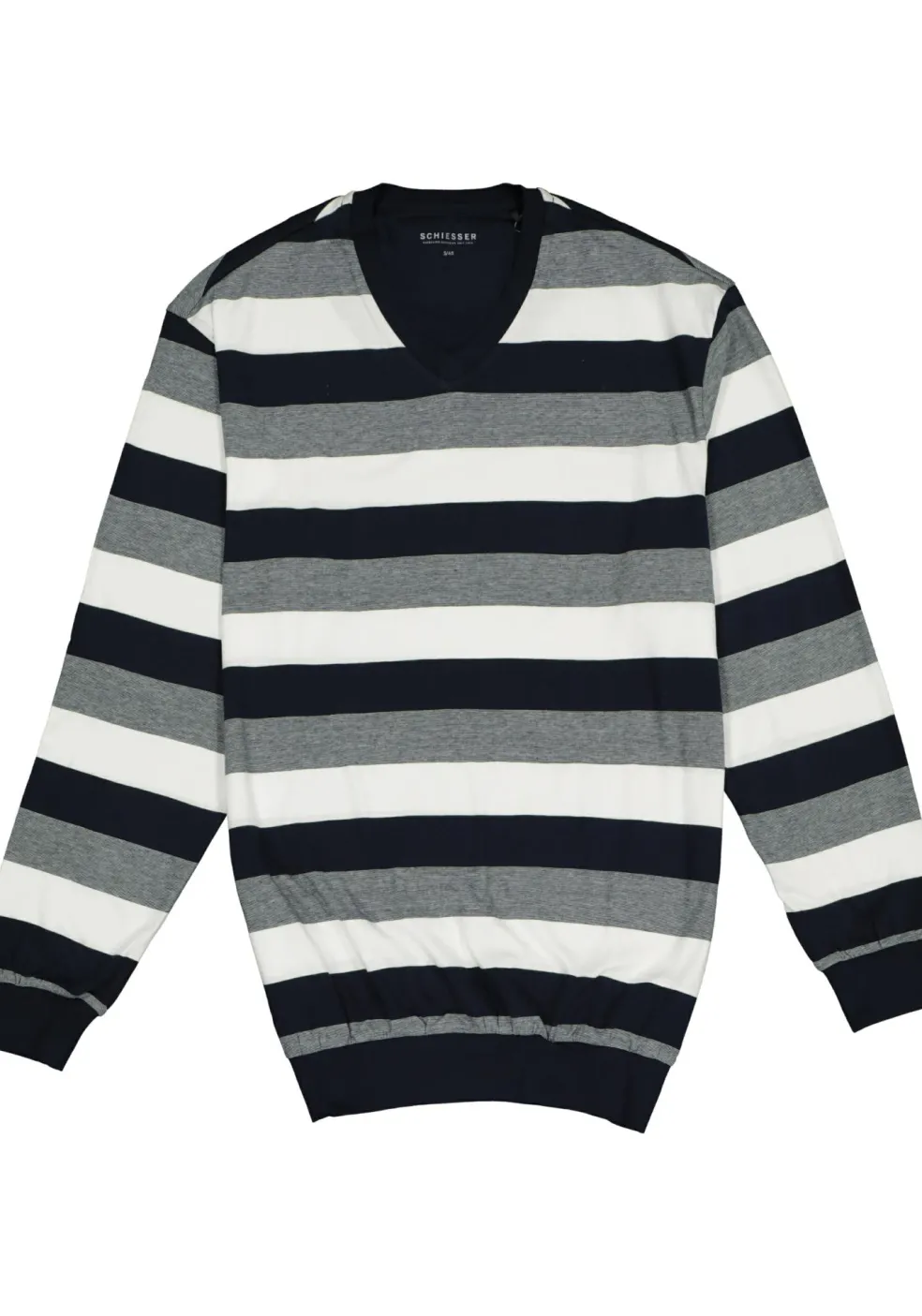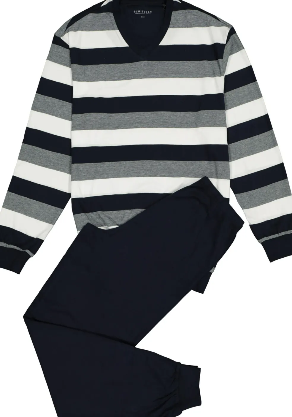 Blauw met wit en grijs gestreepte katoenen SCHIESSER heren pyjama set met een lange broek en een shirt met een V-hals en lange mouwen. Deze pyjama heeft een gestreept shirt in een niet te ontkennen streep. De broek is donkerblauw, net als de boorden van het shirt. Deze set heeft boorden bij de mouwen, onderkant van het shirt en de pijpen. Gemaakt van 100% katoenen tricot voor maximaal draagcomfort. De pyjama’s van SCHIESSER vallen ruim, dus als u tussen twee maten in zit dan kunt u het beste voor de kleinere maat kiezen.