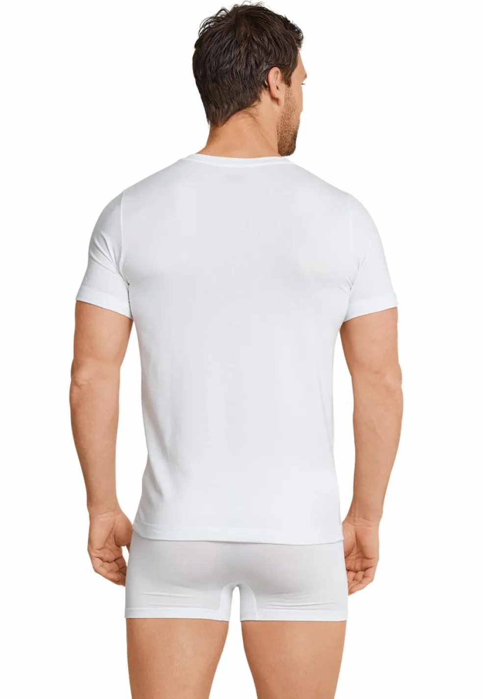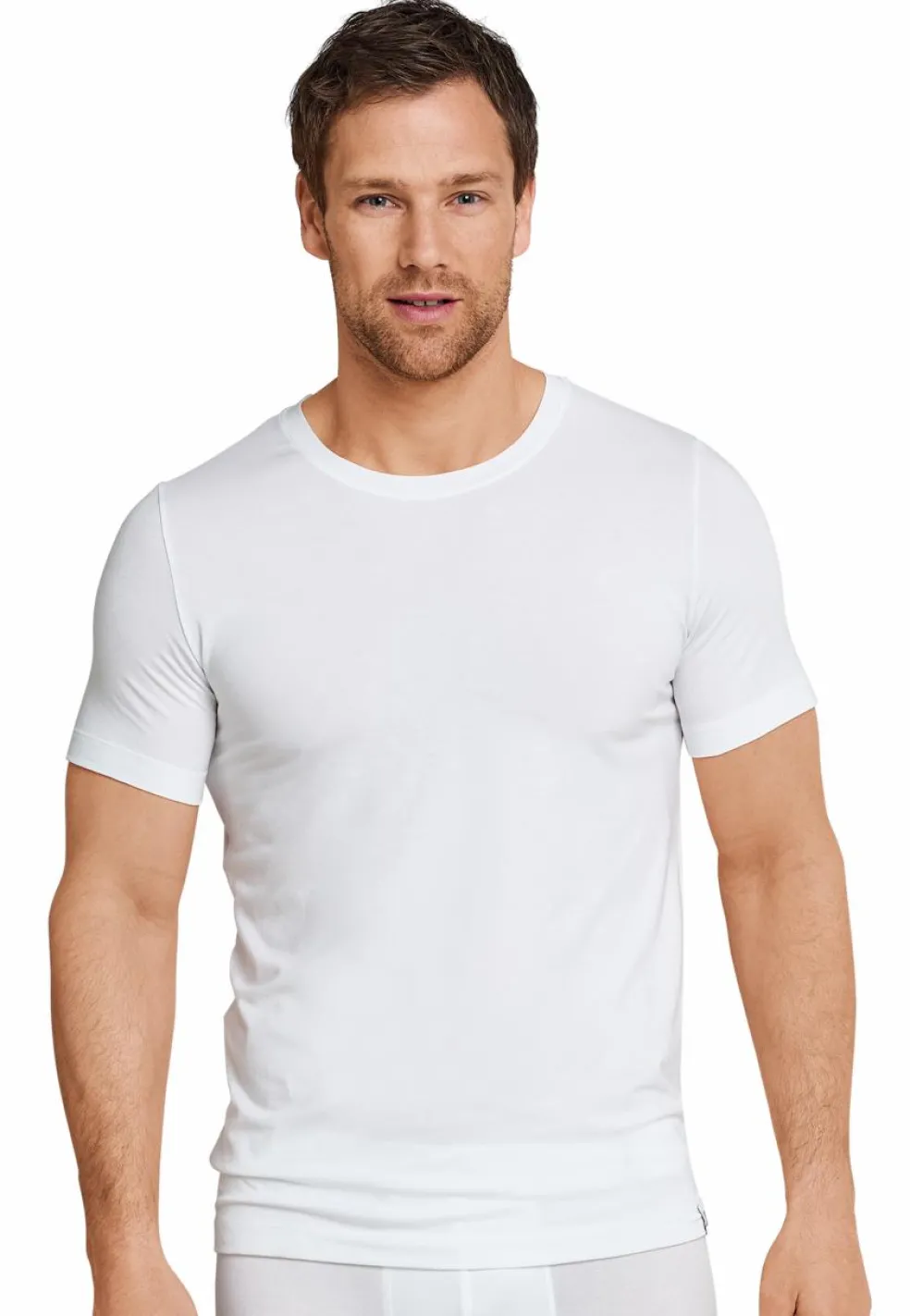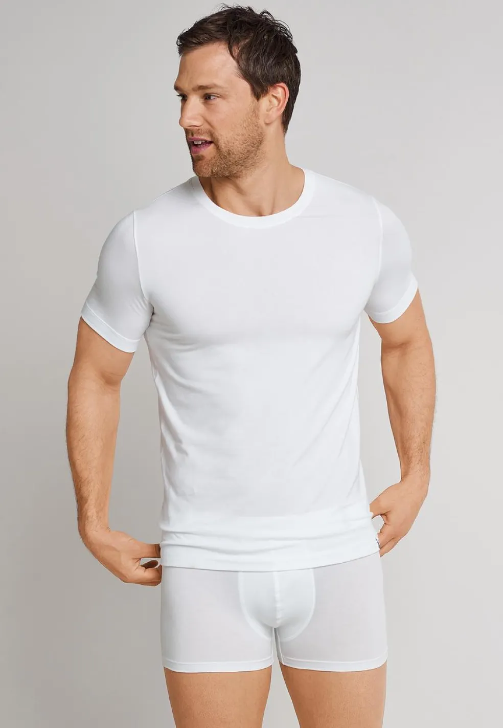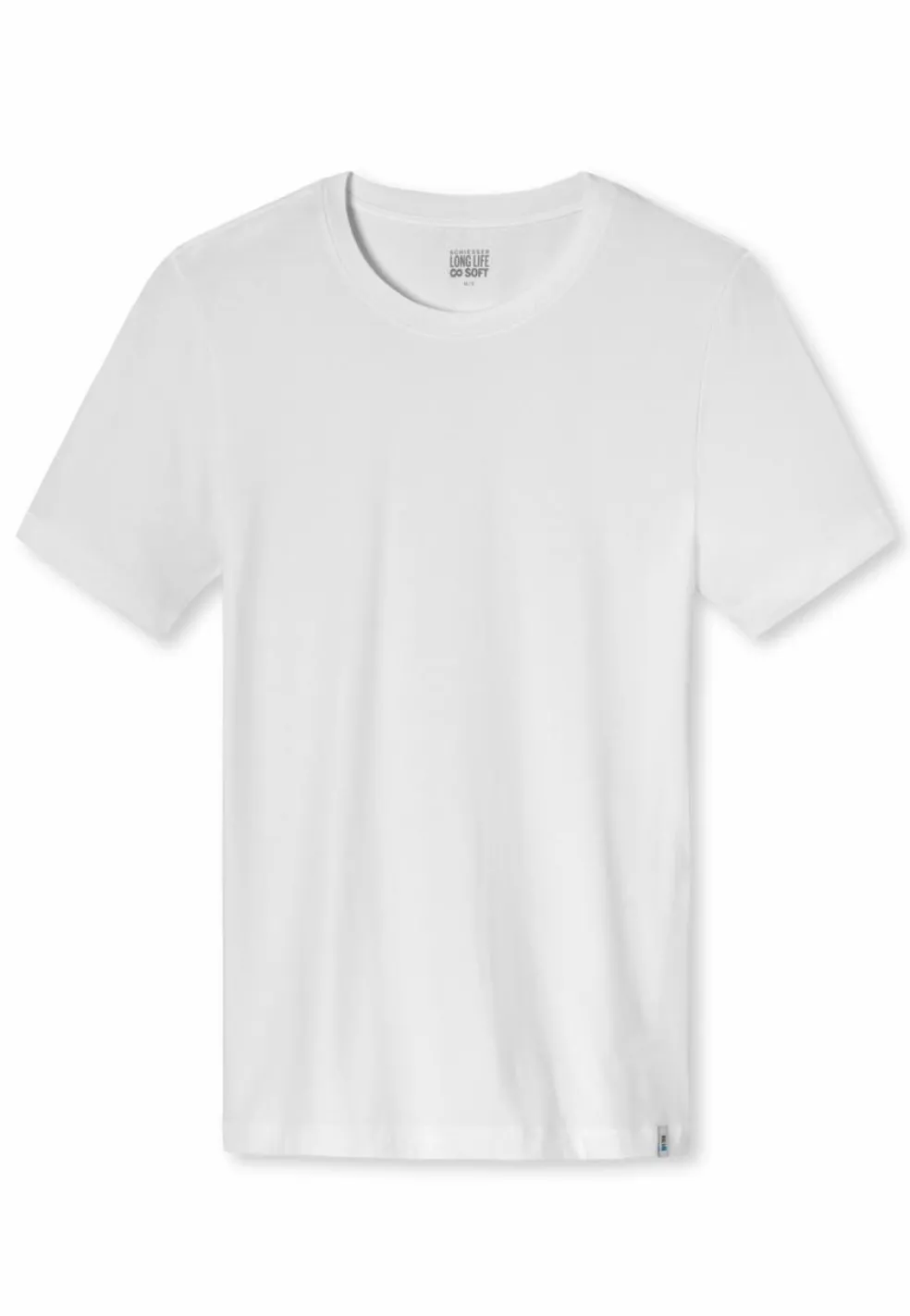 Wit shirt met korte mouwen en ronde hals voor heren, uit de SCHIESSER-serie Long Life Soft. Optimaal vochtbeheer dankzij een evenwichtig micromodalgehalte. Hoge kwaliteit en duurzaamheid door unieke ReaLasting Cotton-behandeling. Perfecte pasvorm en vormvastheid dankzij 10% elastaan. Van hoogwaardige, elastische single jersey-kwaliteit.
