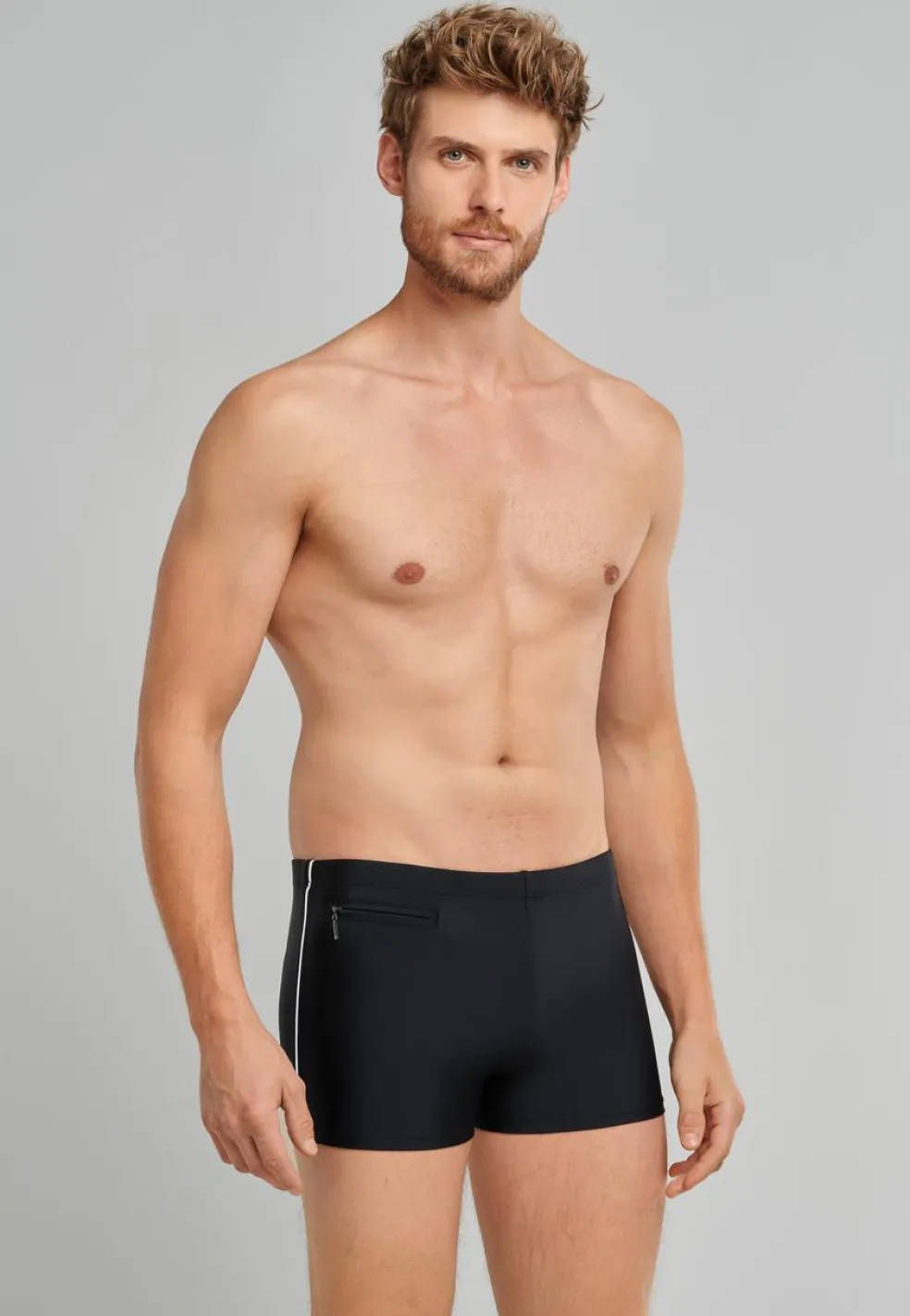 Zwarte, nauwsluitende herenzwemshort met witte strepen aan de zijkanten. Uit de SCHIESSER-badcollectie Aqua “Nautical Casual”. Klein vak met ritssluiting – perfect voor het veilig opbergen van kleingeld of een sleutel. Flexibel intern koord voor een optimale pasvorm. Met comfortabele binnenvoering. Gemaakt van gerecycled, vormvast, elastisch tricot.