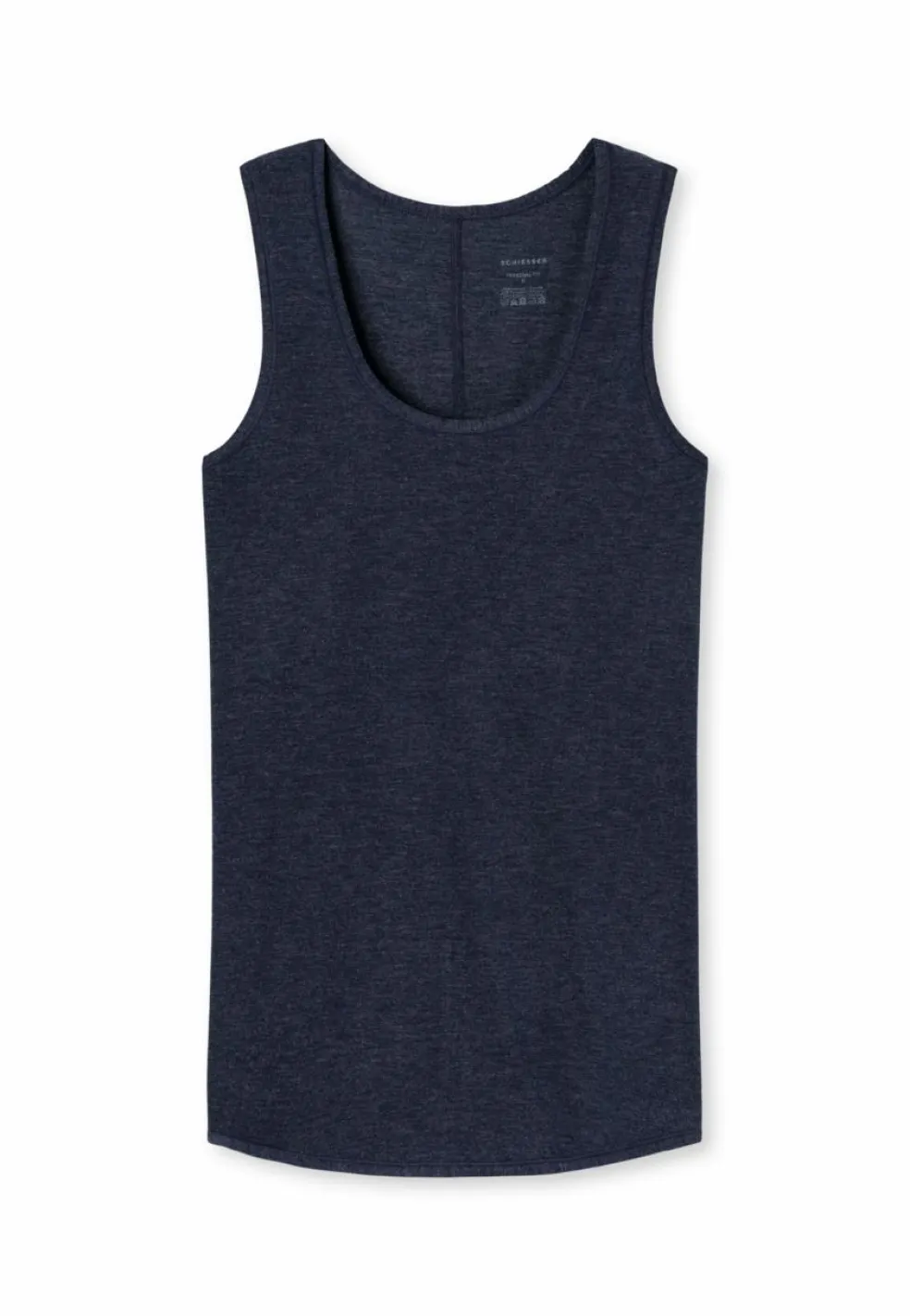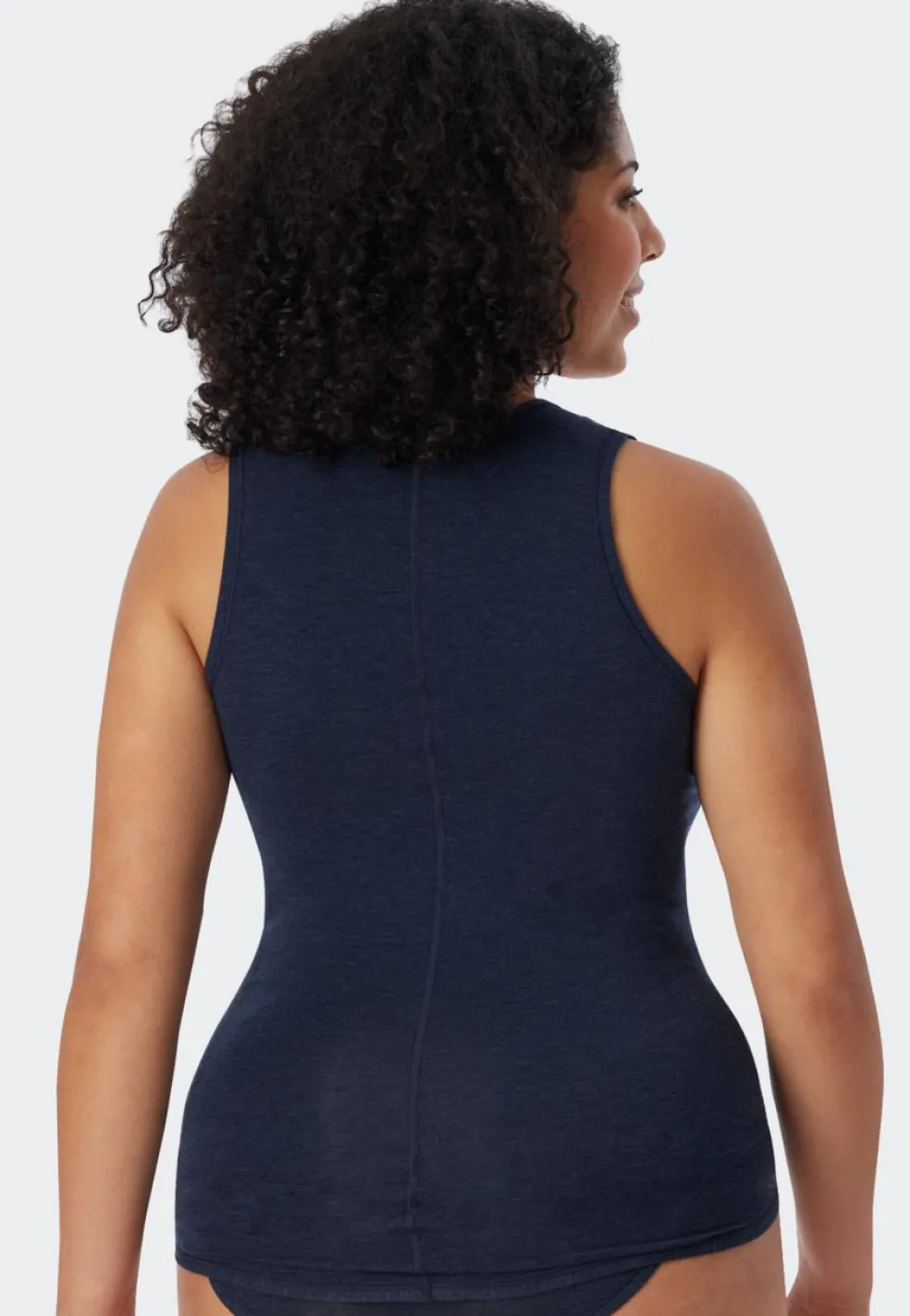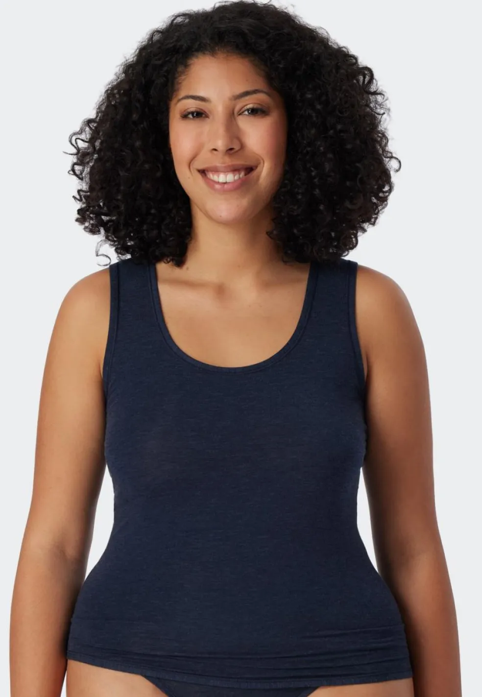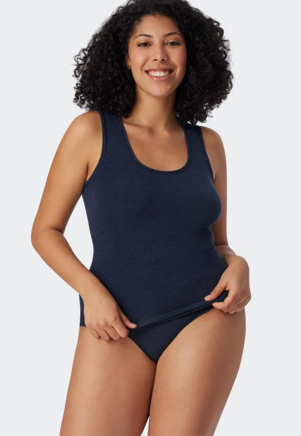 Nachtblauwe Tank Top voor dames, uit de SCHIESSER-serie Personal Fit. Zonder zijnaden voor een hoog draagcomfort. Zit heerlijk zacht als een tweede huid en past zich vlot aan elke beweging aan. Perfect vochtregulerend, ademend en vormvast. Van superelastische, hoogwaardige single jersey-kwaliteit.