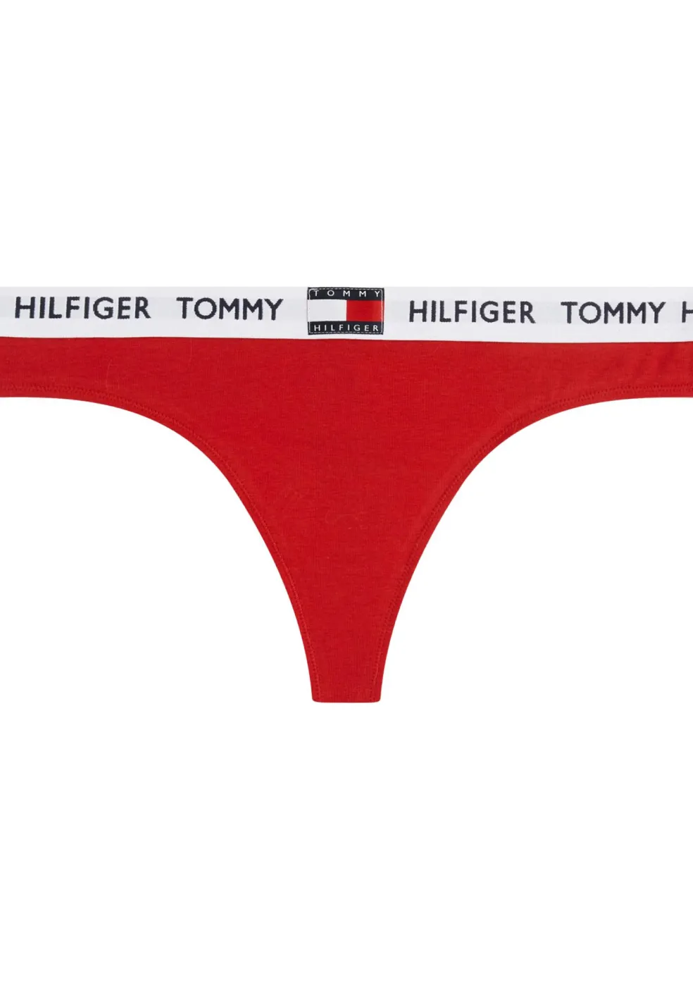 Rode Tommy 85 damesstring van biologisch katoen met stretch en een herhalend logo op de elastische tailleband. Een string die opvalt door de elastische witte tailleband met herhalend Tommy Hilfiger-logo in het donkerblauw en de Tommy Hilfiger-vlagpatch middenvoor op de tailleband. Model dat middelhoog op de taille valt en een vrij hoge beenuitsnijding heeft. Sportief ogende string die perfect te combineren is met de tops uit dezelfde lijn. Te bestellen in de drie kleuren van het Tommy Hilfiger logo: rood, wit en blauw.