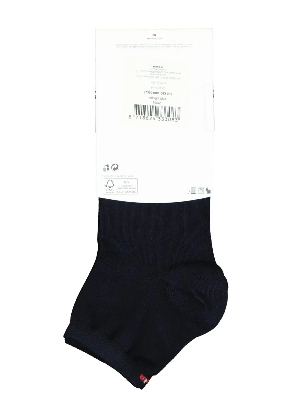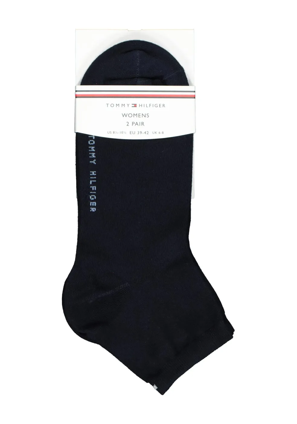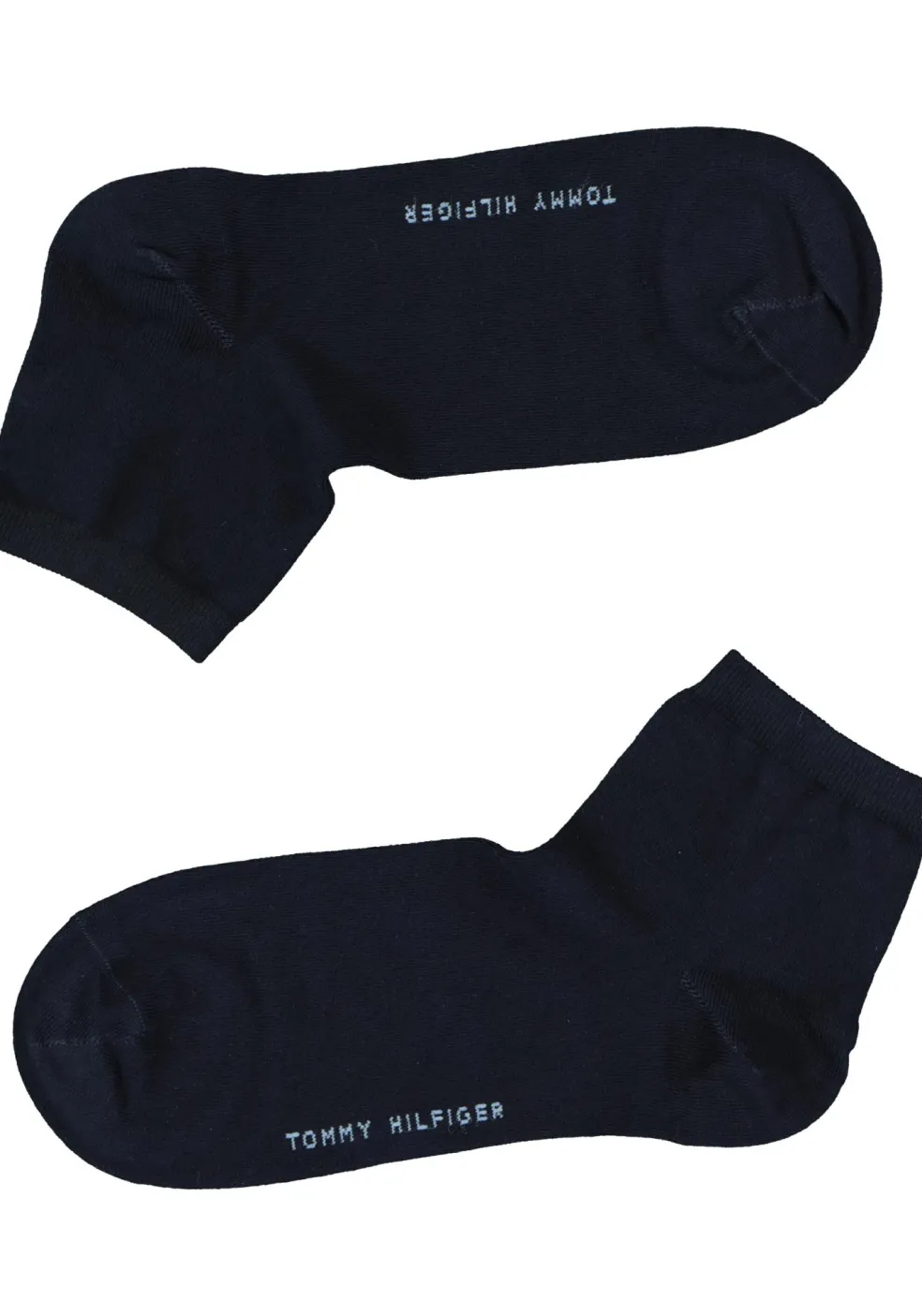 Twee paar navy blauwe Tommy Hilfiger korte damessokken in een stretchkatoenmix sokken met smalle ribgebreide boordjes. De sokken in een normale dikte komen tot net over de enkel, ze zijn dus hoger dan enkelsokken, maar lager dan normale sokken. Het Tommy Hilfiger logo ontbreekt ook niet op deze ideale set voor iedere dag. Deze middelhoge damessokken zijn in verschillende kleuren te bestellen.