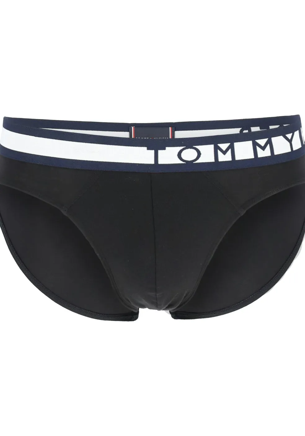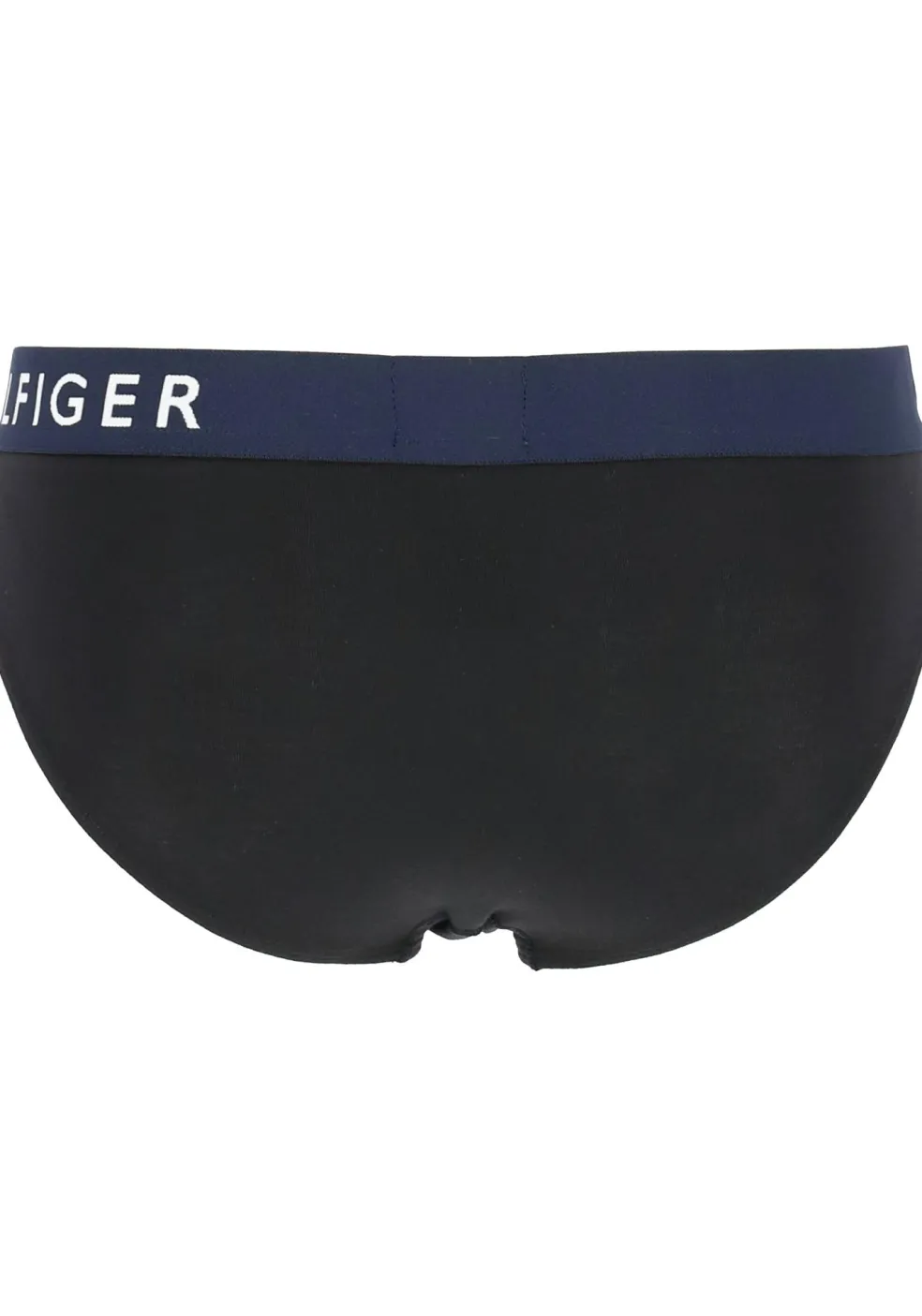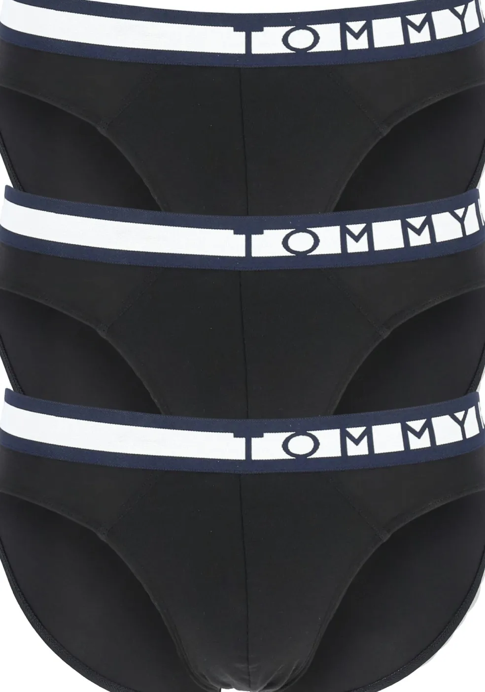 Drie zwarte slips zonder gulp van Tommy Hilfiger. Het katoenen model heeft een tailleband met daarop Tommy in het donkerblauw op een witte ondergrond en een blauwe boven- en onderrand. Dit model draagt comfortabel en door de iets hoger opgesneden onderkant geeft het voldoende bewegingsvrijheid voor elke gelegenheid. De slip ademt en absorbeert, de voorkant is dubbel uitgevoerd voor extra ondersteuning.